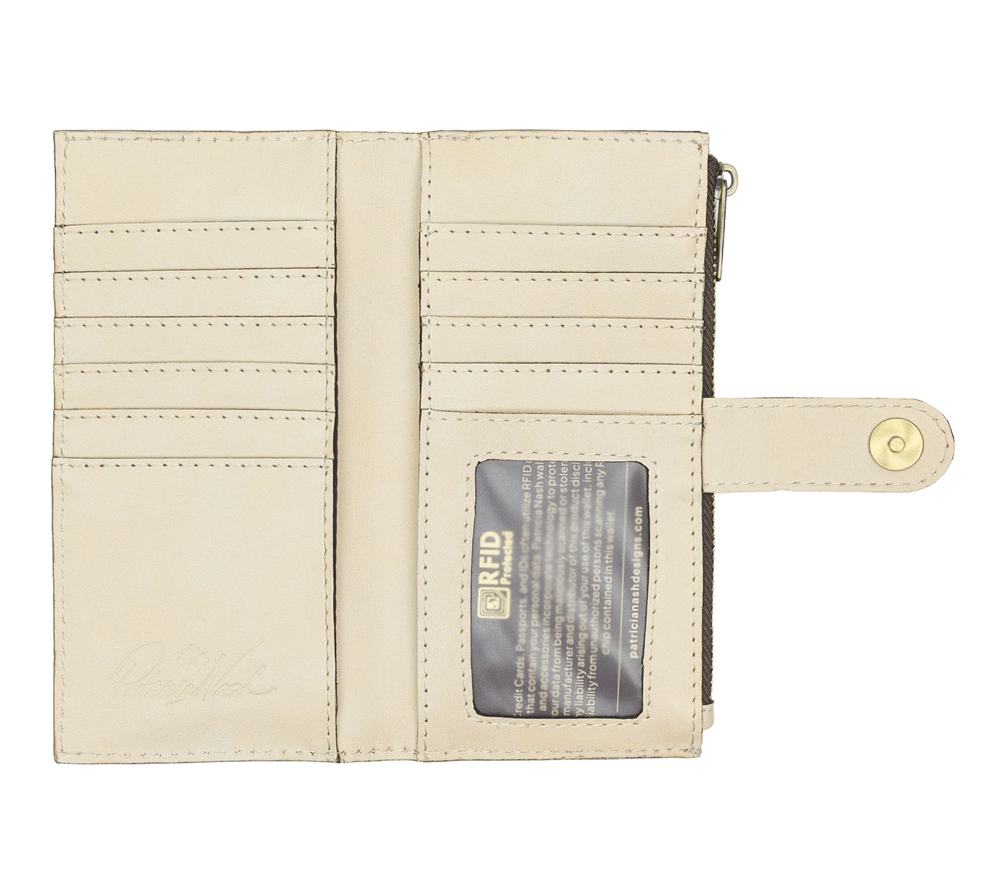 • Lined interior, 10 credit card slots, ID window, two bill pockets, zip coin pocket