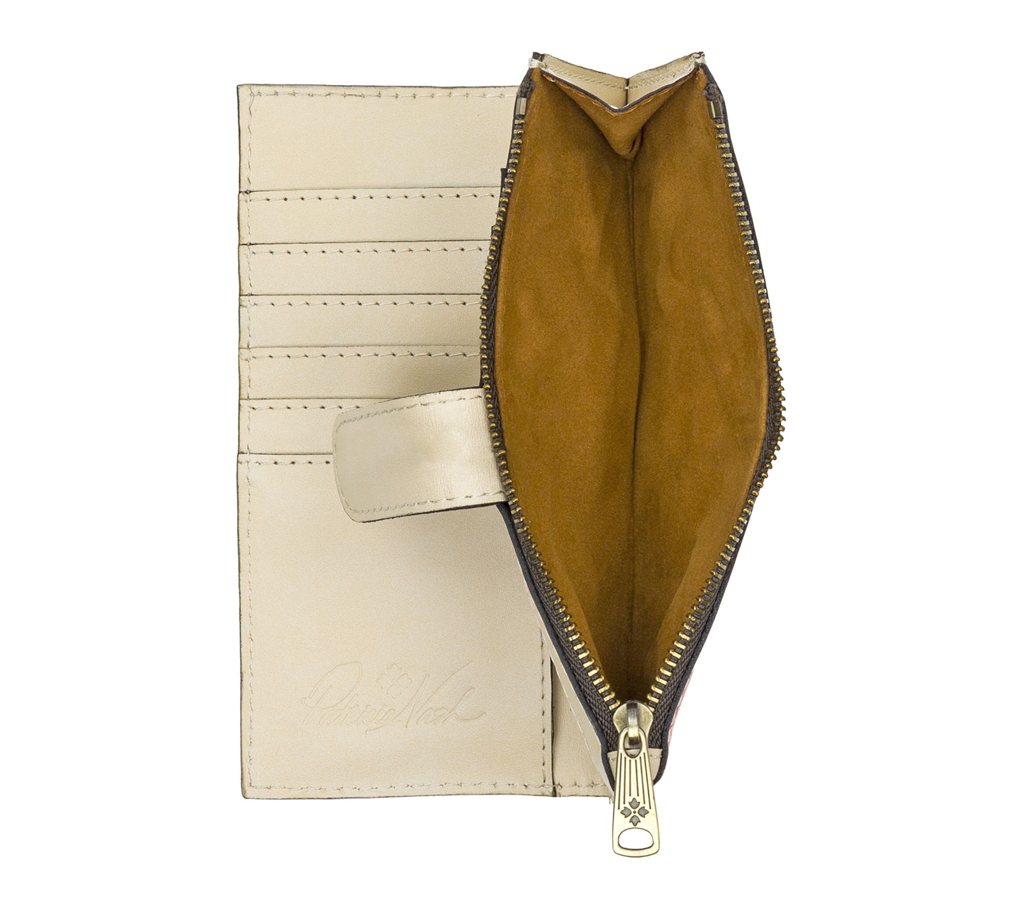 Discover classic elegance and everyday practicality with the Patricia Nash Nazari bifold wallet. Crafted from full-grain calf leather, this wallet boasts a sleek, lightweight design that effortlessly combines style and functionality. The signature deep embossed grape leaf floret logo and brushed brass hardware add a touch of sophistication, while the burned edge finish enhances its refined look. From Patricia Nash.