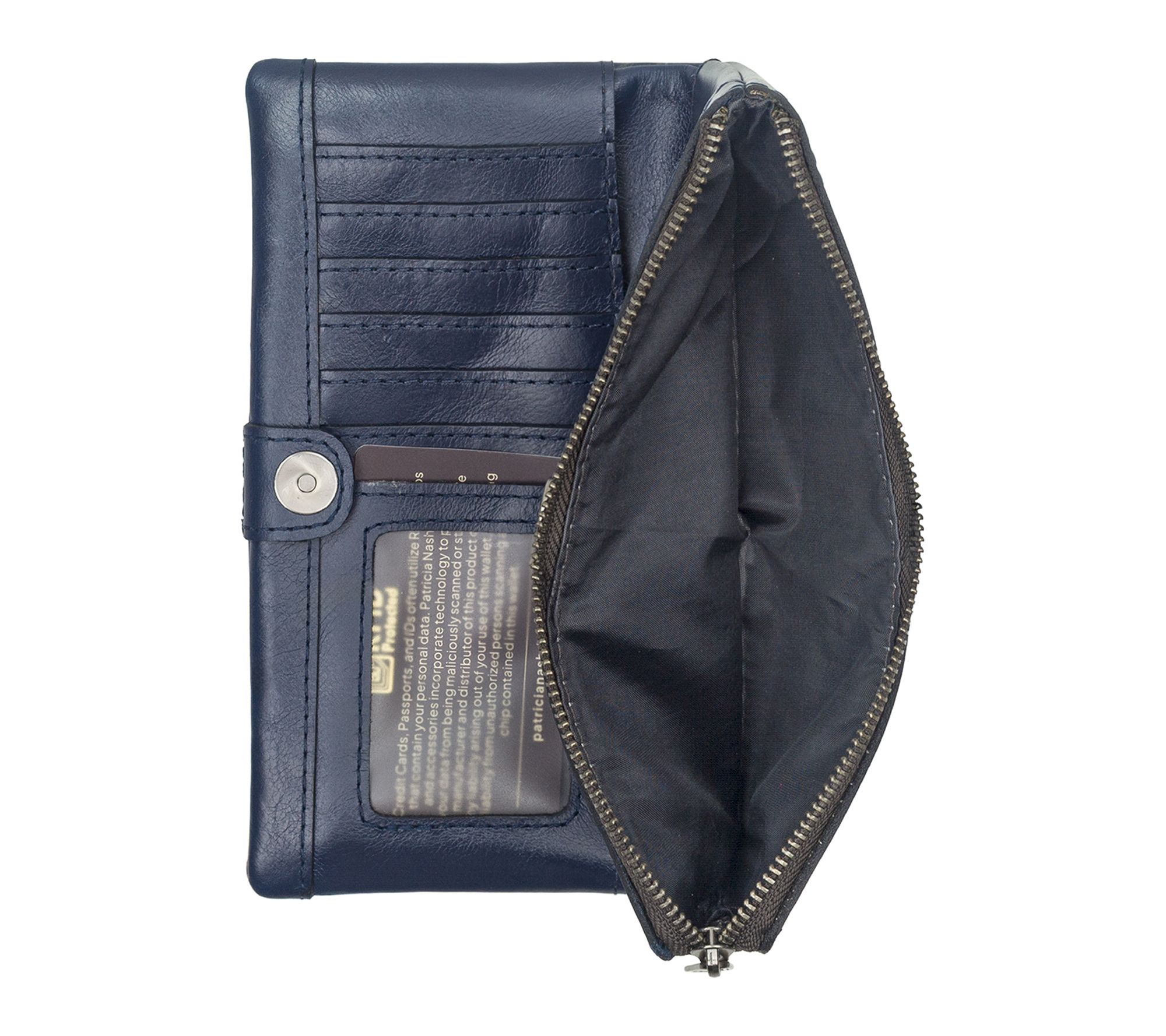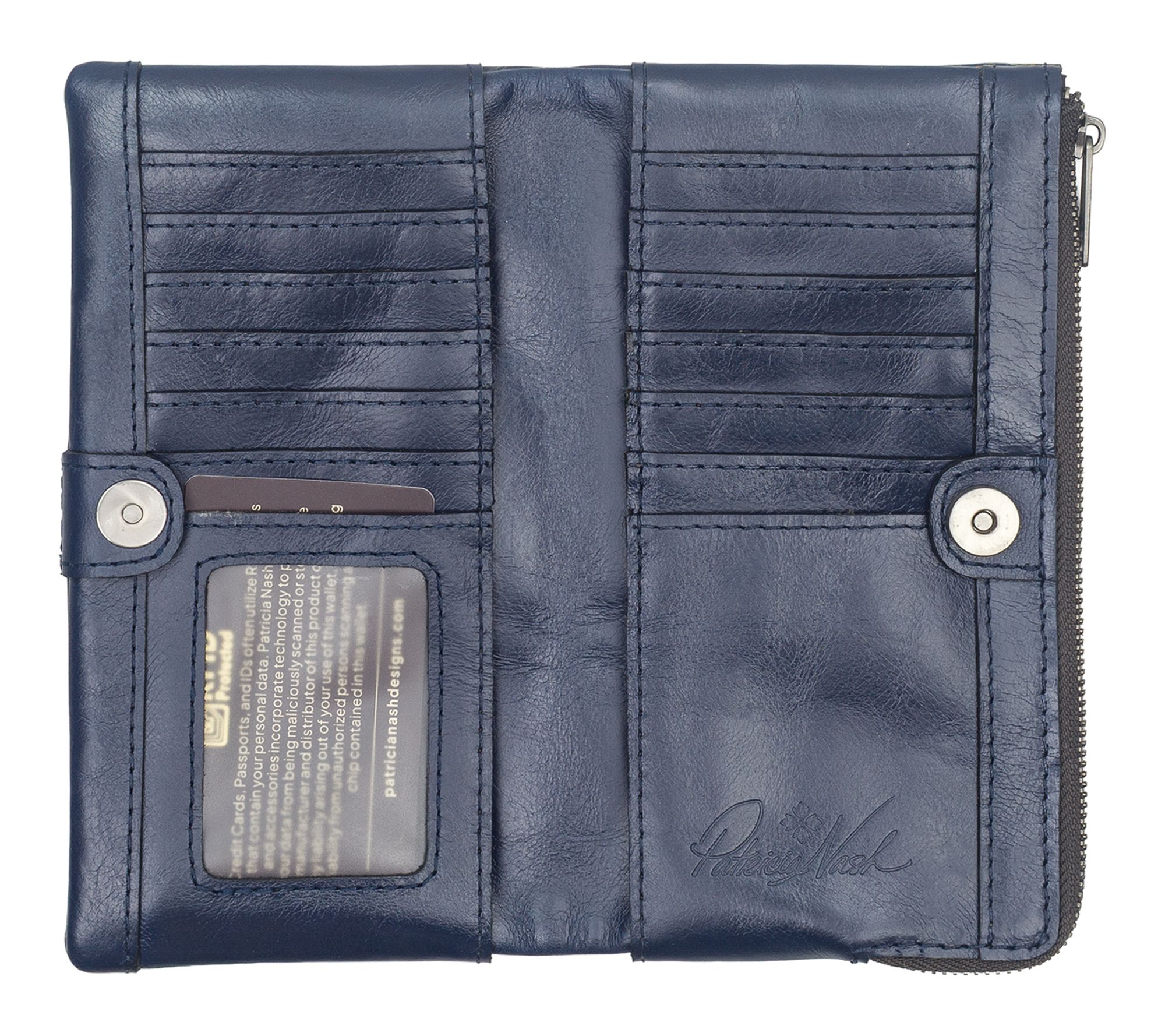 • Interior features 13 credit card slots, 1 ID window, and 2 bill pockets; leather trim and nylon lining