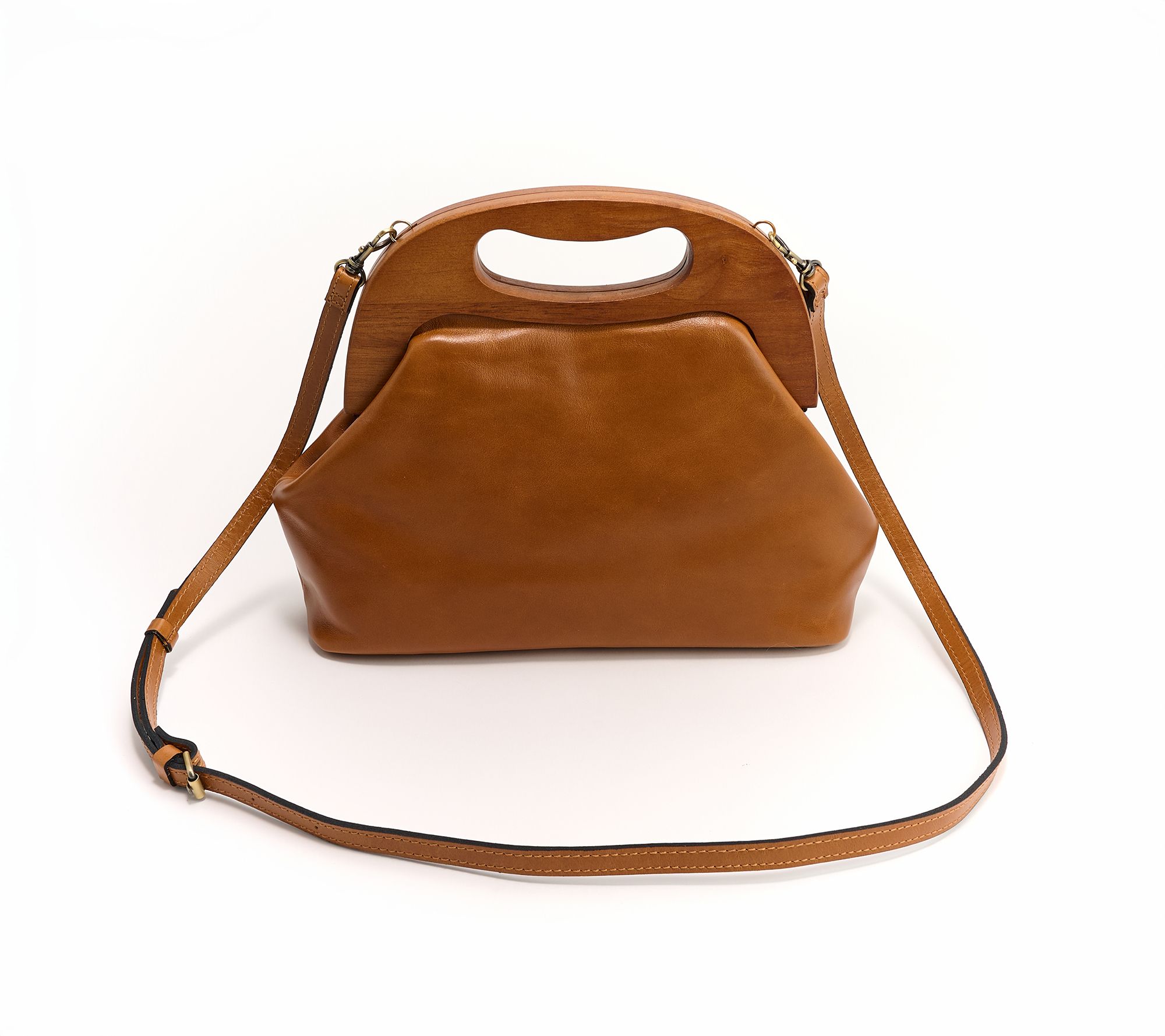 • Wooden frame top handle, magnetic closure, adjustable/removable crossbody strap
