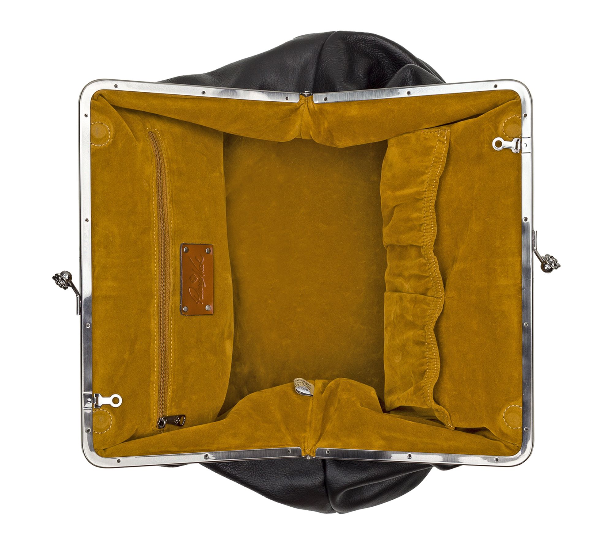 • Twist-lock closure, detachable and adjustable single strap, classic brushed metal hardware, burned edge finish, exterior rear zip pocket