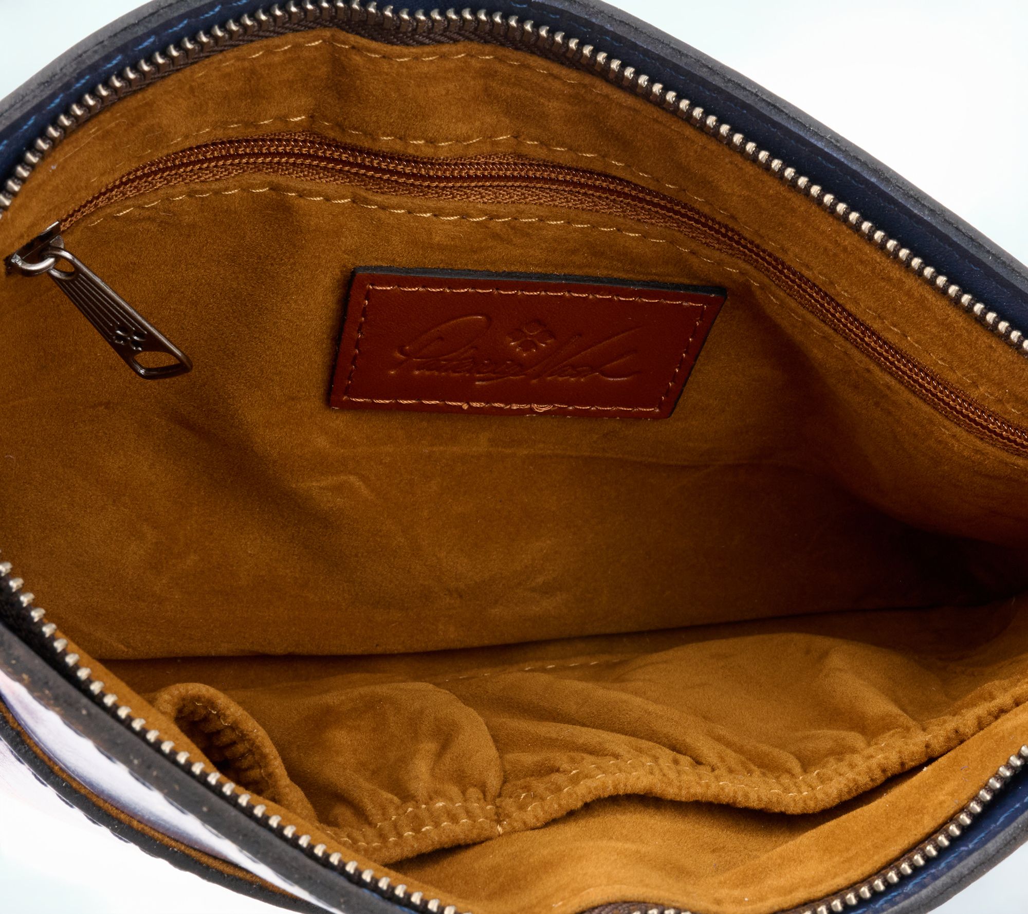 • Faux suede lining, two front slip pockets, rear zip pocket