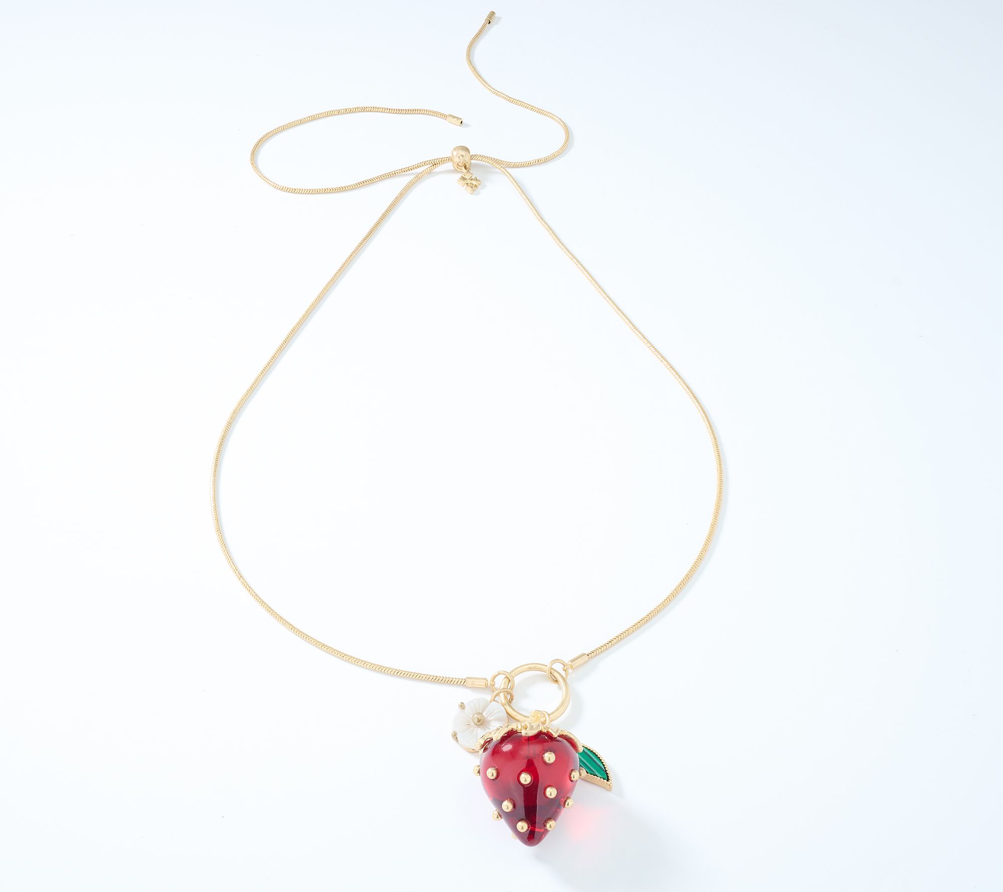 Farm-to-fashion is having a moment! Get in on it with this juicy strawberry pendant necklace that creates a playful focal point for casual tees or date-night dresses. A glossy mother-of-pearl flower and vibrant leaves add charm, while the adjustable chain lets you find your ideal length. From Patricia Nash.