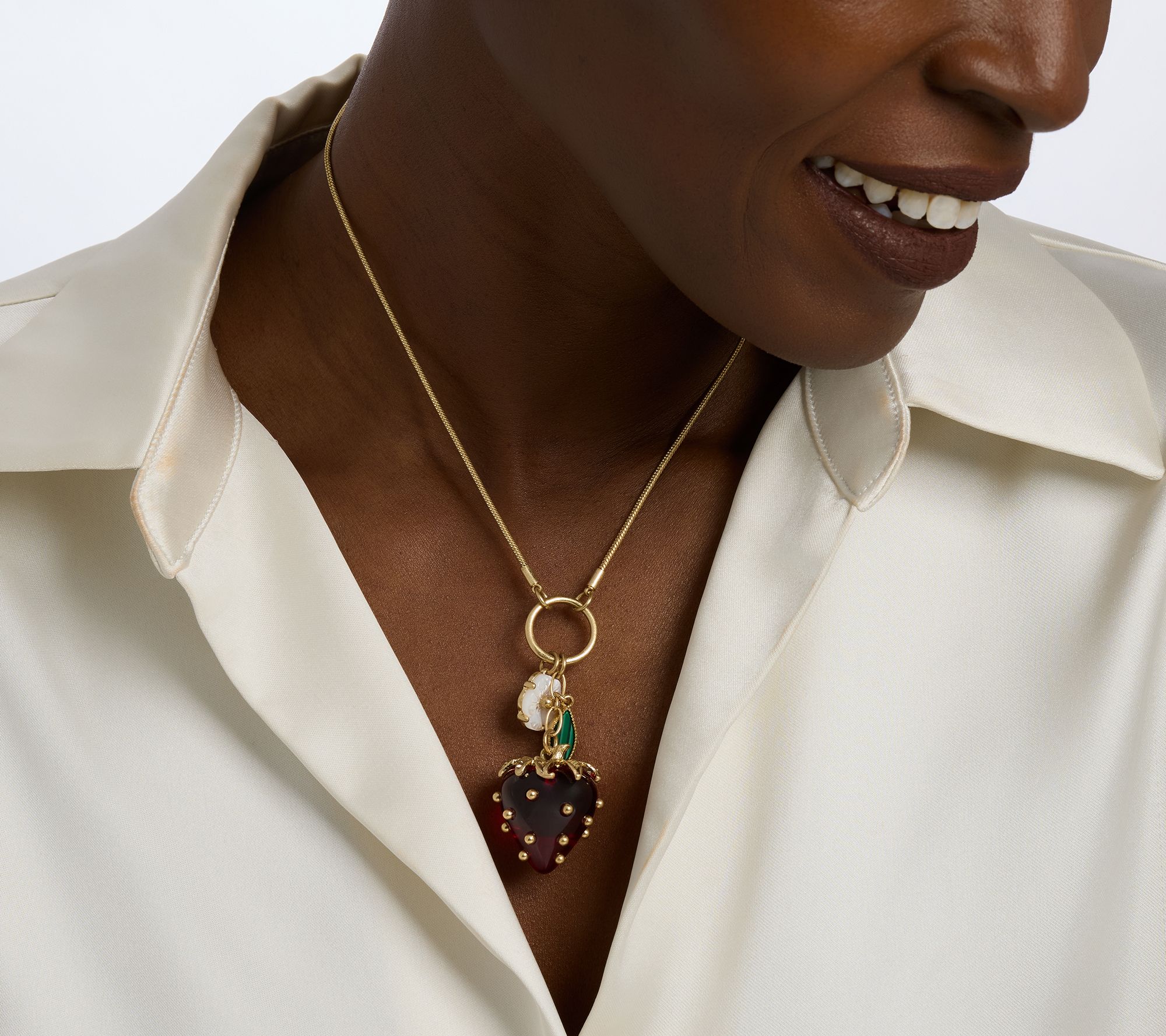 • Strawberry motif on O-ring; mother-of-pearl flower and leaf designs; resin, reconstituted stone, and cubic zirconia details; adjustable chain on a slider