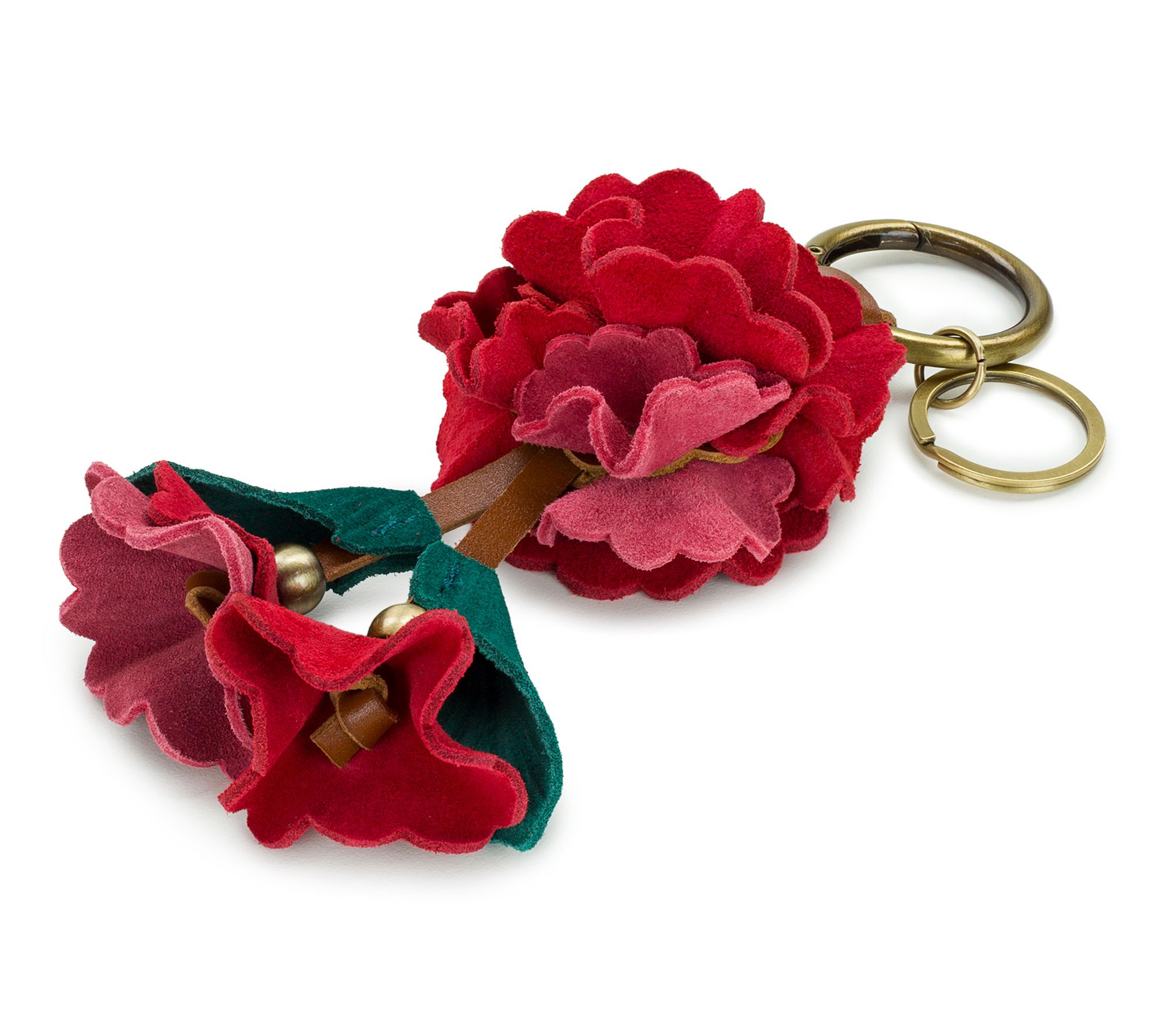 • Features textured suede petals, leather leaves, signature brushed brass hardware, quick-release ring, and slide-on key ring