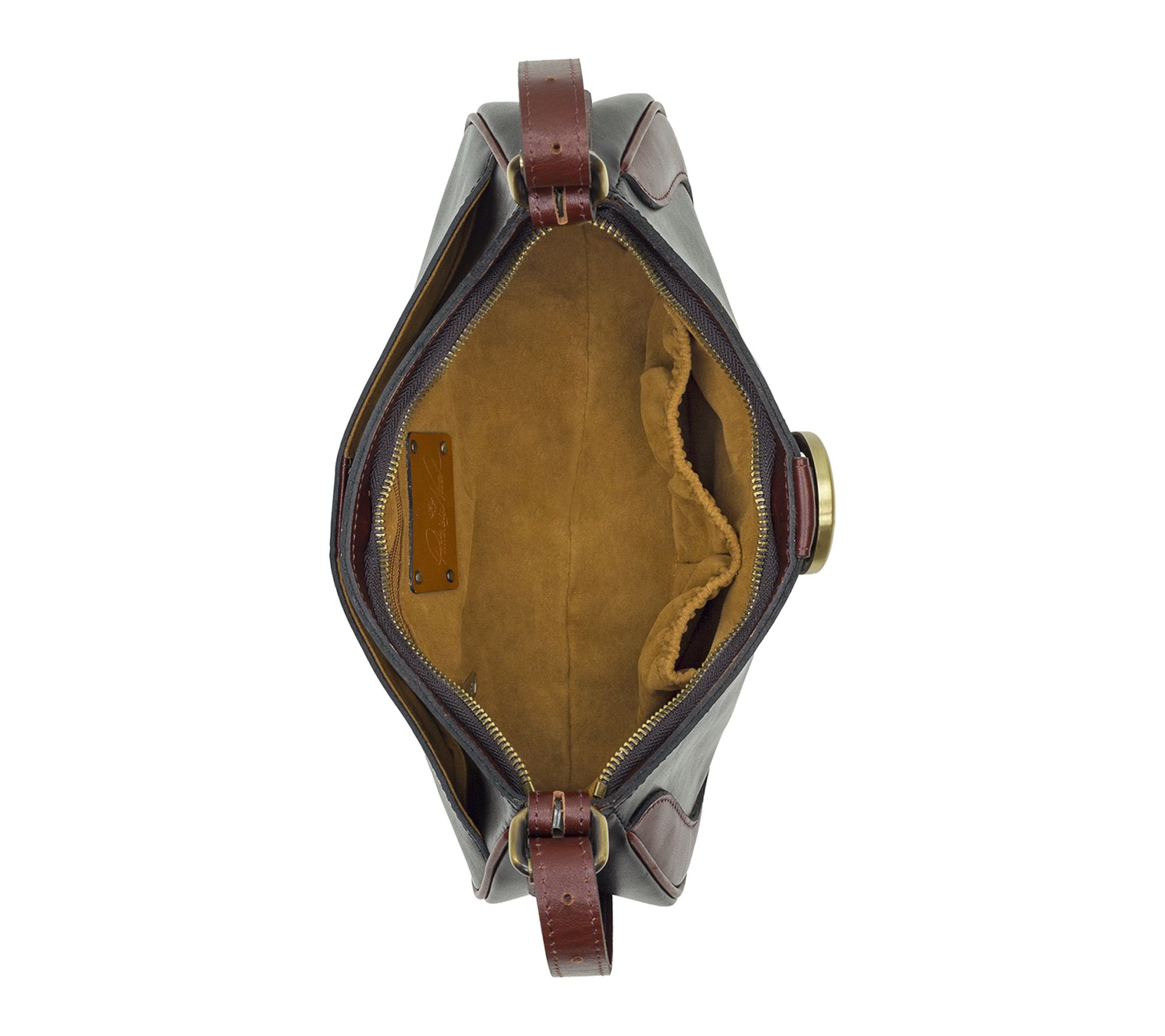 • Magnetic snap closure; adjustable, detachable single strap; front and rear slip pockets; rear zip pocket; signature brushed brass hardware; burned edge finish
