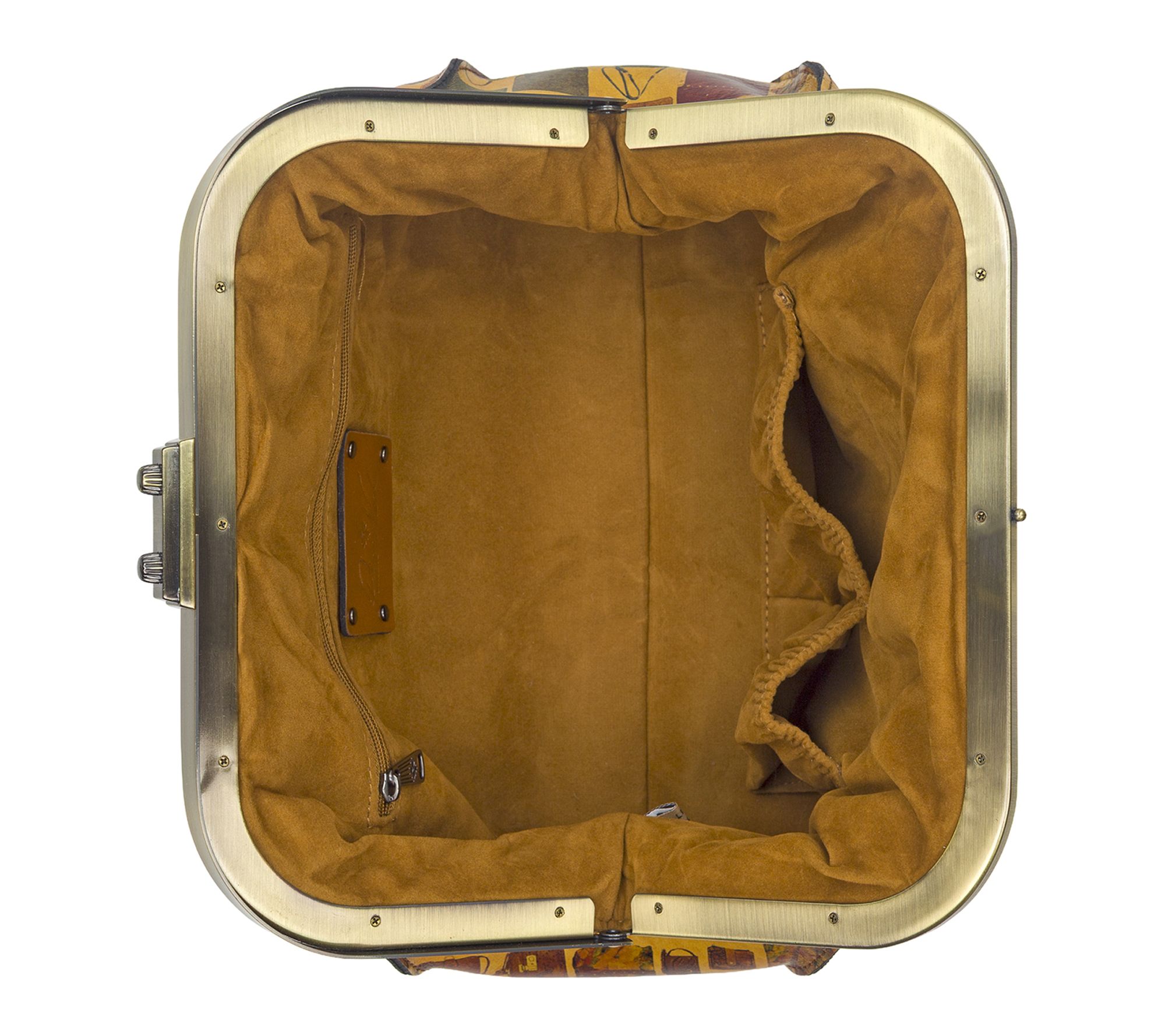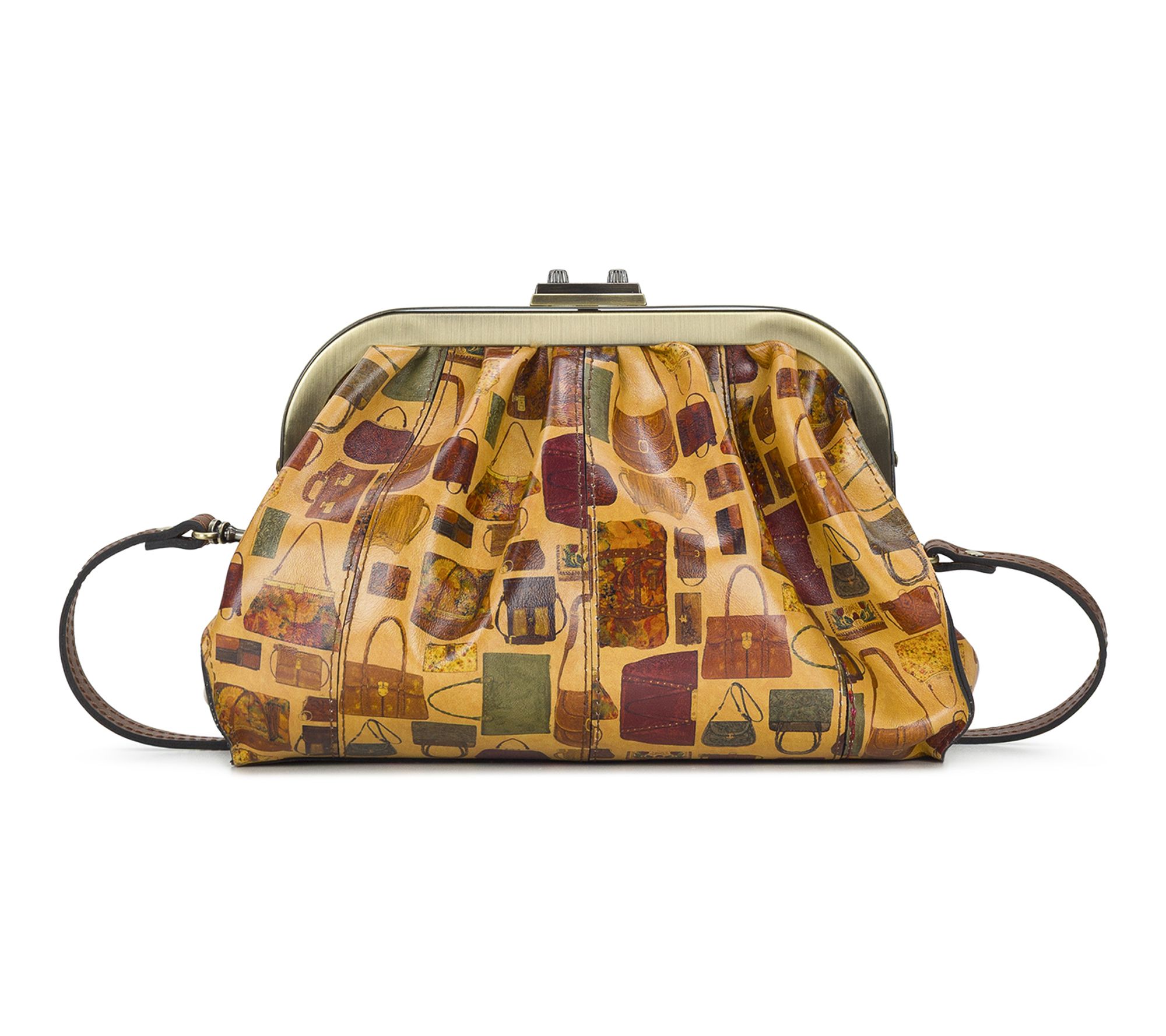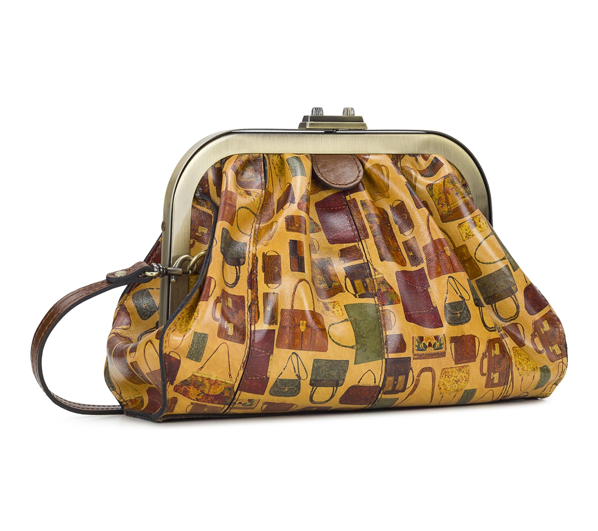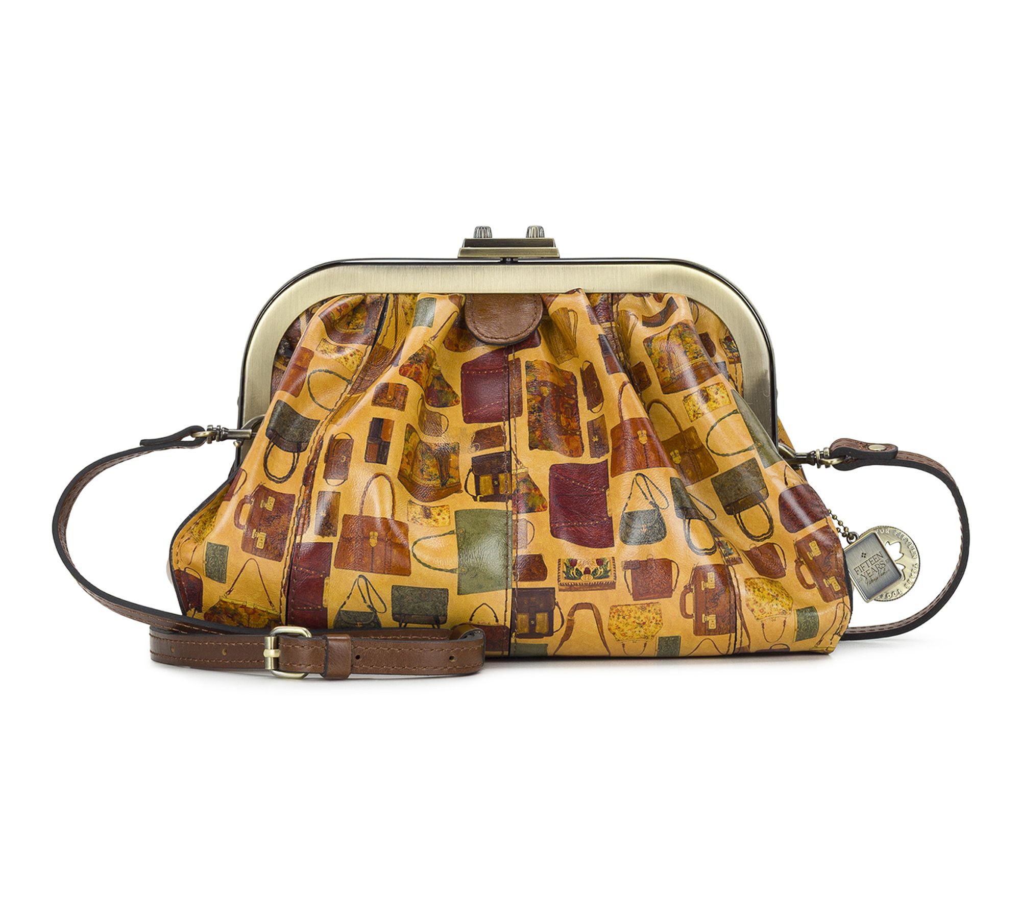 Turn heads on every outing with this frame satchel, flaunting Patricia's Closet print and adorned with exclusive 15th anniversary medallions. Luxurious full-grain leather and signature brushed brass hardware add sophistication, while the practical compartments inside keep essentials neatly organized, day or night. From Patricia Nash.