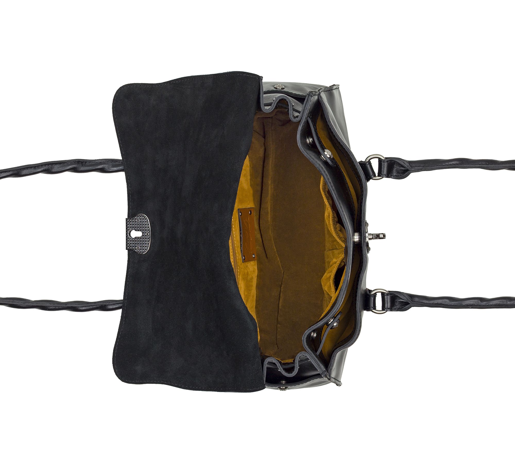 • Exterior features twist-lock closure, double handles, detachable strap, slip pocket under front flap, side pockets with magnetic snap closures, rear slip pocket, burned edge finish, signature brushed nickel hardware