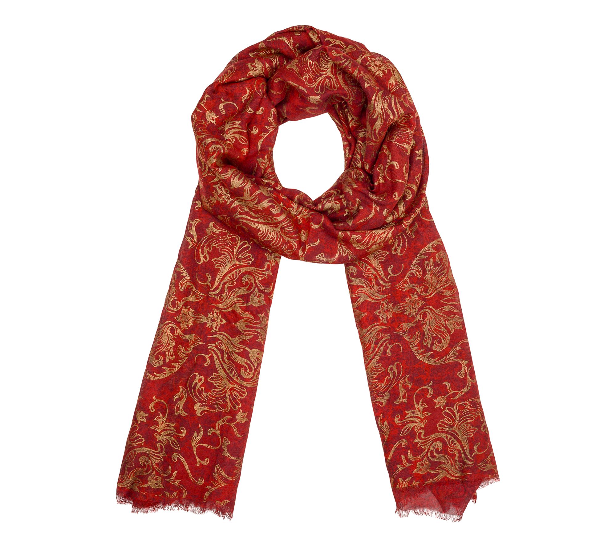 Add a touch of sophistication to any casual outfit or professional look with this lightweight scarf. The eye-catching print and fringe edges make it perfect for layering over a blouse or a dress. From Patricia Nash.