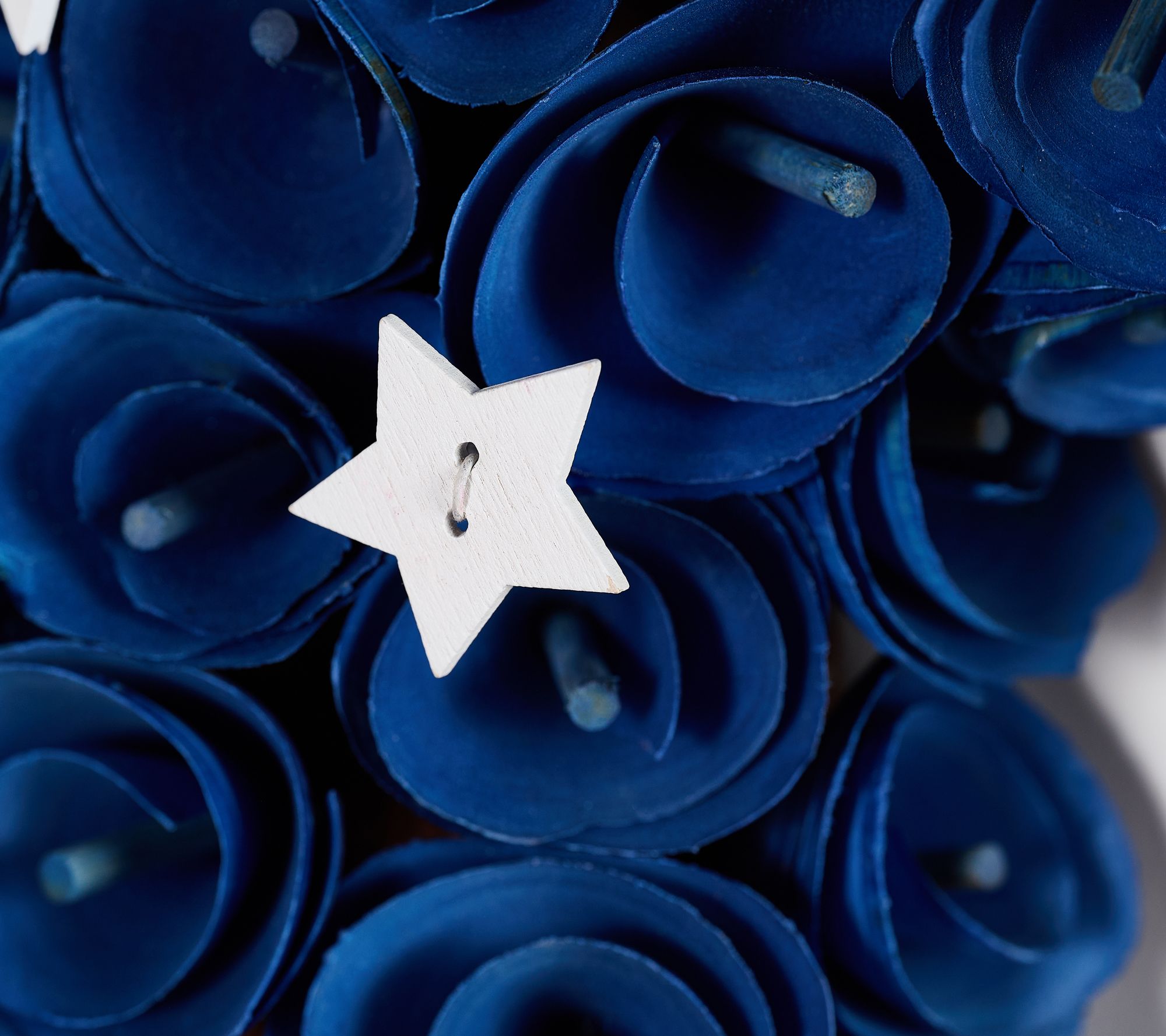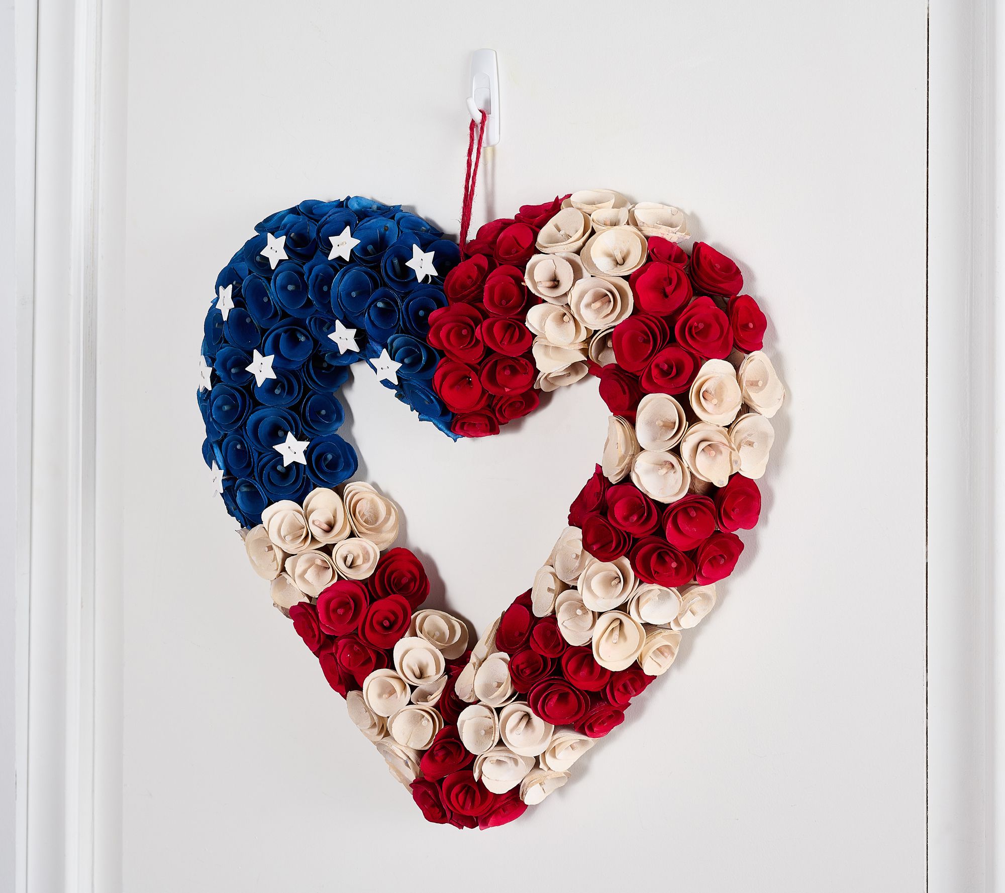 • Heart-shape wreath of wood curls in red, white, and blue flag design; mini stars