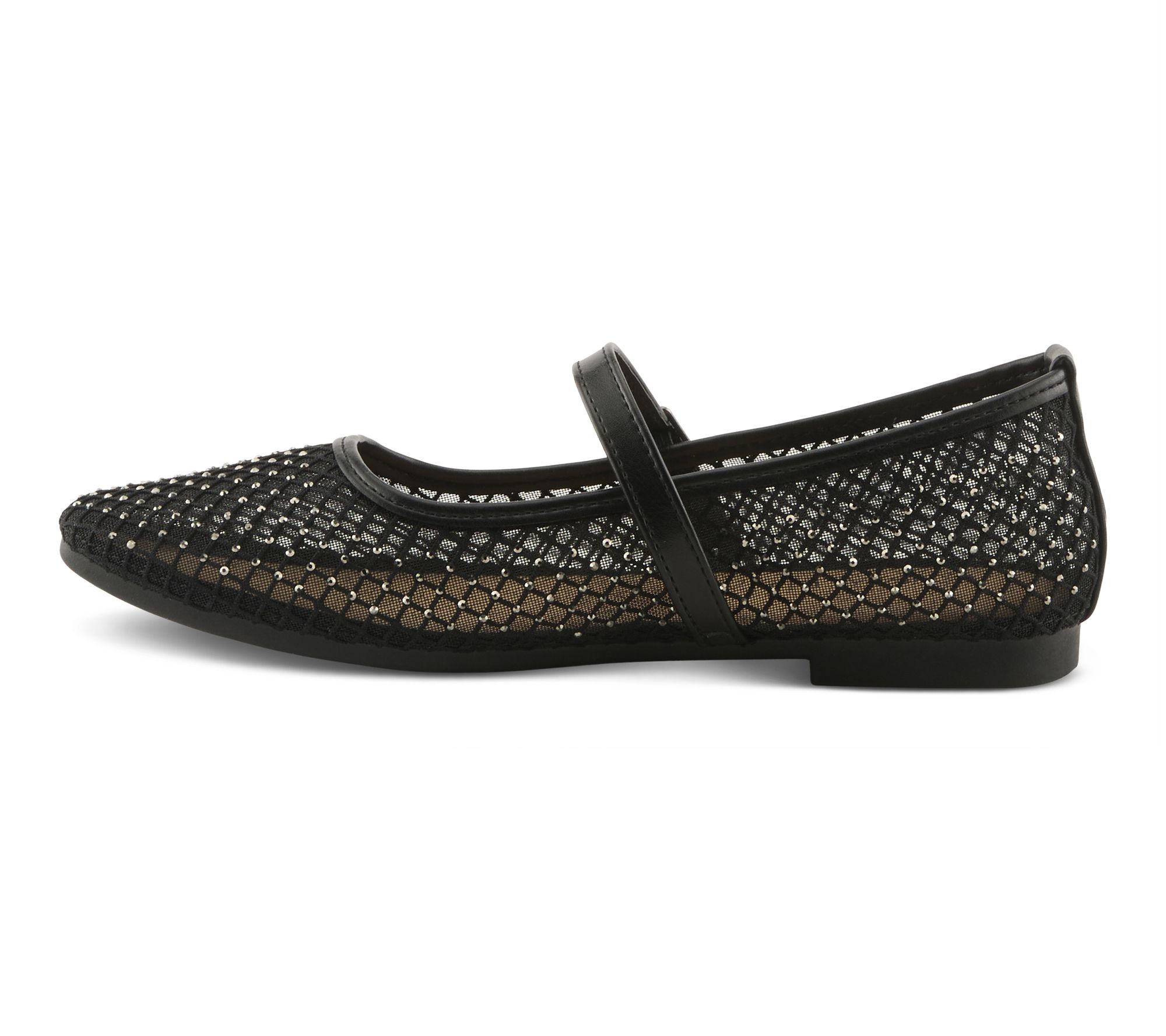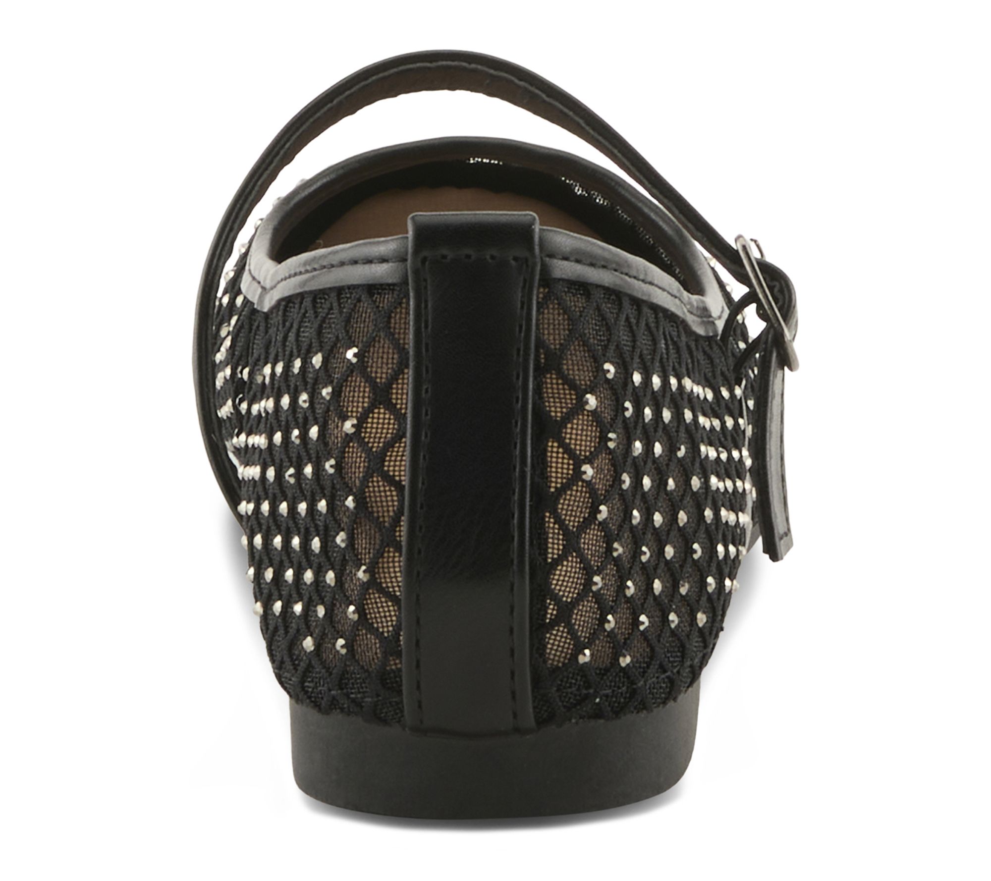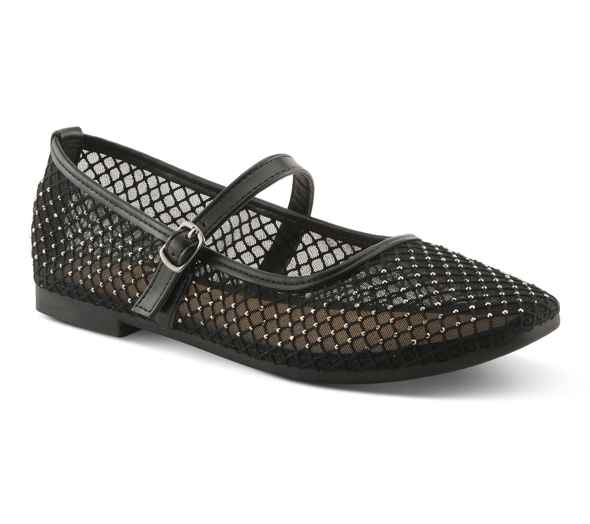 • Ballet Mary Jane silhouette with mesh upper, mini crystal sparkles, and rounded toe; adjustable strap with buckle closure