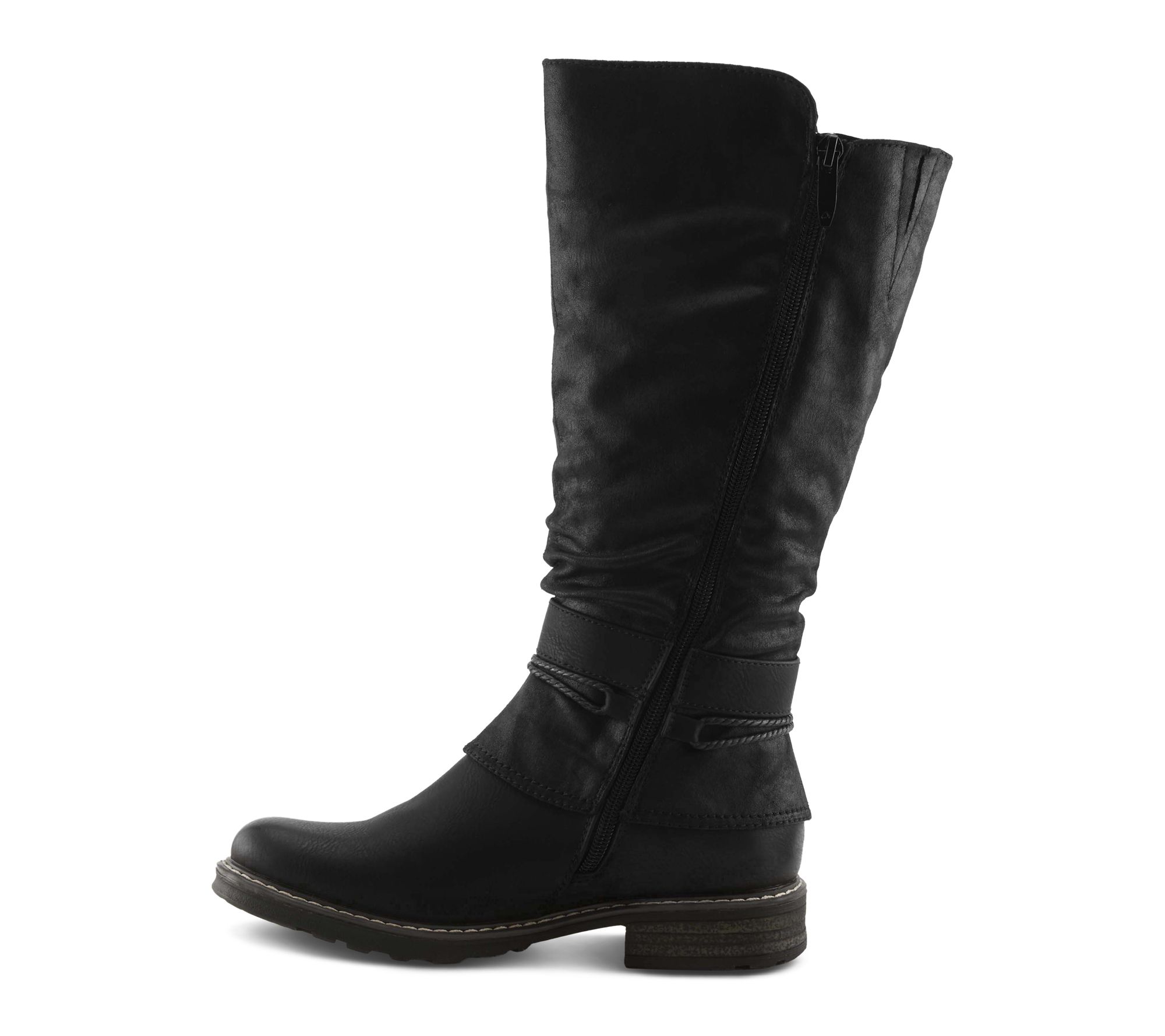 Slouchy extended-calf tall boot with adjustable decorative buckle strap, burnished upper, hooded design, inside zipper closure, and rounded toe