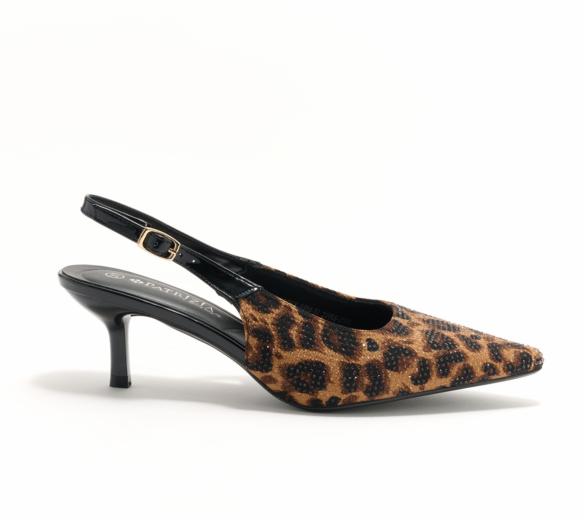 Heads will turn. Glittering mini crystals shimmer on these embellished sling back pumps, ready and willing to shine at weddings, social soiress, or evenings out. The adjustable strap offers a personalized fit, while a modest kitten heel gives just enough height without the hurt. From Patrizia by Spring Step.