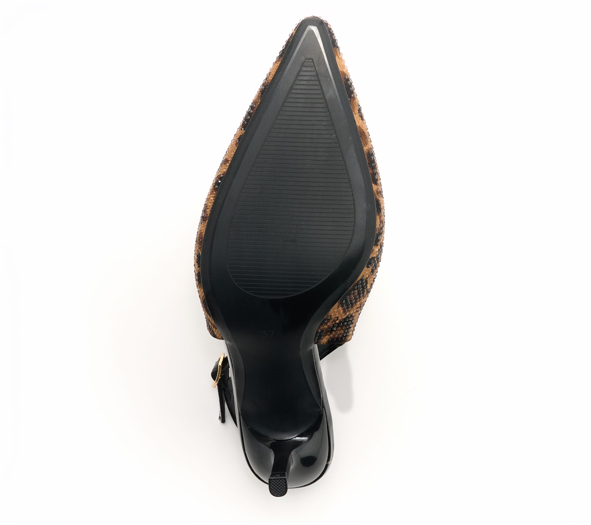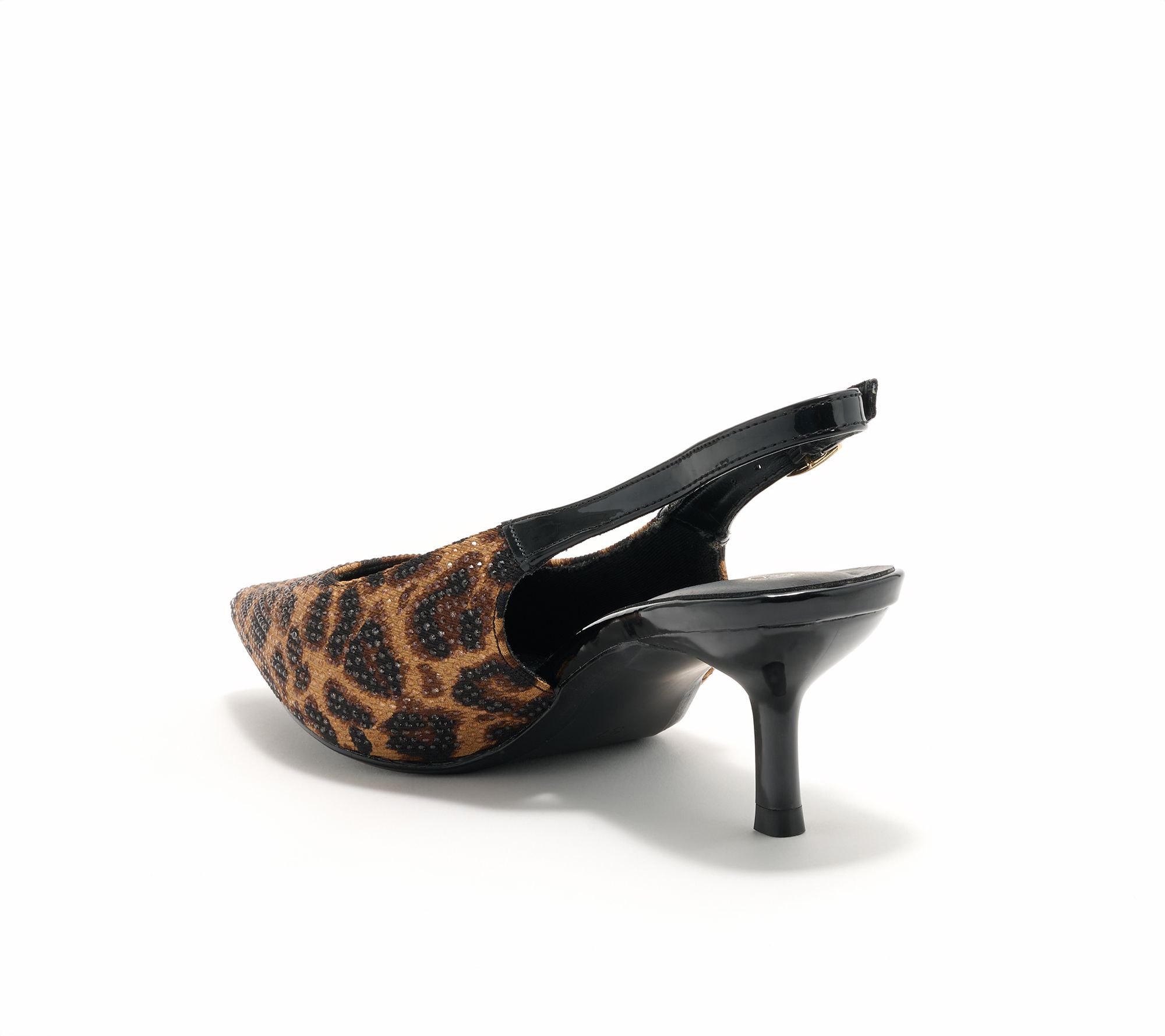 Sling back style, embellished with colorless mini crystals, pointed toe, adjustable strap