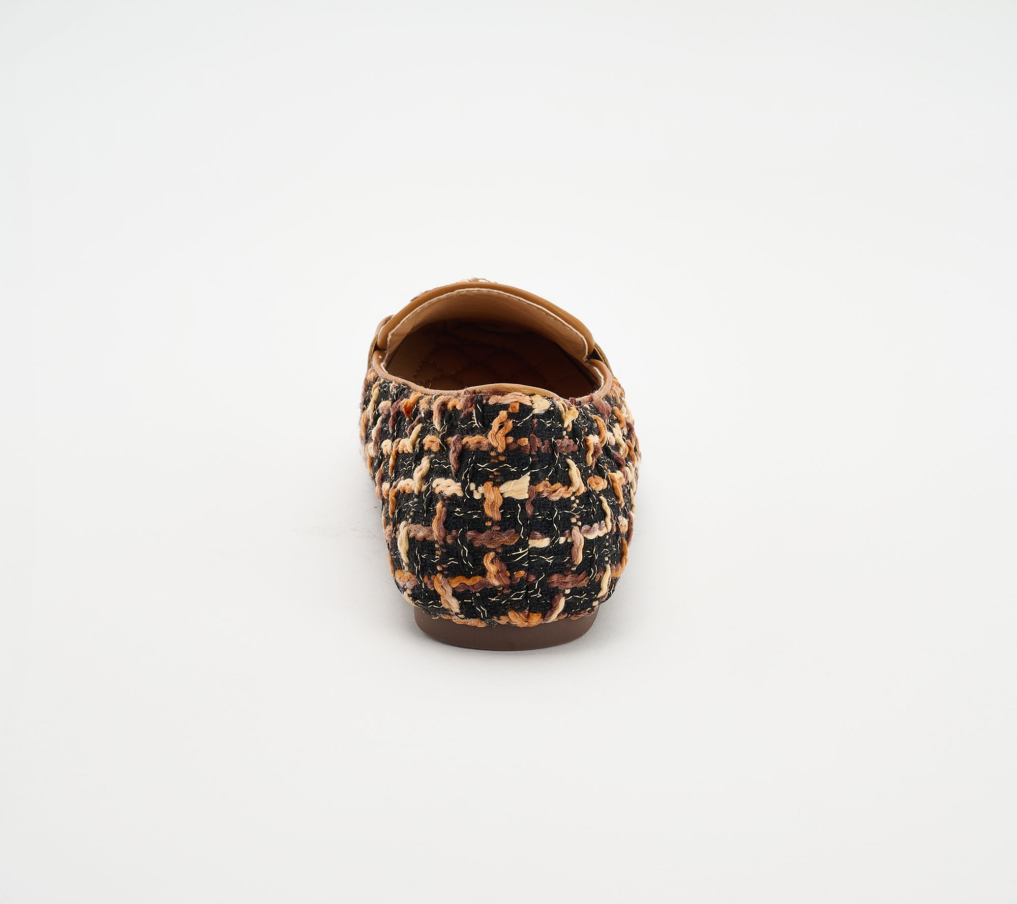 Boucle material, polished goldtone chain hardware, tonal piping on vamp and topline