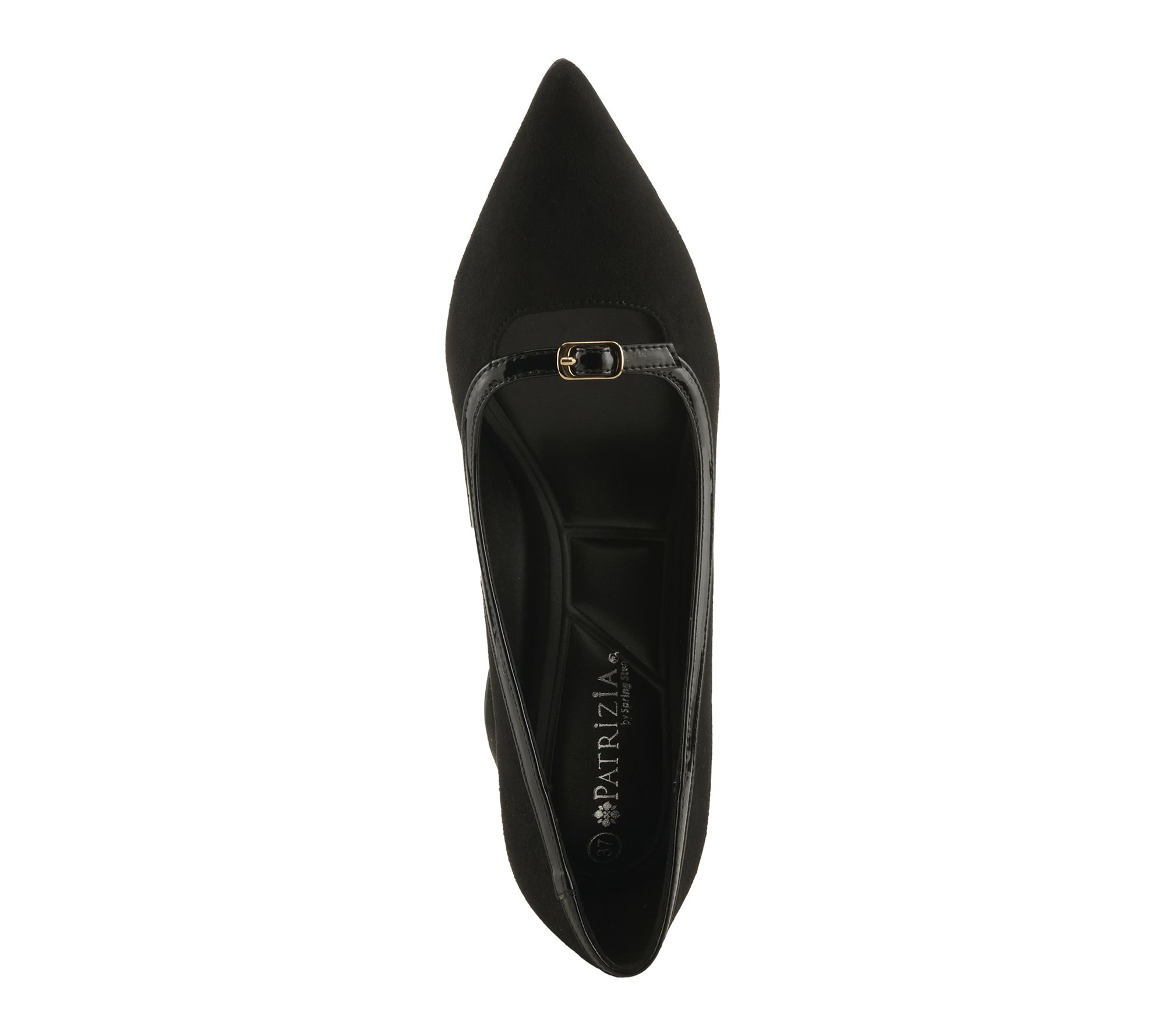 Slip-on pointed toe design with glossy patent trim and buckle detail