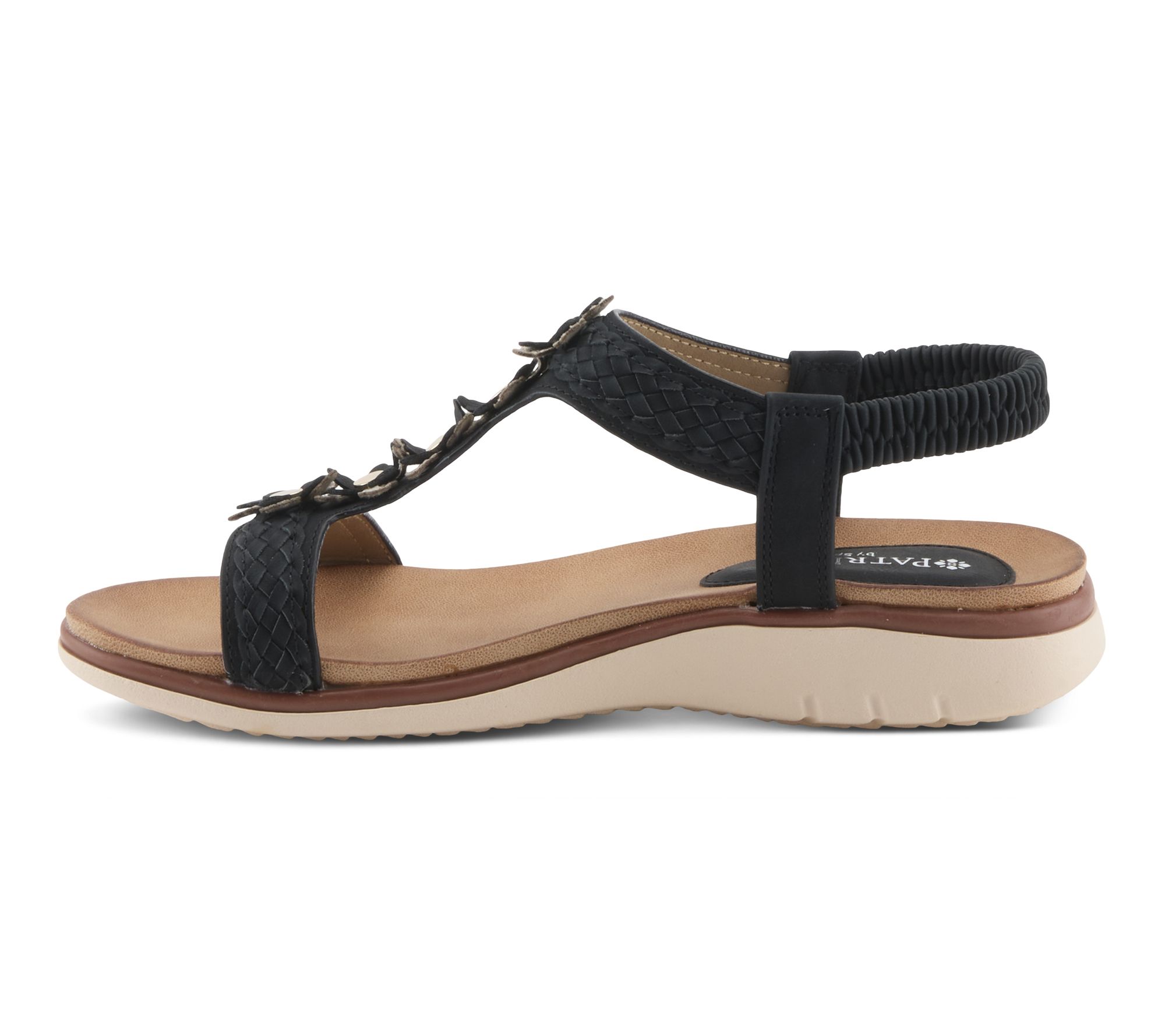 • T-strap slip-on sandal with floral appliques, braided detailing, rounded toe, elastic backstrap for easy adjustability