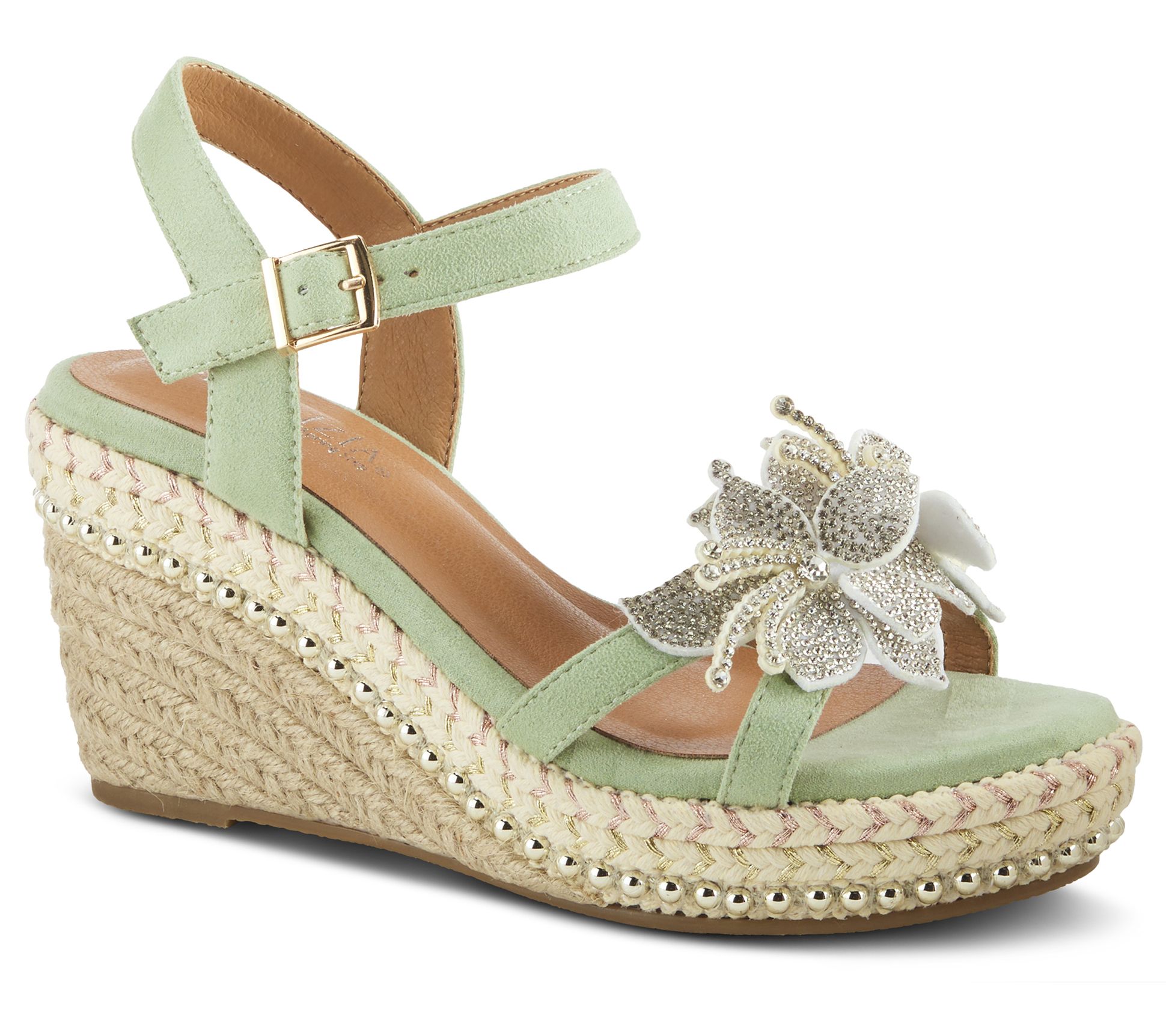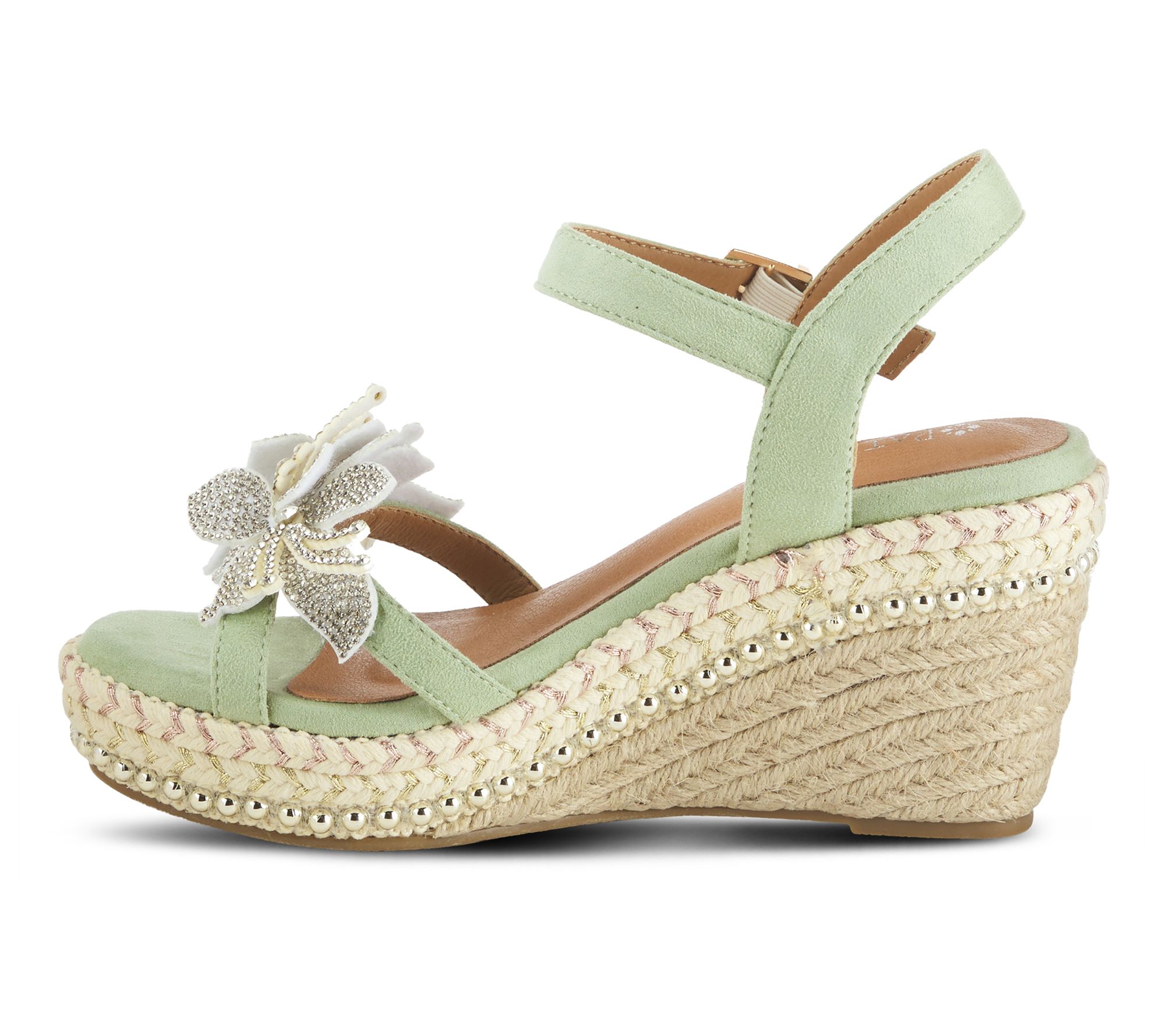 • Buckle closure, espadrille platform wedge, rhinestone flower accent, silvertone beaded details, rounded toe
