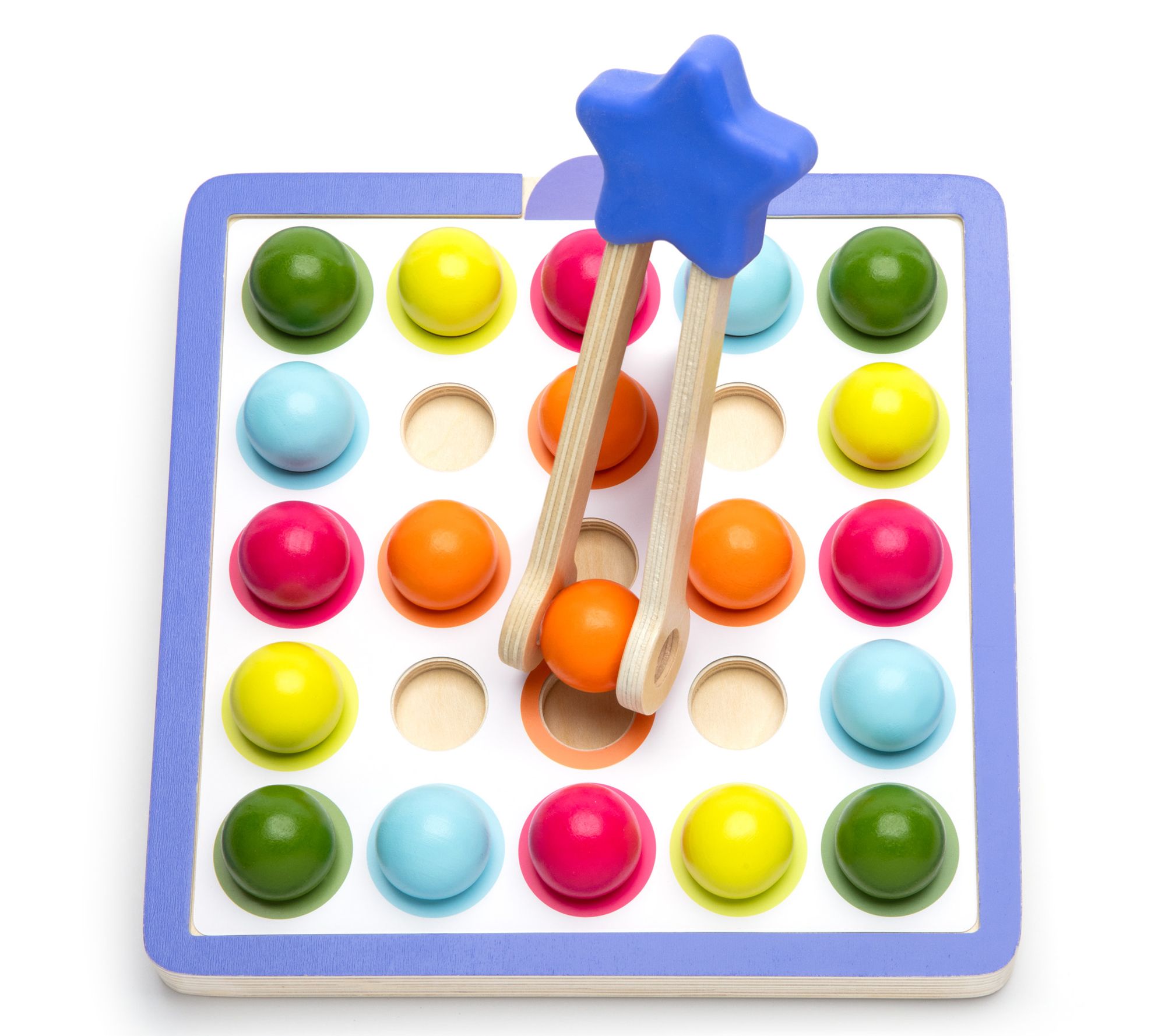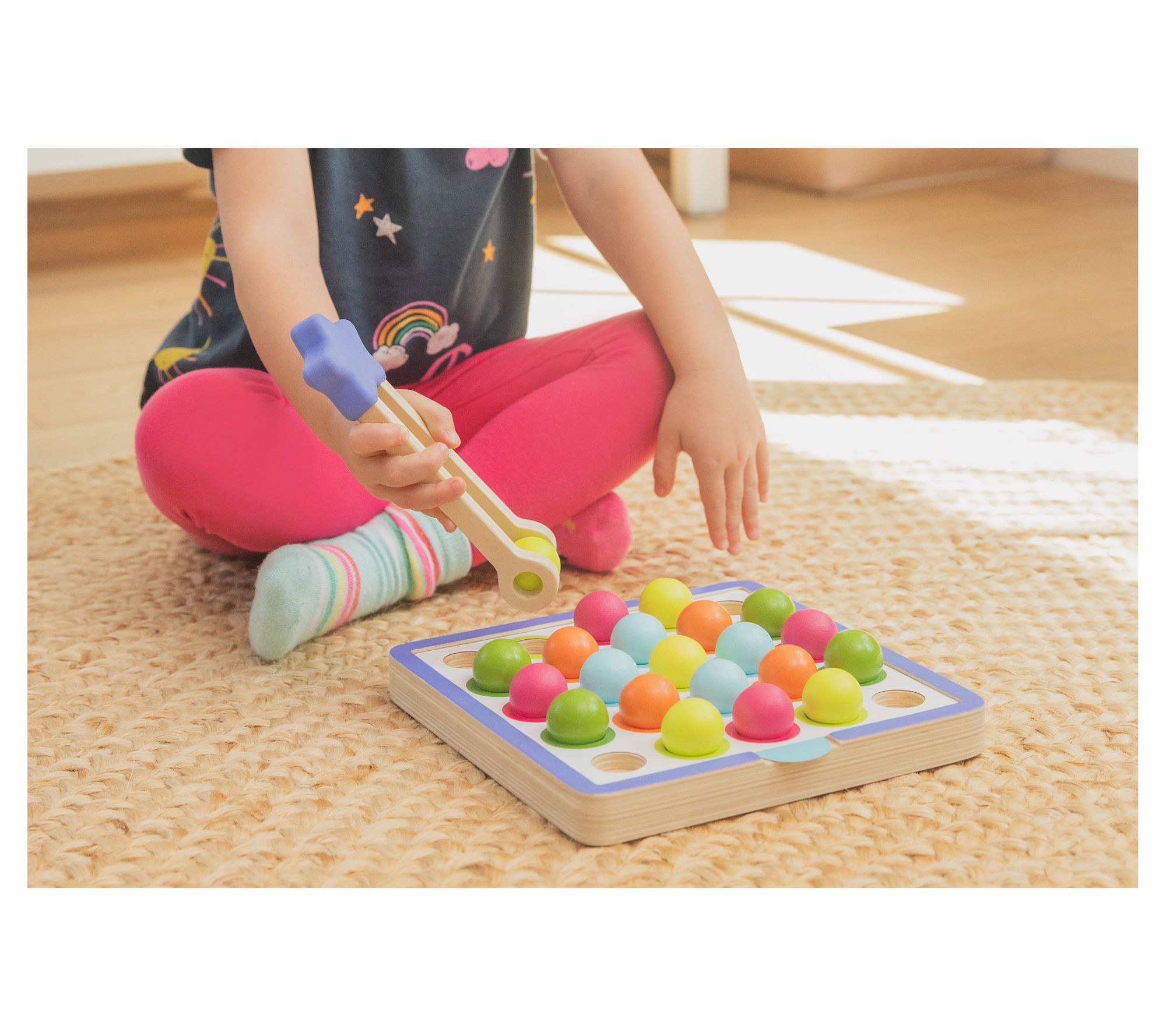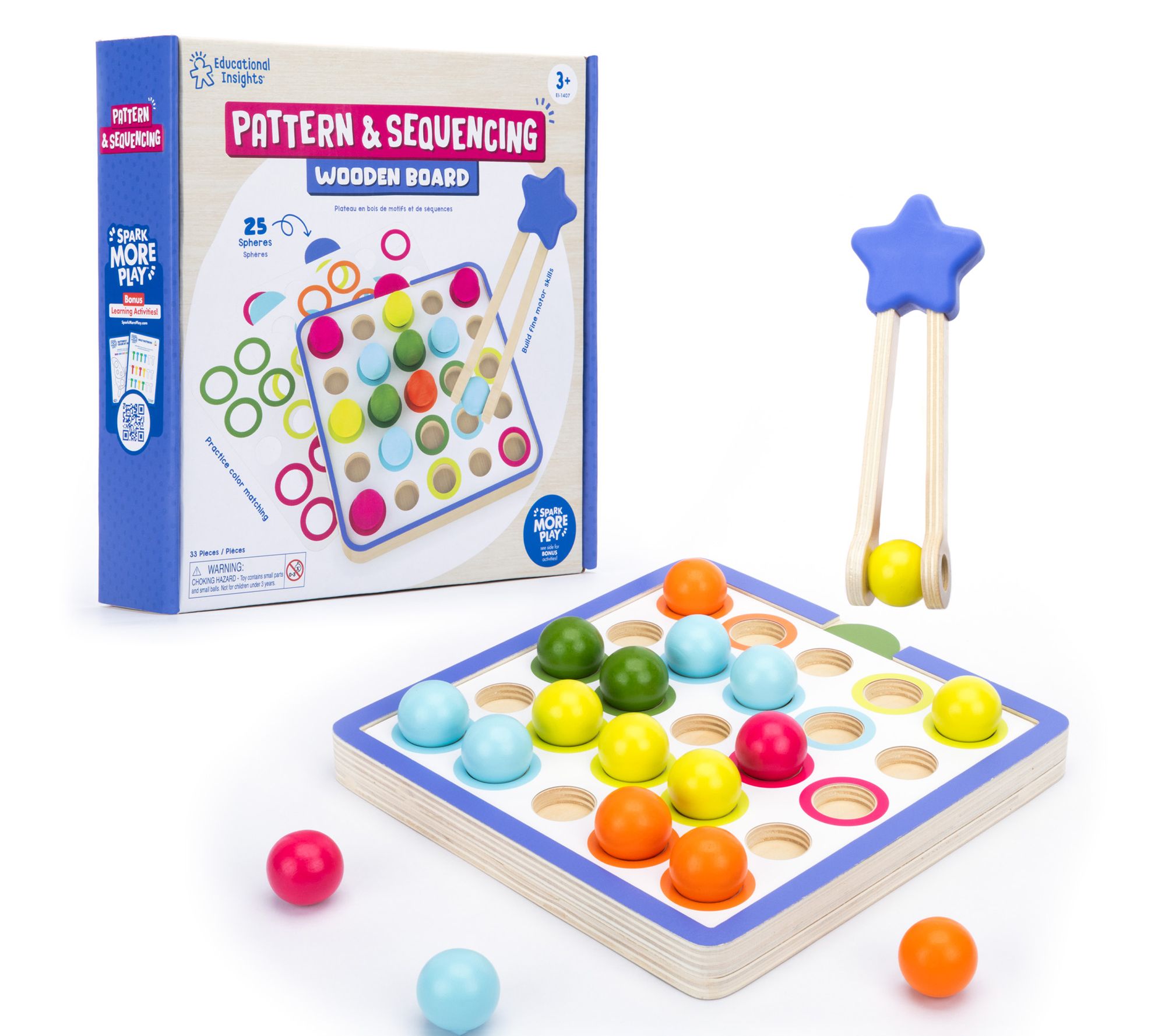 Imagine the excitement of your child as they use the Easy Tweezies wooden squeezers to arrange colorful spheres on the board. This engaging set is perfect for developing fine motor skills, pattern recognition, and sequencing abilities. With five double-sided pattern cards, they can follow along or create their own unique designs. The included activity guide provides creative ways to play and educational instructions, making learning fun and interactive. From Educational Insights.