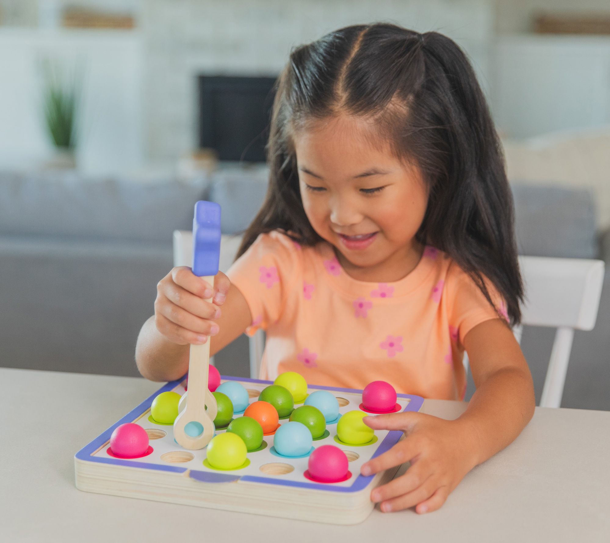 • Includes wooden frame board, five double-sided pattern cards, 25 wooden spheres, Easy Tweezies wooden squeezers, and activity guide
