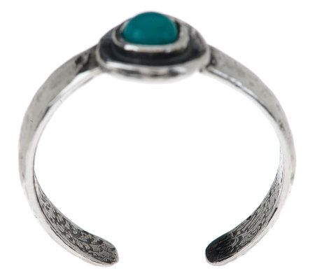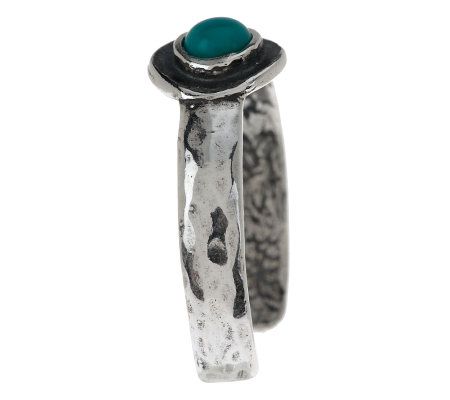 • Adjustable design; oxidized, hammered finish with round gemstone cabochon in bezel-style setting surrounded by wavy frame