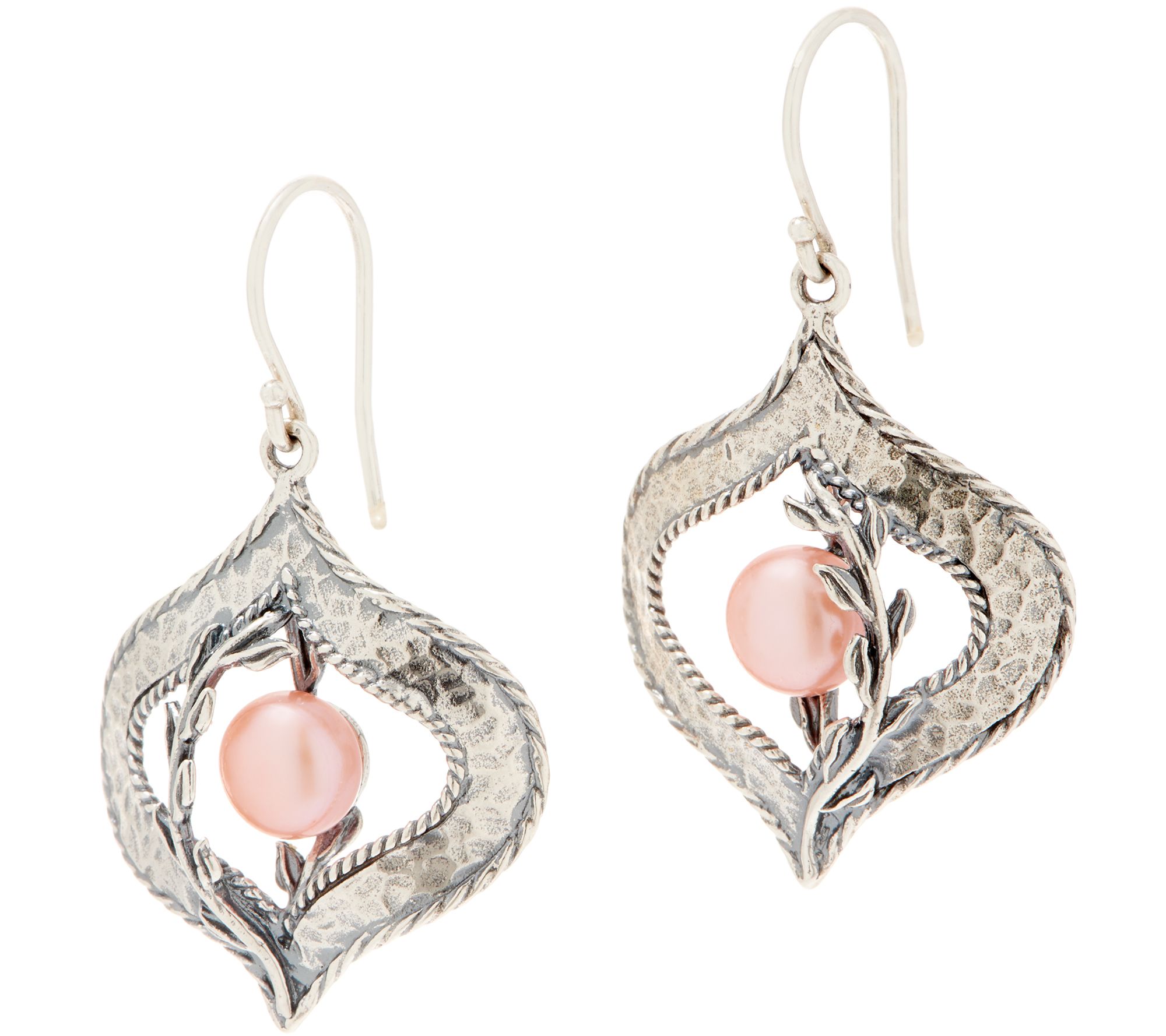 • Open, fancy-shaped, hammered finish frame with textured border; button cultured freshwater pearl in center with leaf overlay; oxidized