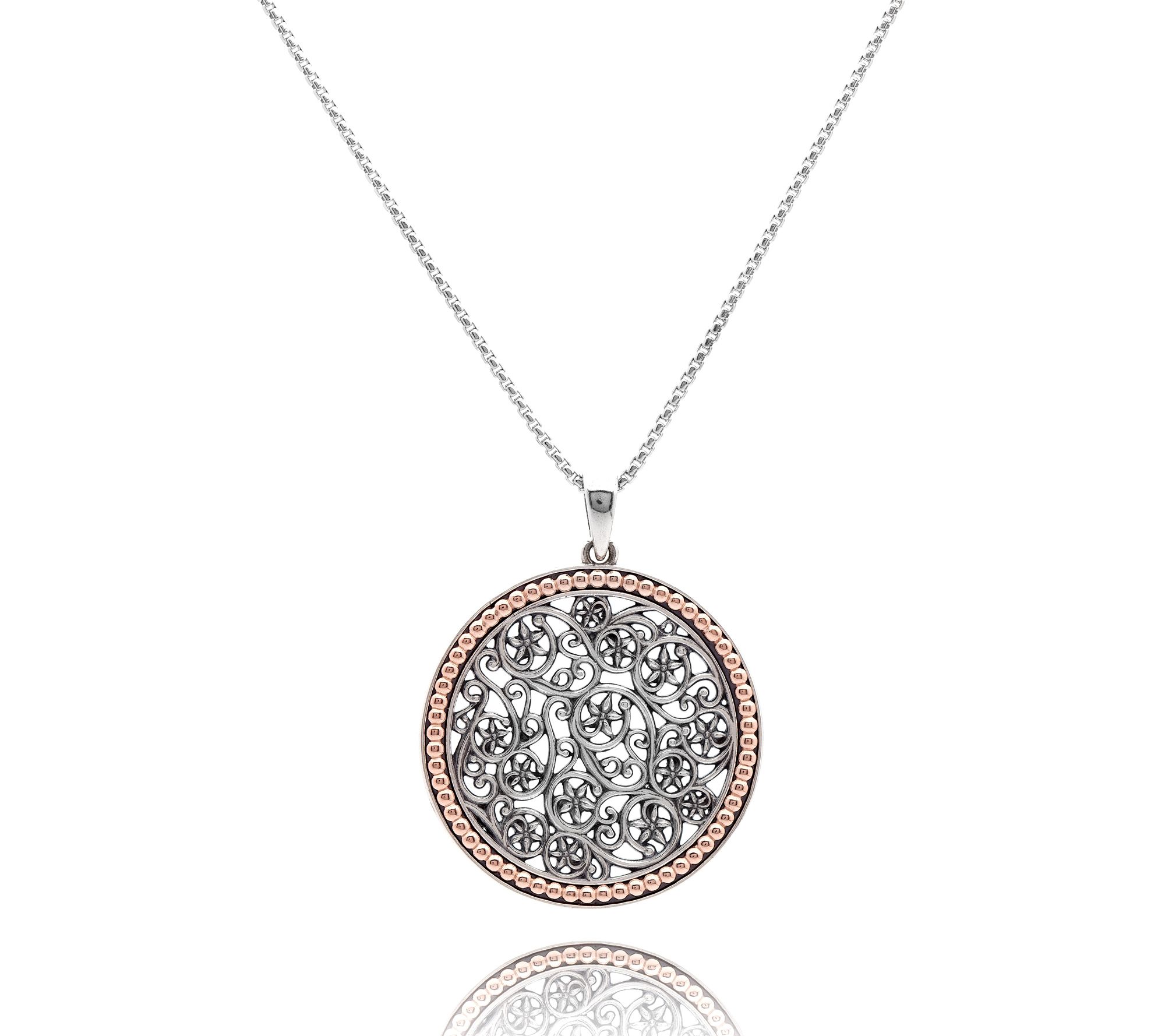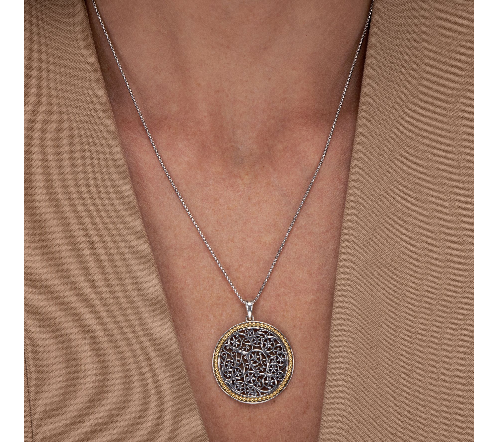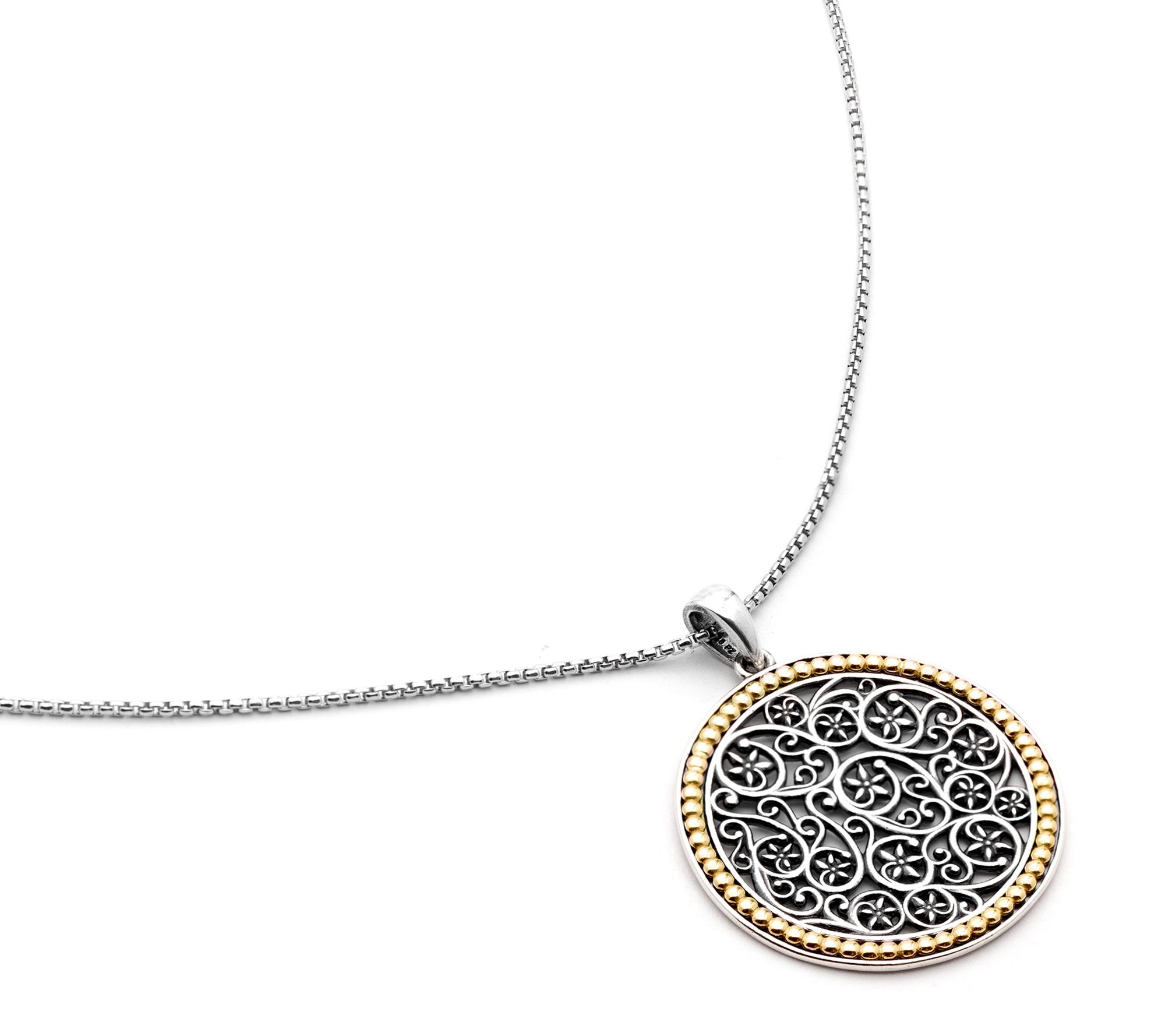 • Filigree circle pendant design; classic or two-tone options; box chain