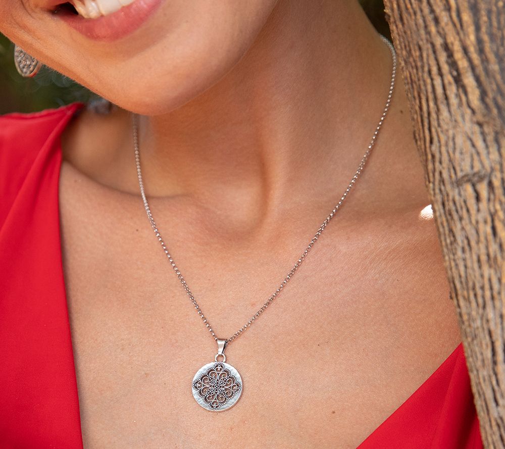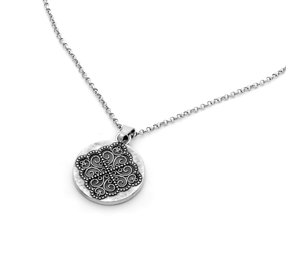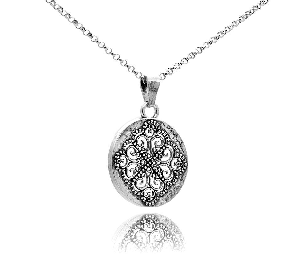 • Round pendant with openwork design and dainty beaded borders; hammered and polish finish