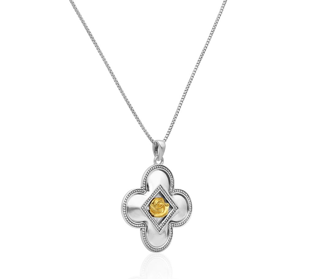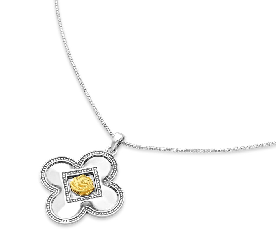 • Four petal-shaped pendant with a flower motif in its center; beaded borders; box chain