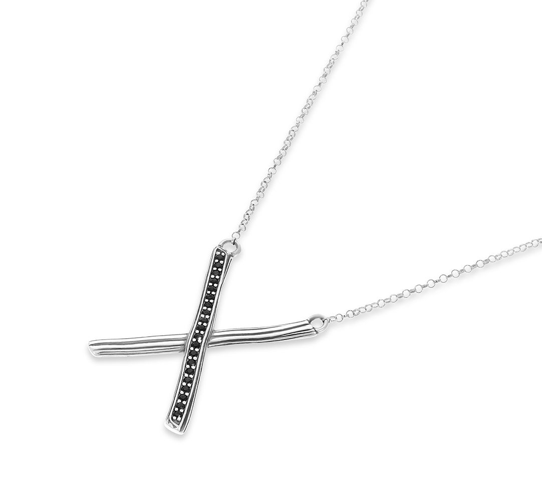 • Rolo chain with x-shaped pendant with oxidized stripes and round, prong-set gemstones
