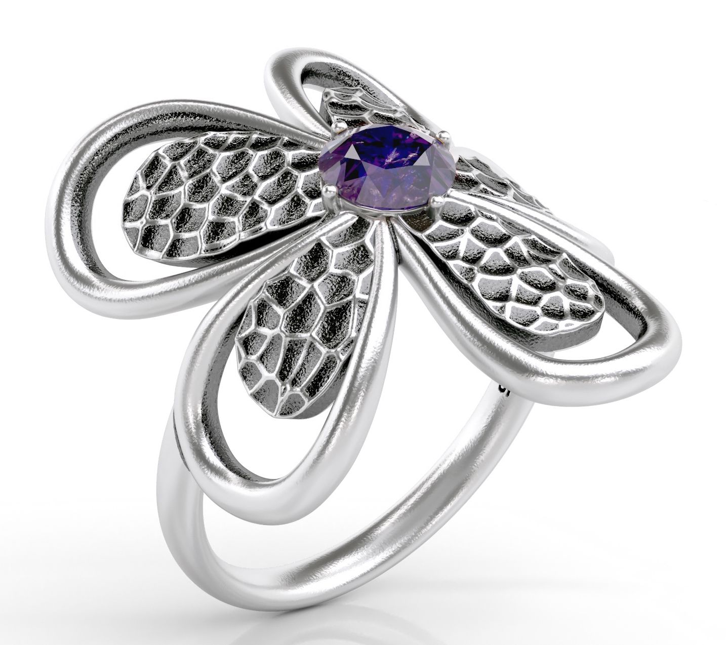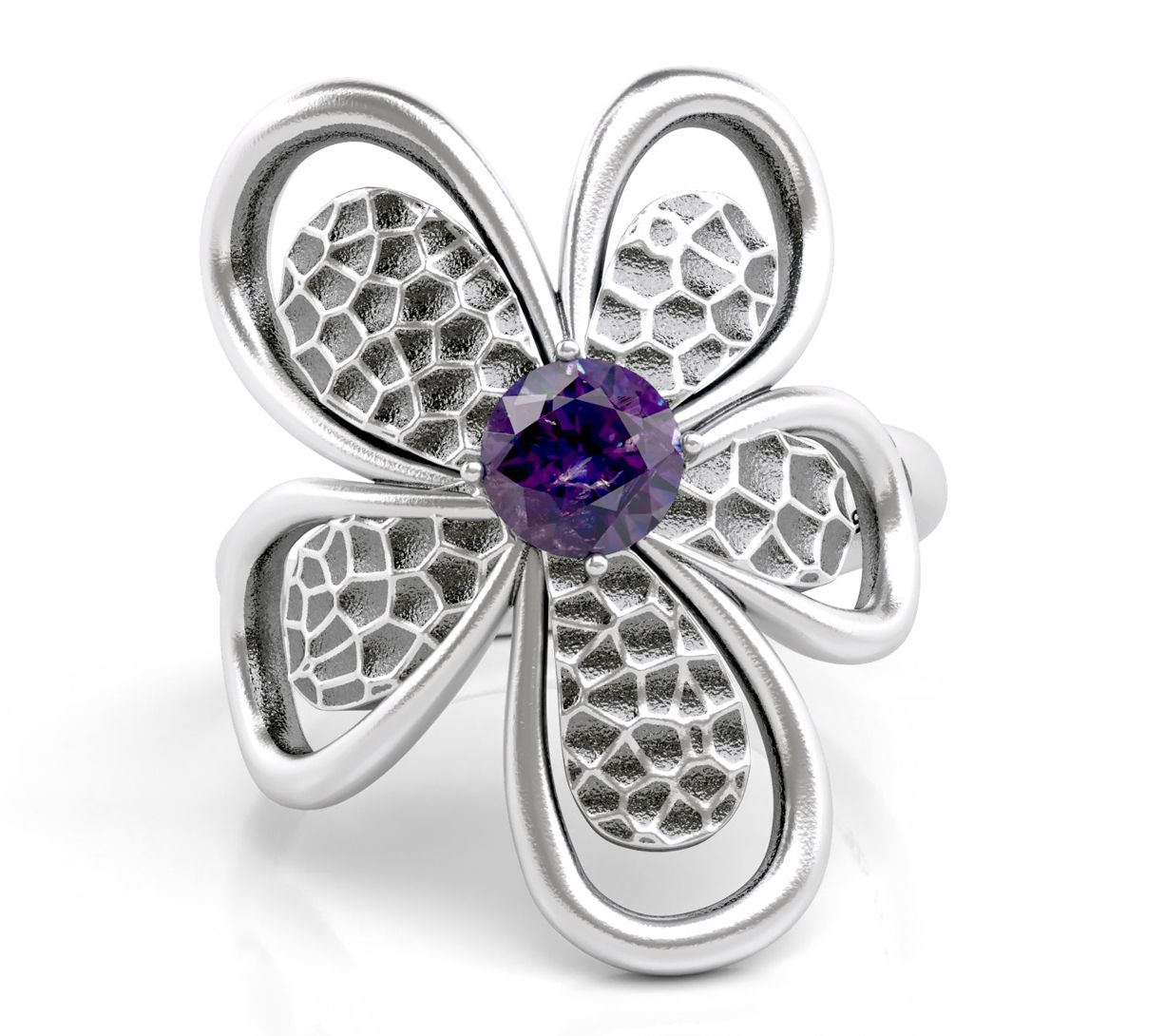 - Round-cut gemstones; prong setting; hammered texture