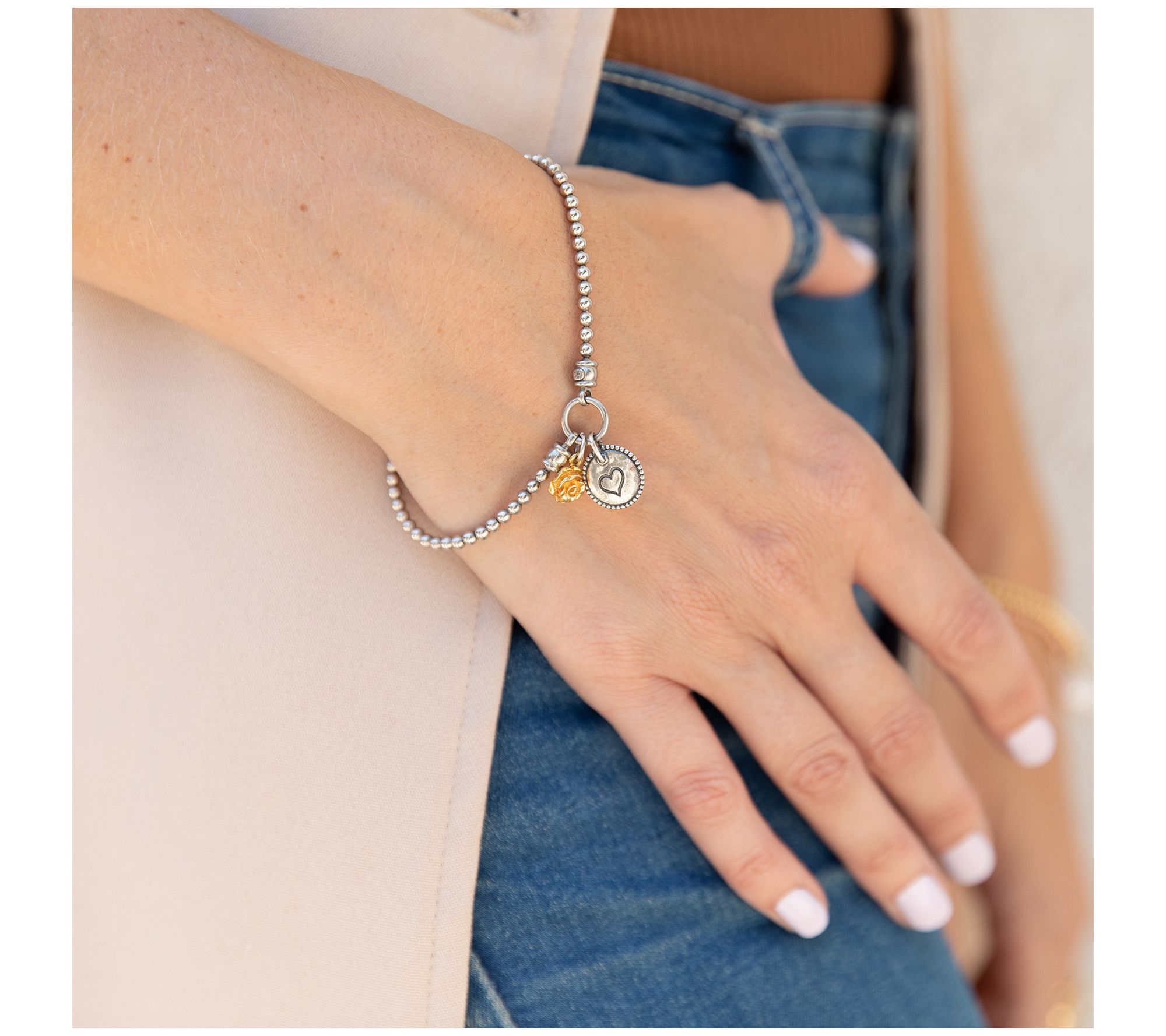 • Stretch bracelet with sterling silver beads; 14K yellow gold-plated sterling silver rose charm; sterling silver round heart charm