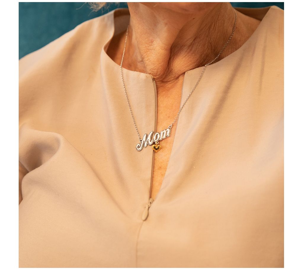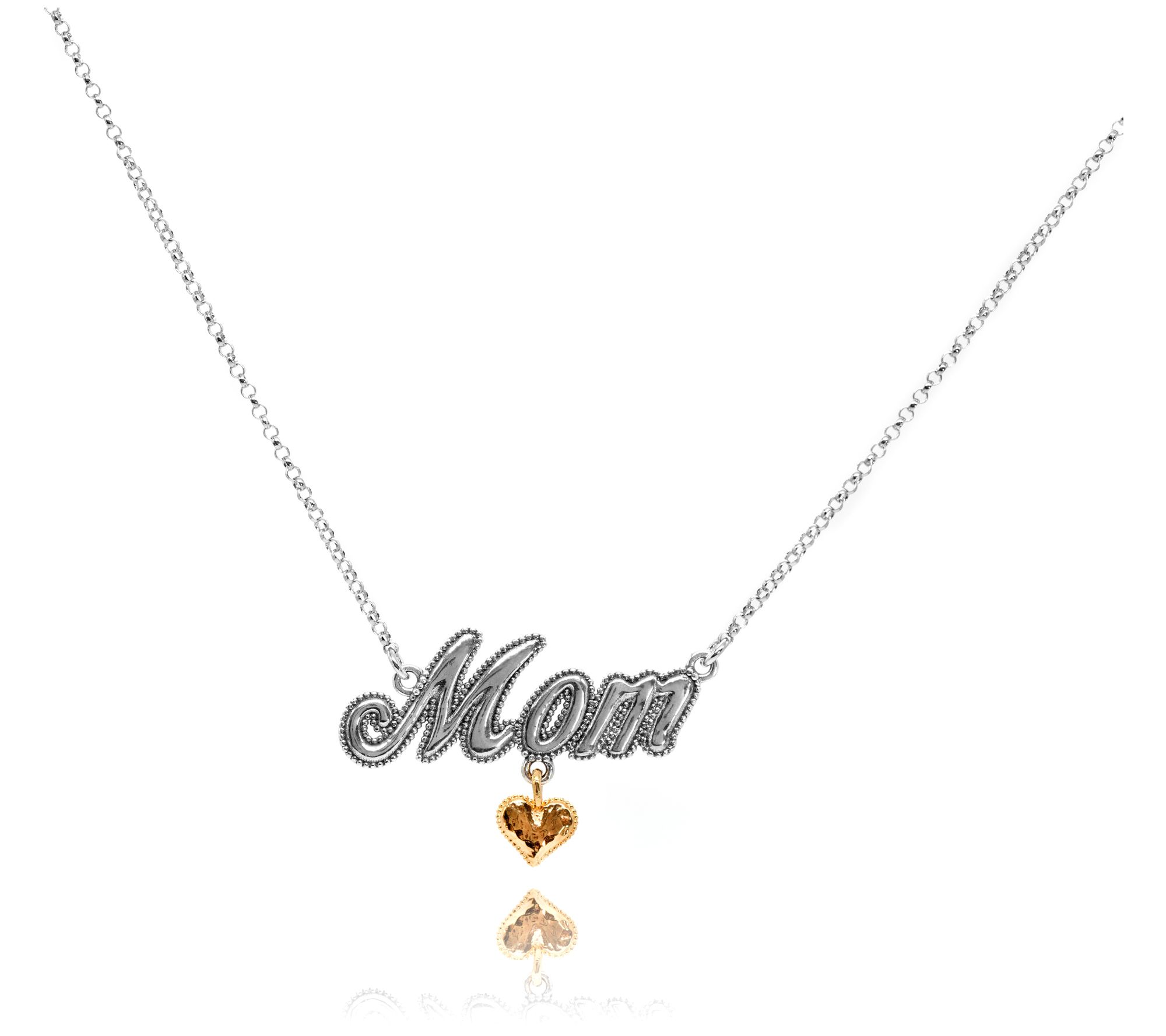 • Mom pendant with dangling heart charm; rolo chain