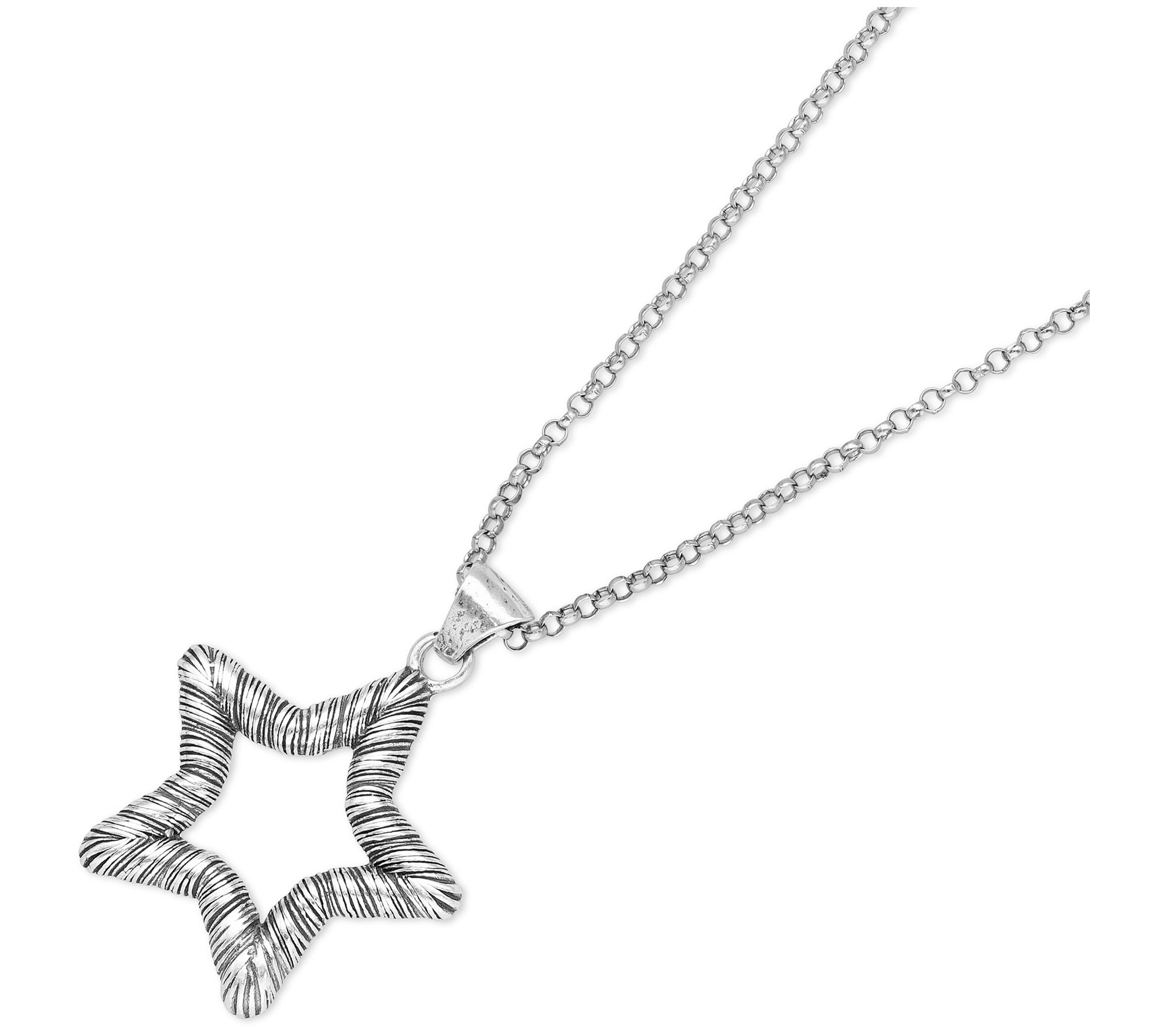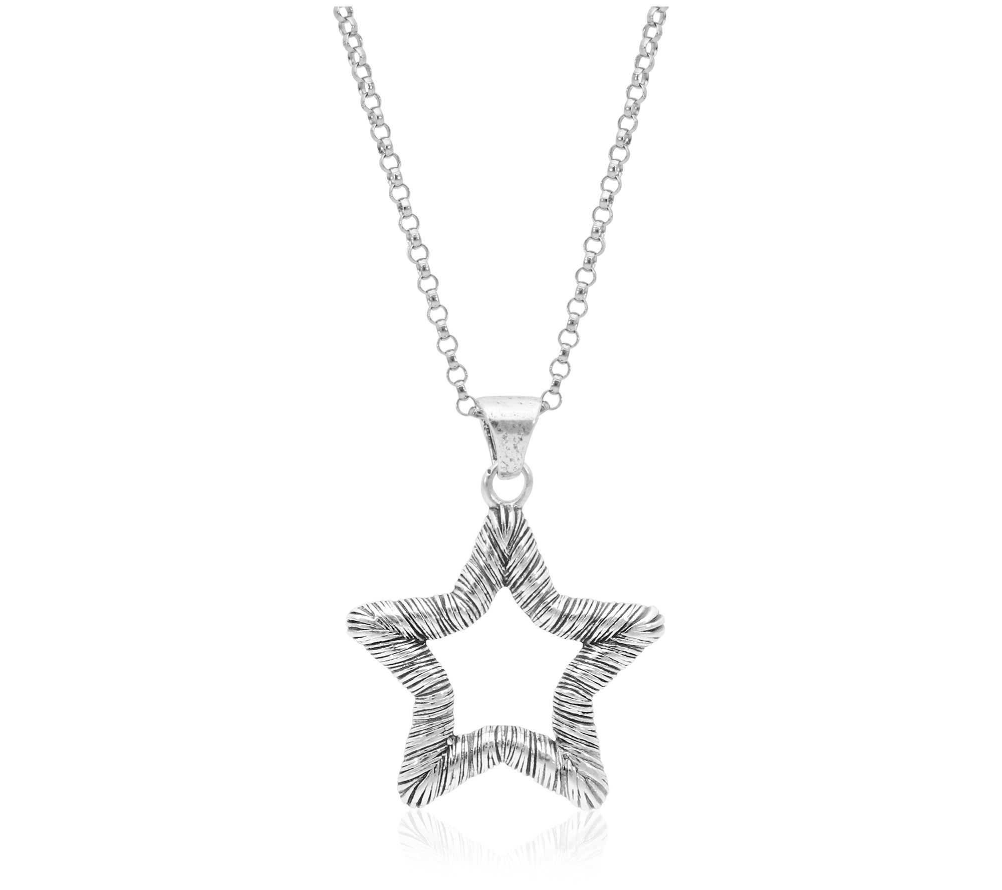 Open star pendant with textured finish; rolo chain