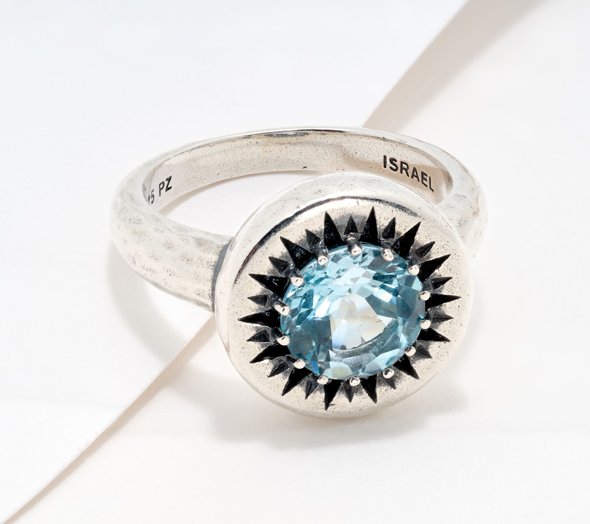 Sun's out, fun's out! This sunshine-design gemstone ring lets your signature style radiate, whether you're embracing a busy day or heading out for evening plans. Oxidized sterling silver creates a sun ray-inspired frame for a vibrant round-cut gemstone. Slip this on to add character and color to both casual and dressy 'fits. From Or Paz® Sterling Silver Jewelry.