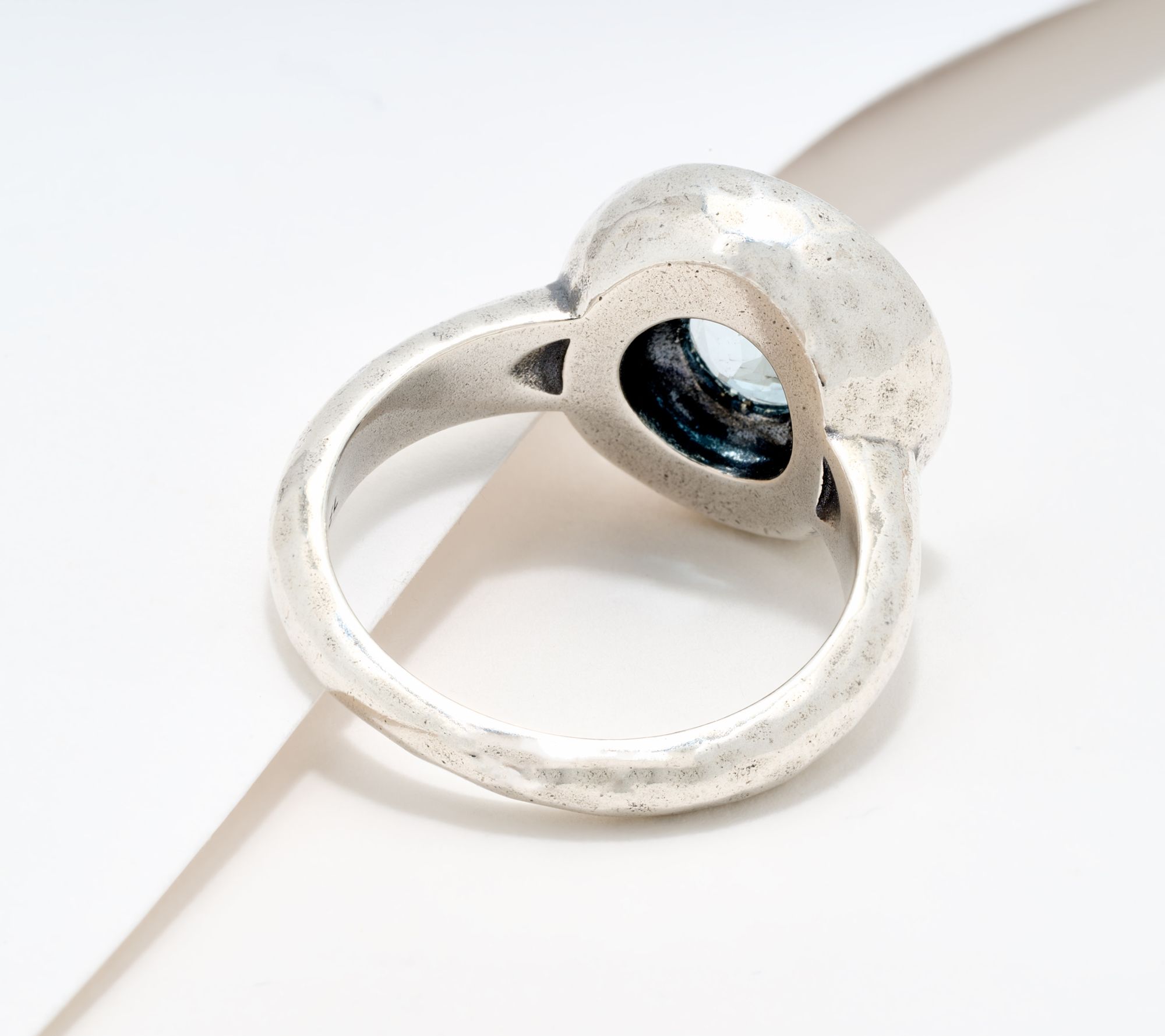 Bezel-set, round-cut faceted gemstone center with sunshine-like design; oxidized; polished finish
