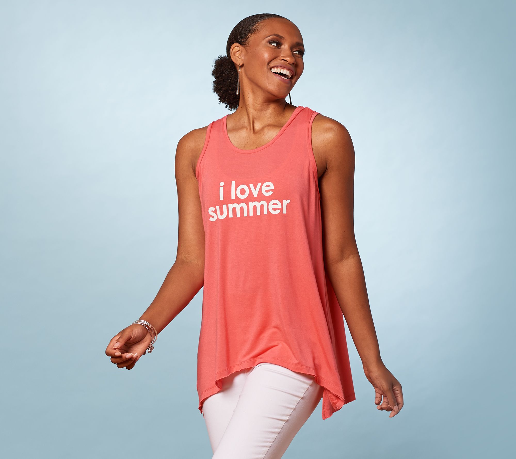 - Features: sleeveless, printed affirmation, raw edge details, asymmetric hem, side slits, embroidered detail at hem