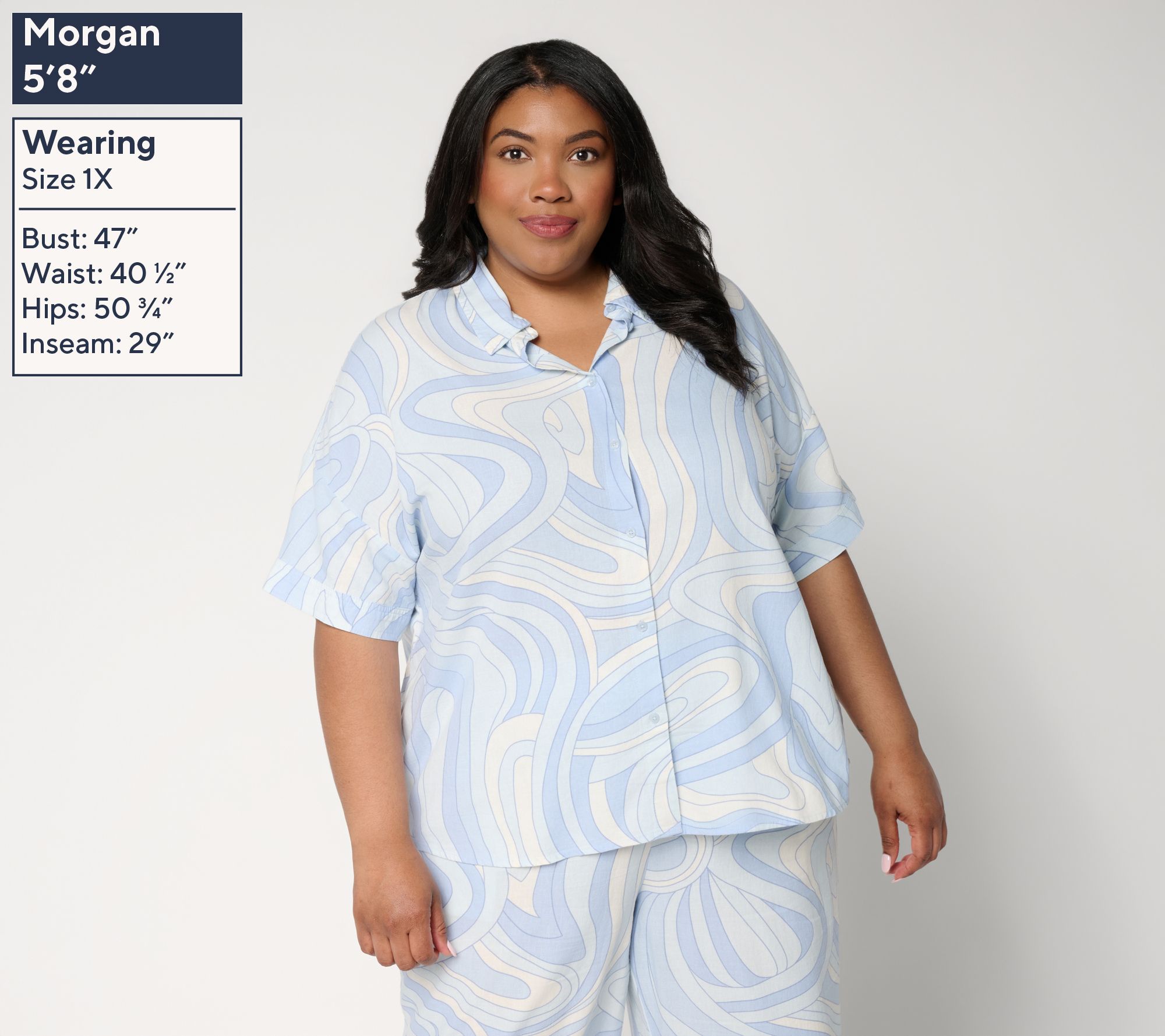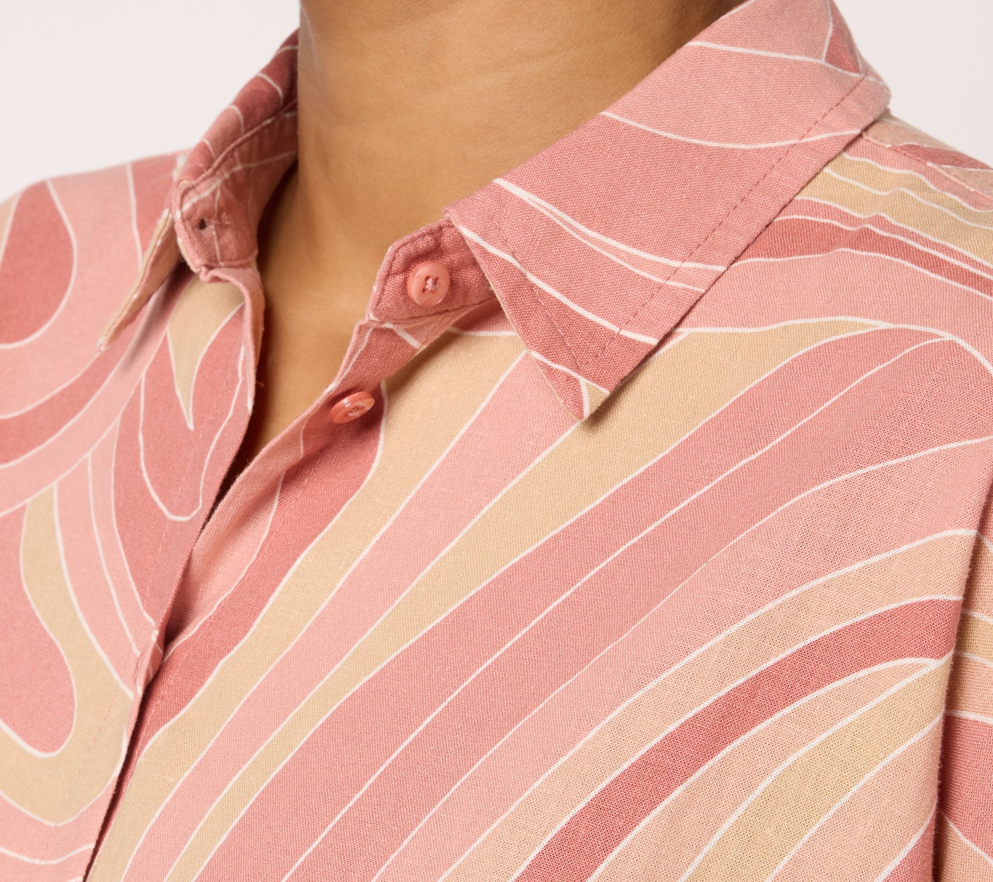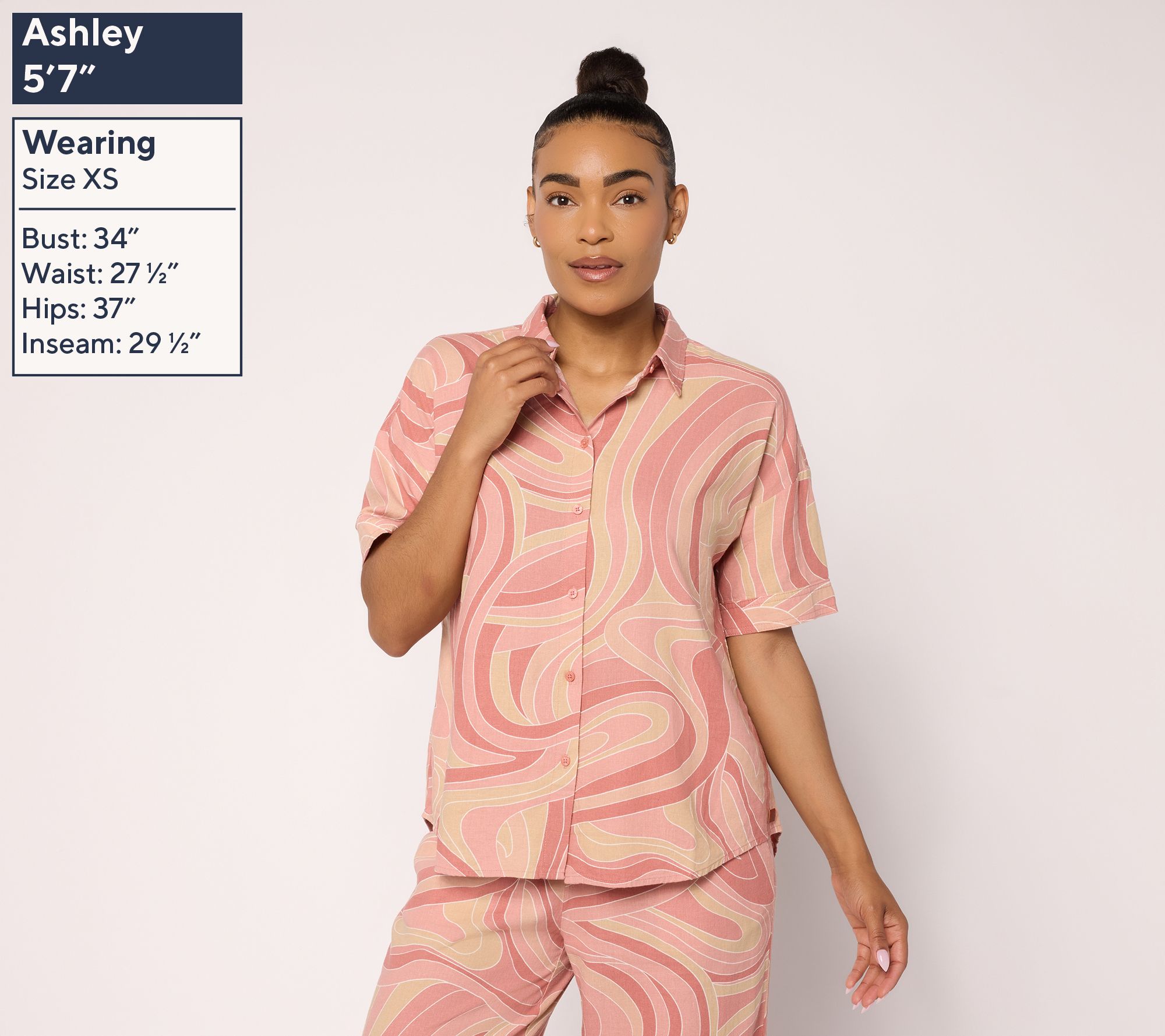 Peace Love World Boheme Linen Button Up Polo Top, features; woven fabrication, elbow sleeve, drop shoulder, dolman sleeve shape, turnback placket, double turn hem, separate folded cuff, buttons and pleats on cuffs, 2pc layer back yoke, wide CB box pleat Fit: fit by bust, relaxed, cut with max wearing ease Missy Length: 25 1/4"-27 5/8" Plus Length: 28"-31 1/2" Content: 45% rayon, 55% linen Care: MWC/DC/WS/ONCBWN/TDL/LIIN; COO: Imported (S)