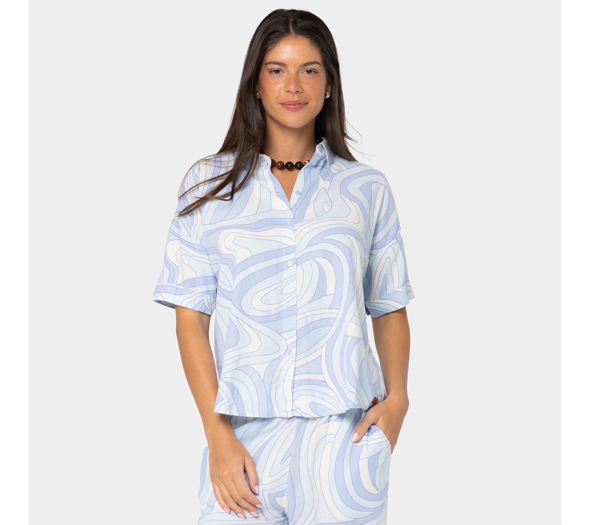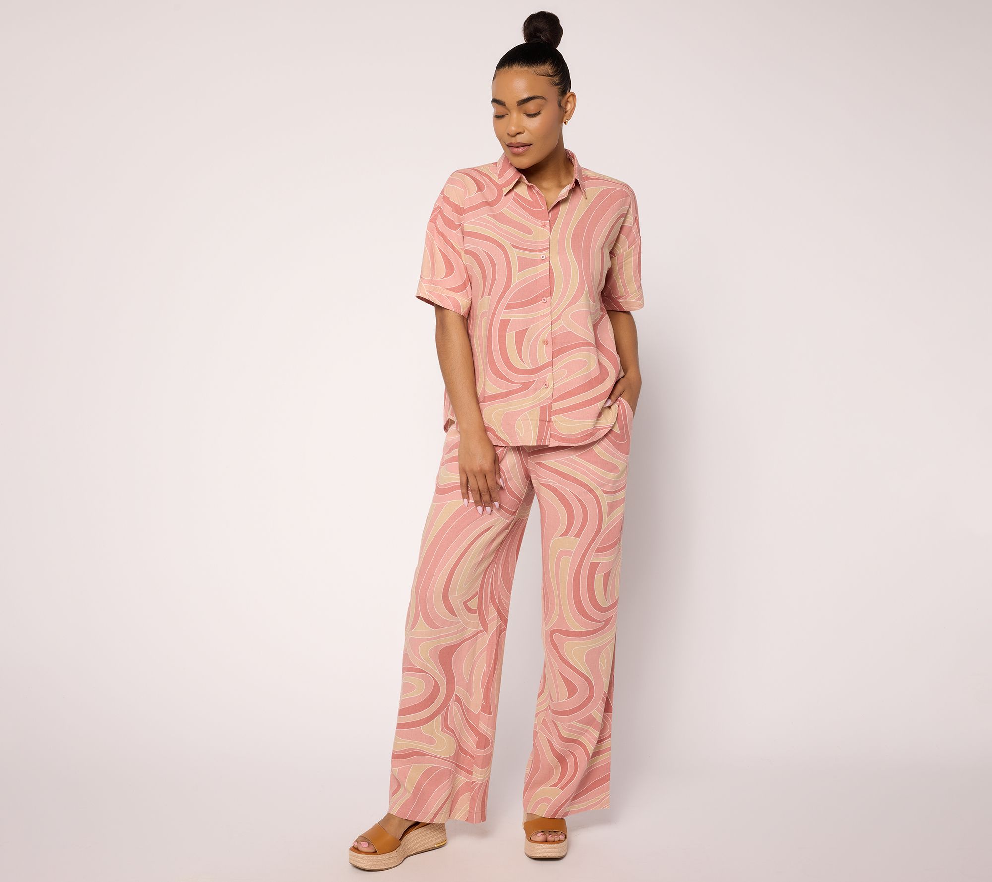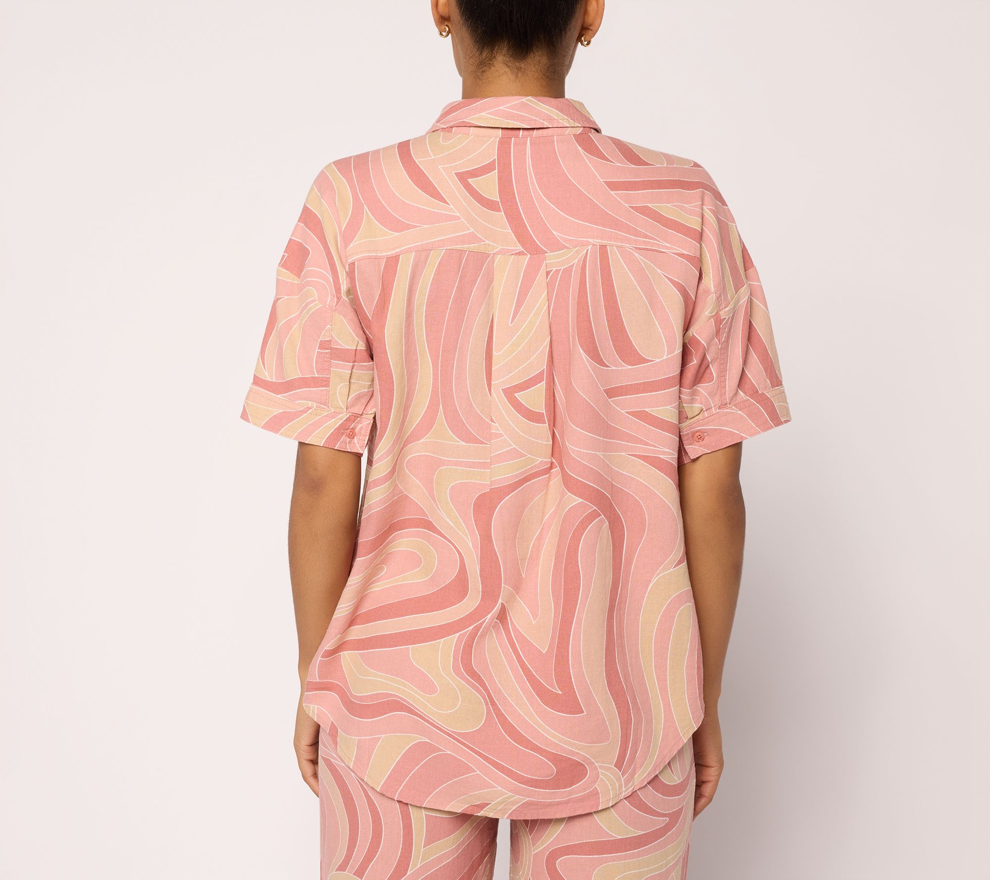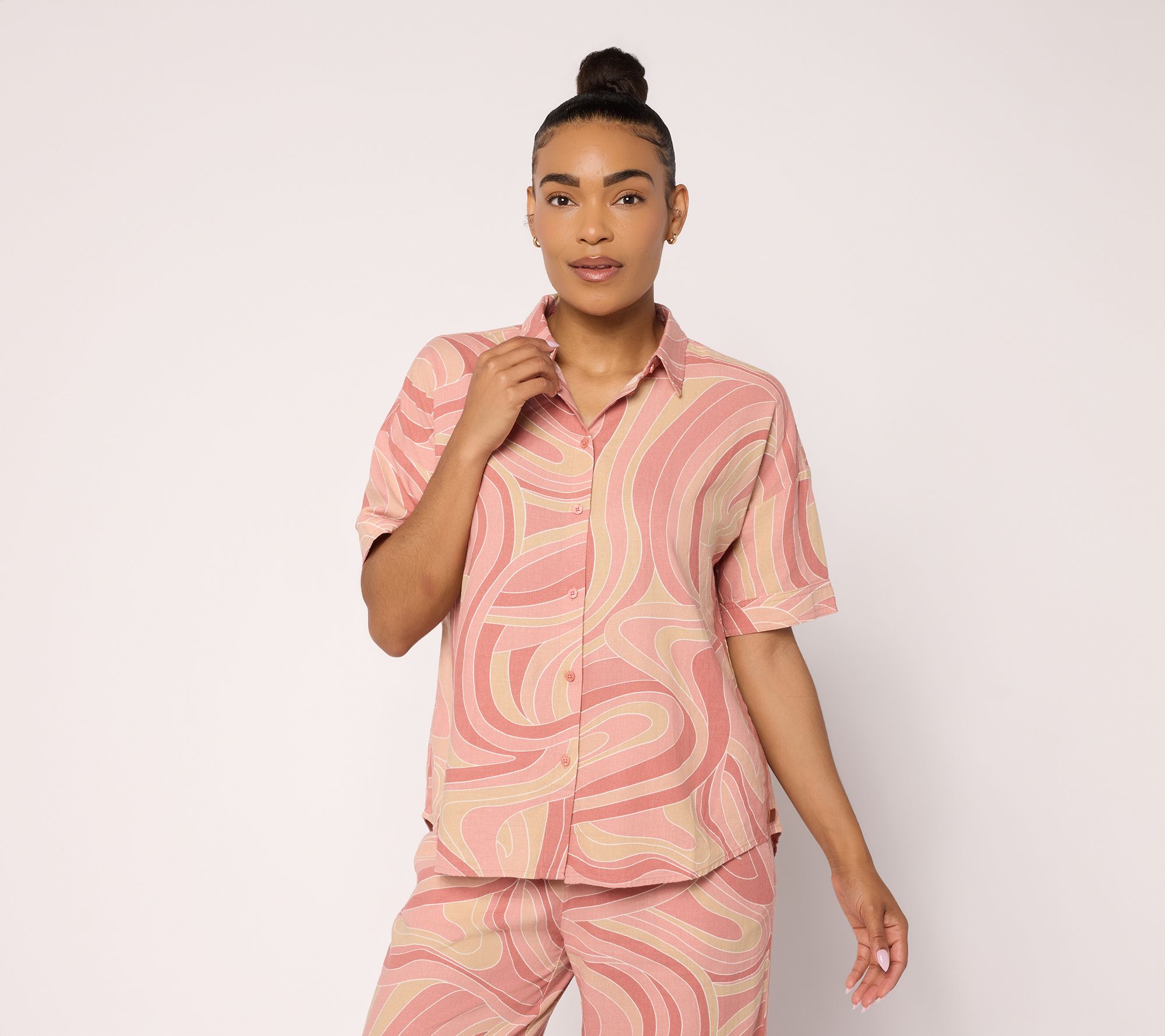 Peace Love World Boheme Linen Button Up Polo Top, features; woven fabrication, elbow sleeve, drop shoulder, dolman sleeve shape, turnback placket, double turn hem, separate folded cuff, buttons and pleats on cuffs, 2pc layer back yoke, wide CB box pleat Fit: fit by bust, relaxed, cut with max wearing ease Missy Length: 25 1/4"-27 5/8" Plus Length: 28"-31 1/2" Content: 45% rayon, 55% linen Care: MWC/DC/WS/ONCBWN/TDL/LIIN; COO: Imported (S)