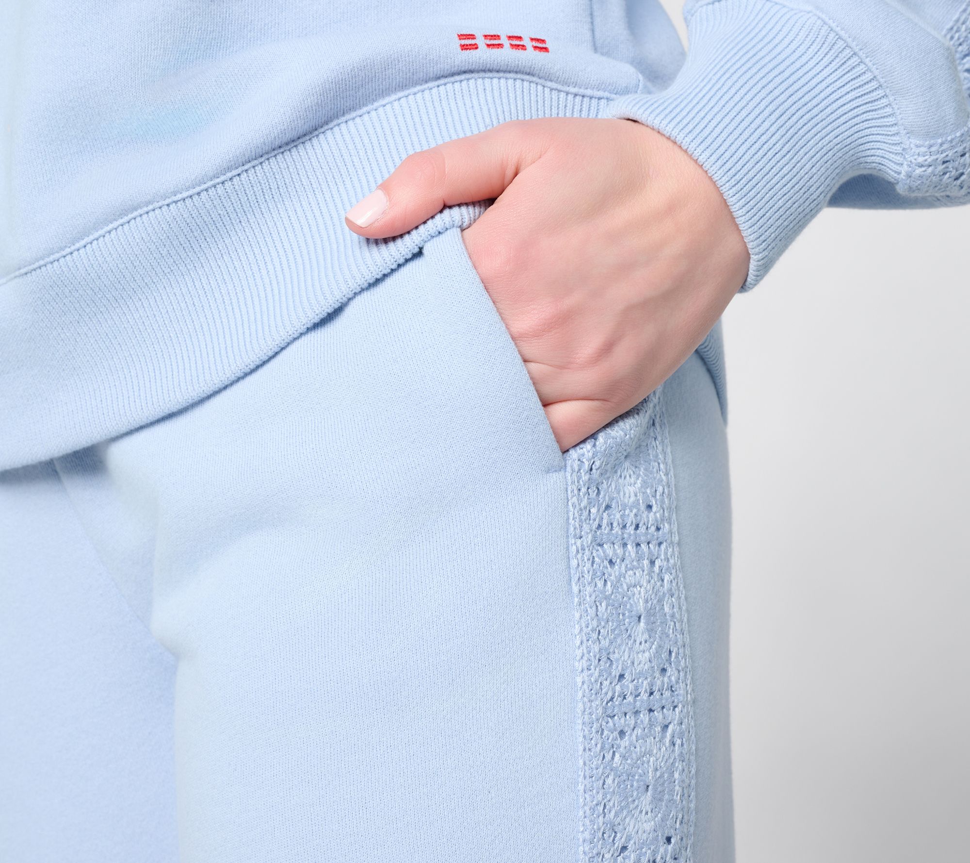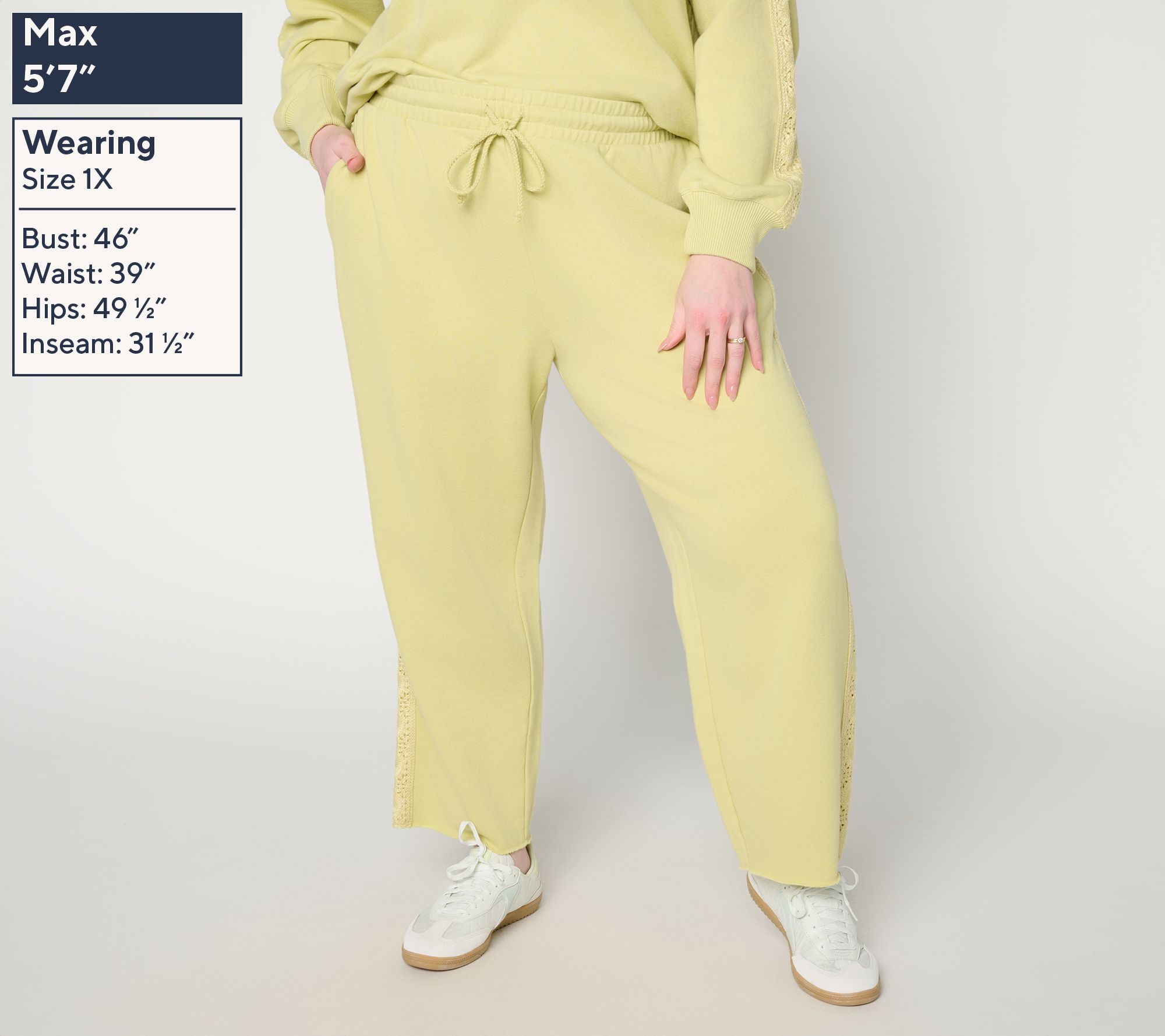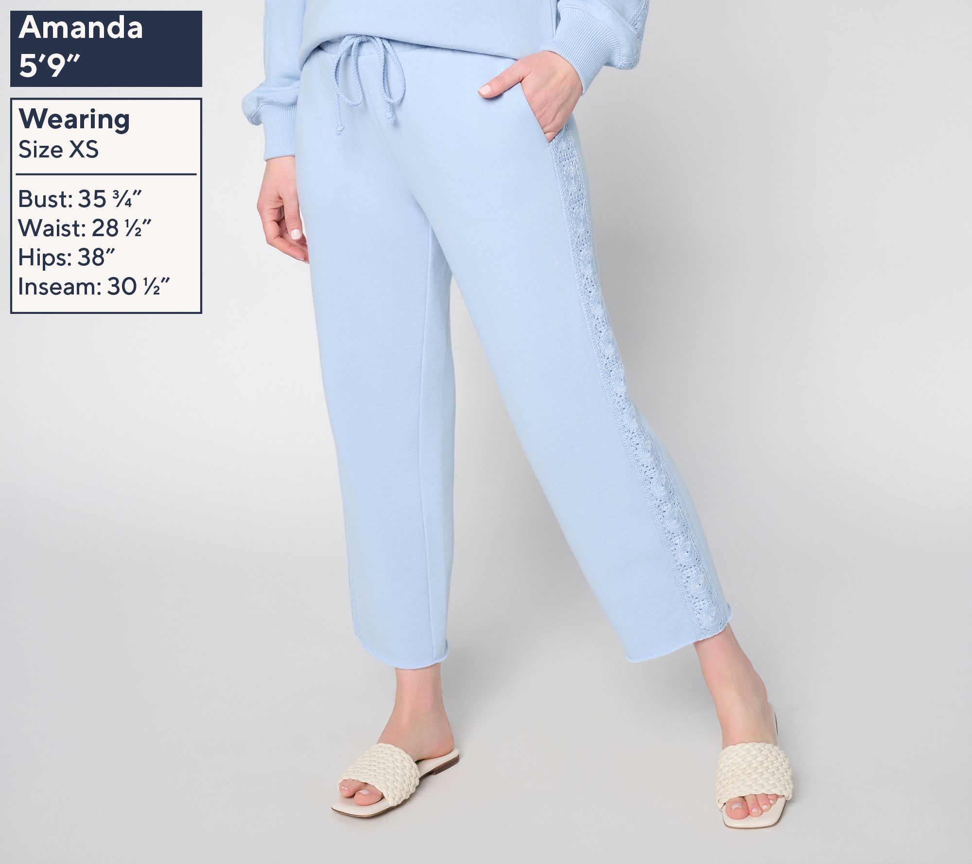 Features: pull-on style, elastic waist with functional drawcord, on-seam pockets, crochet trim panel set on outseam, raw-edge hem with single stay stitch