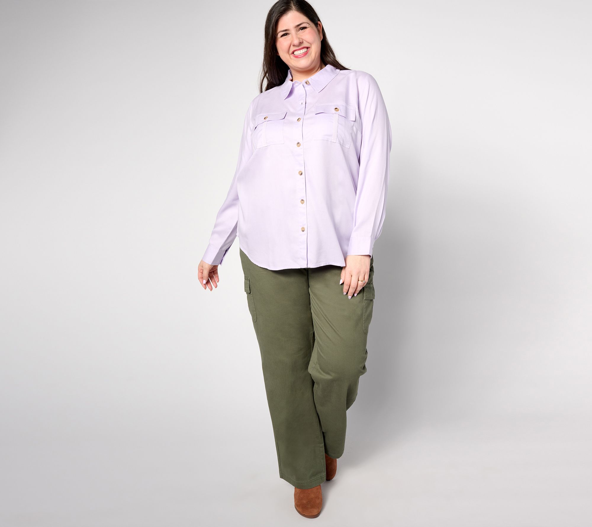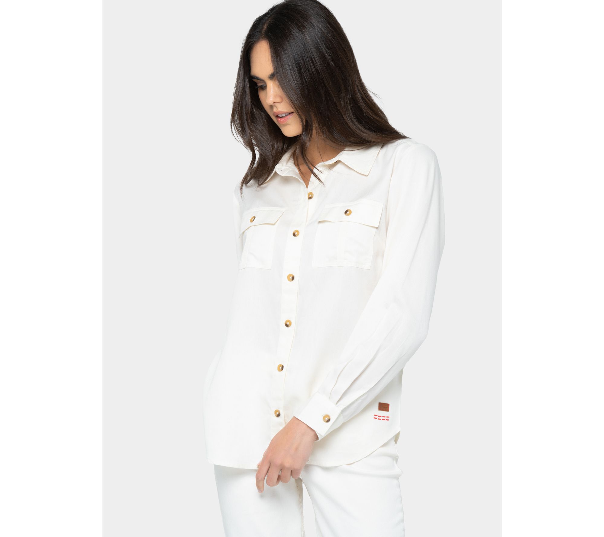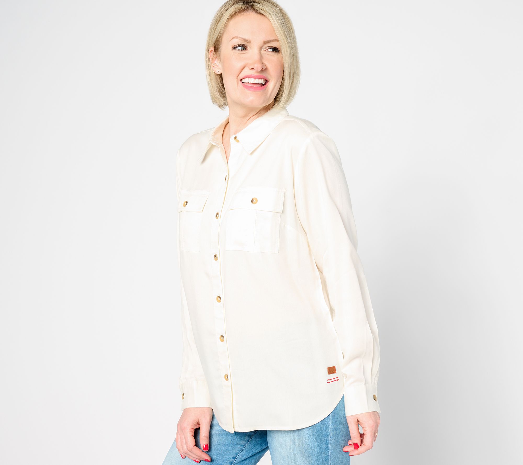 A must-have for every working woman's wardrobe, this office-ready button-front shirt also comes in clutch for casual off-duty days. Dress it up with trousers and heels or dress it down with a pair of straight-leg denim and sneakers. From Peace Love World.