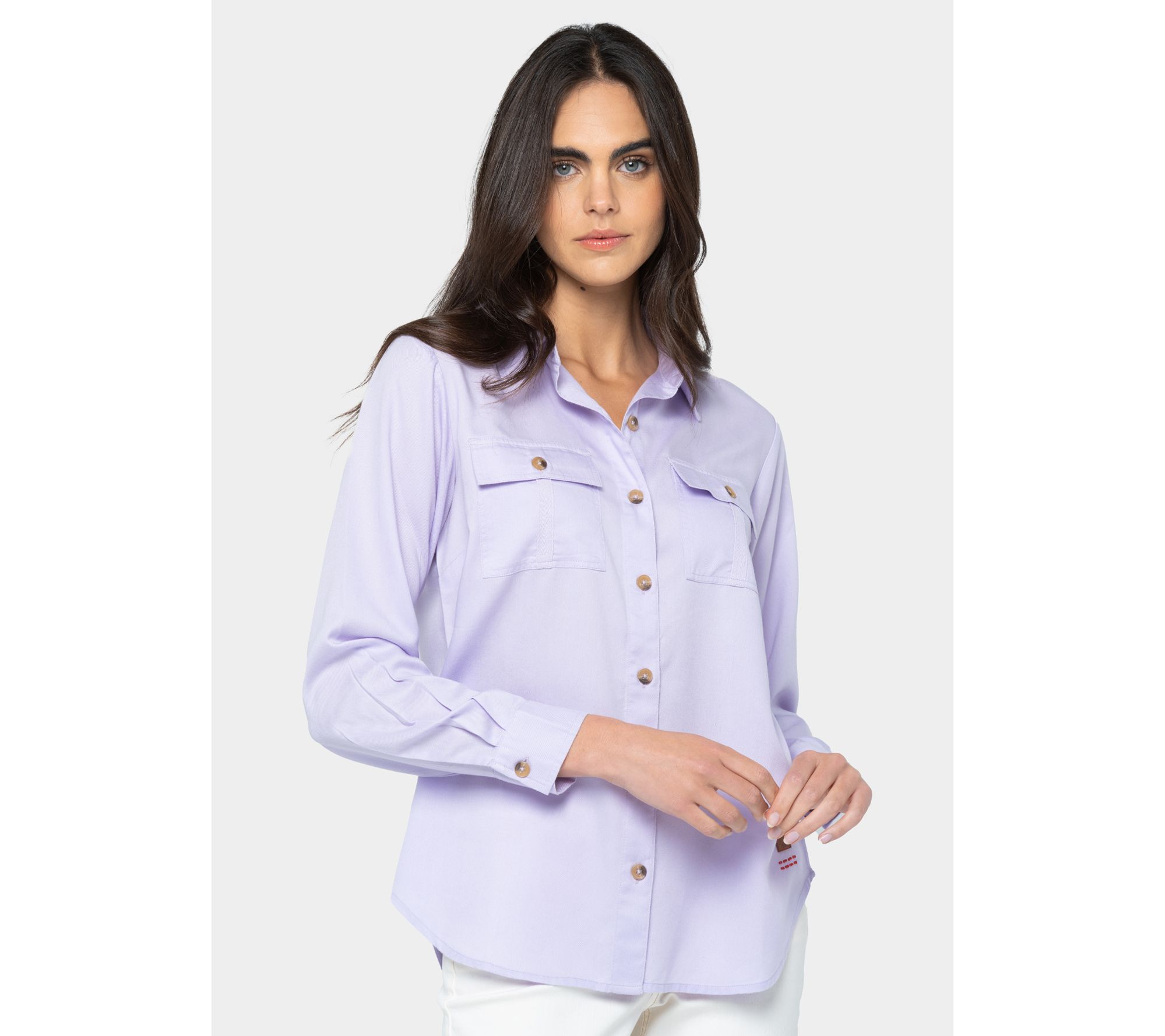Features: two-ply collar, placket with button closure, front patch pocket with button flap closure, set-in long sleeves with button cuff, shirttail hem