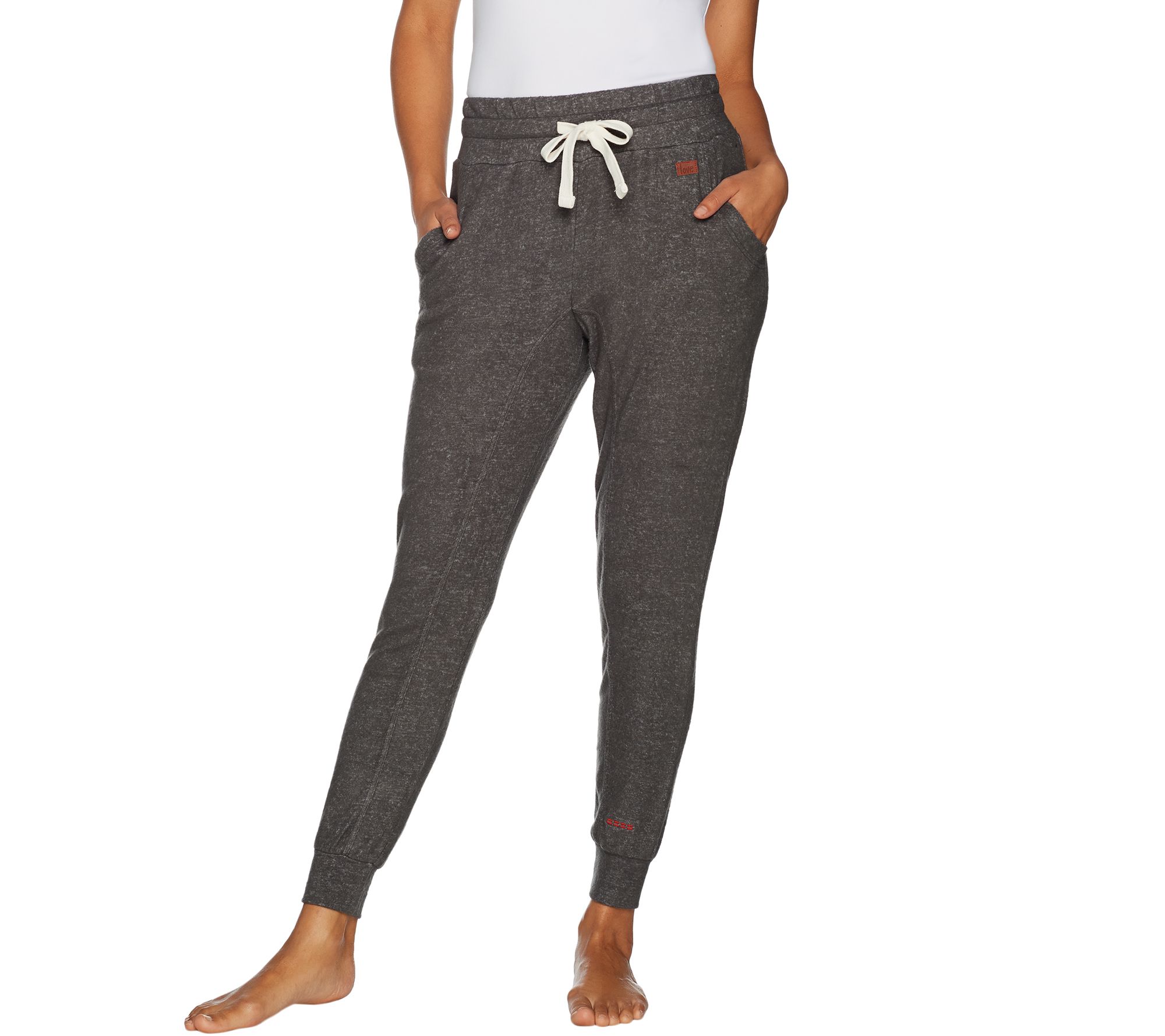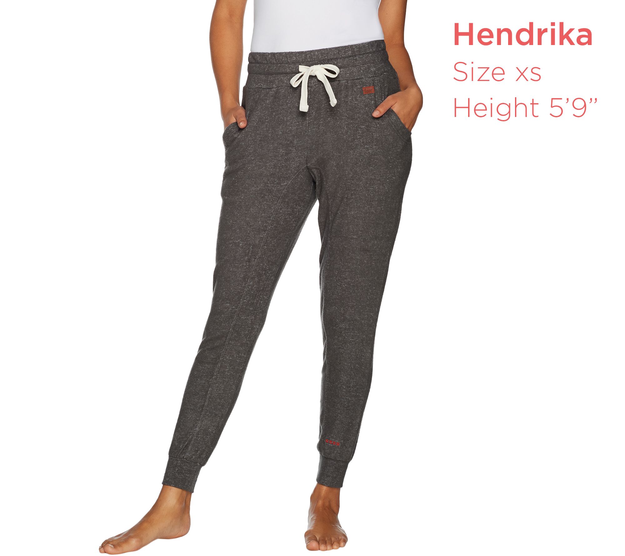 - Features: drawstring waistband, jogger-style hem, two functional front pockets, stitch detail, printer affirmation on hem, leather logo patch