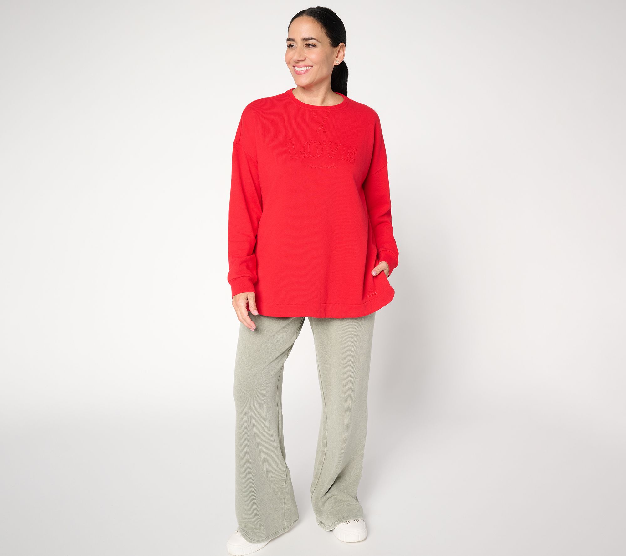 Searching your closet for that laid-back vibe? Don't sweat it. This crewneck sweatshirt features a relaxed fit and cotton-rich fabric, so you can kick back in comfort while layering over anything from leggings and joggers to denim or ponte. From Peace Love World.