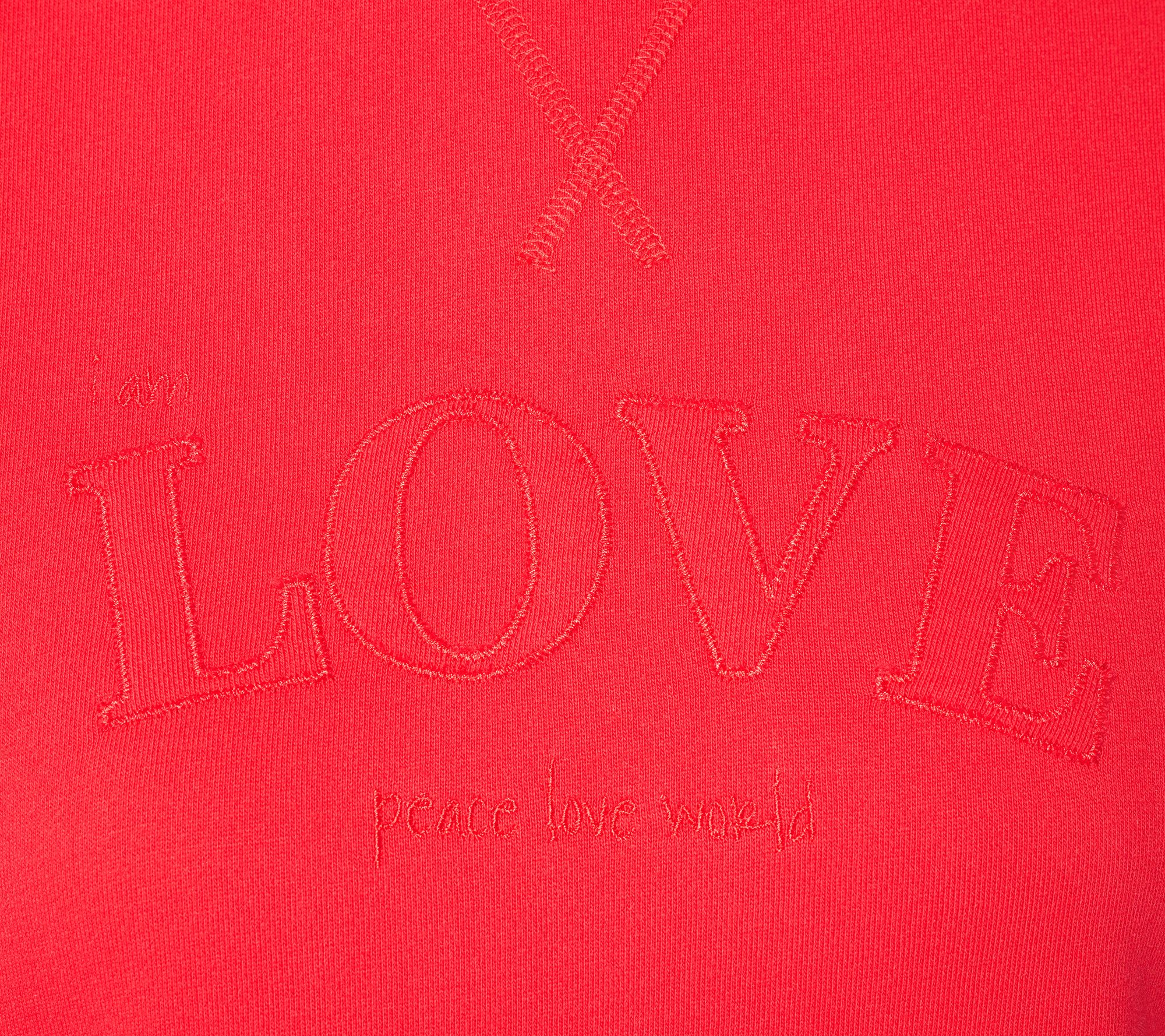 Features: "X" coverstitch center-front neck, drop shoulder seams, crewneck with folded rib band, long sleeves with folded rib cuff