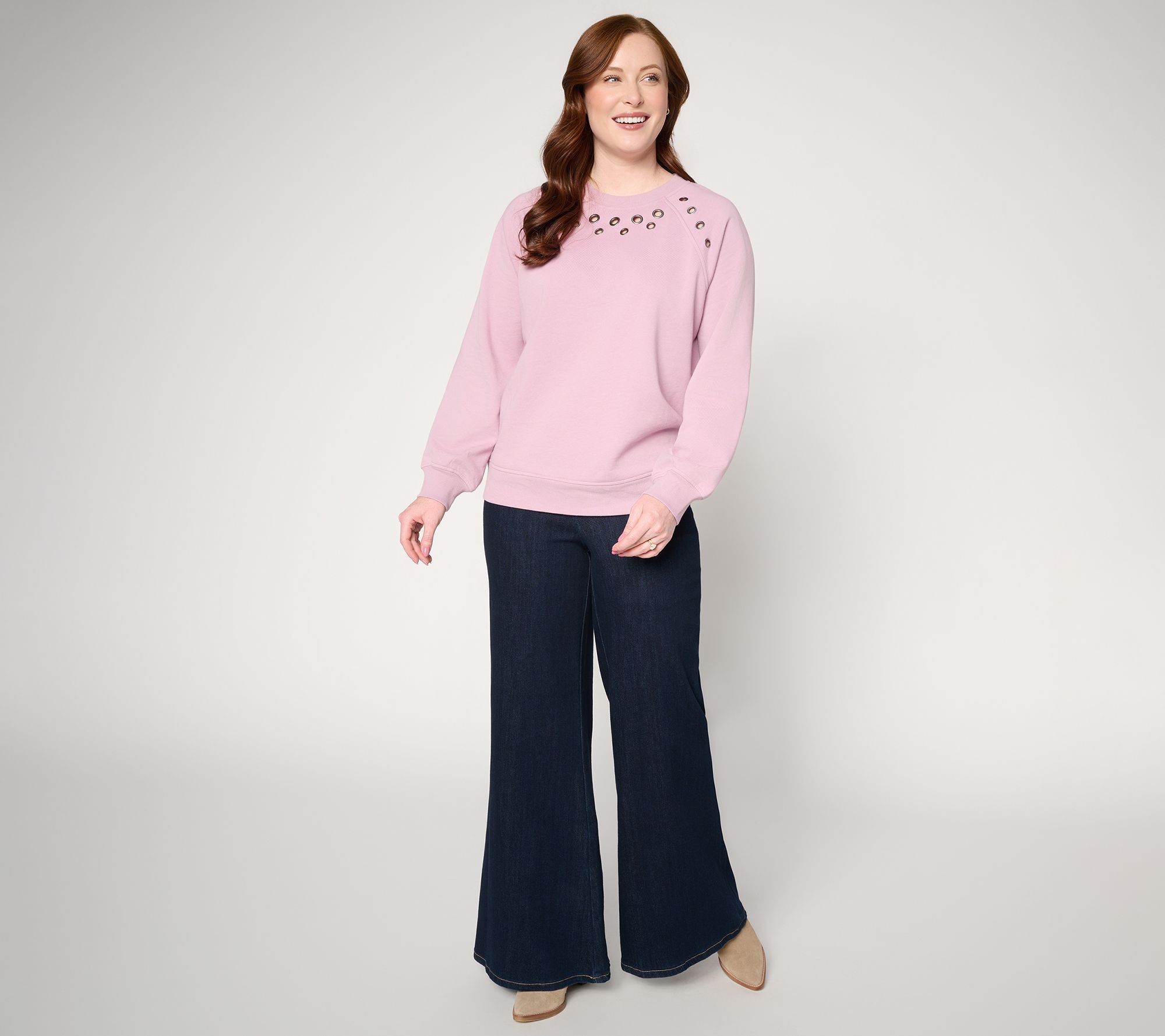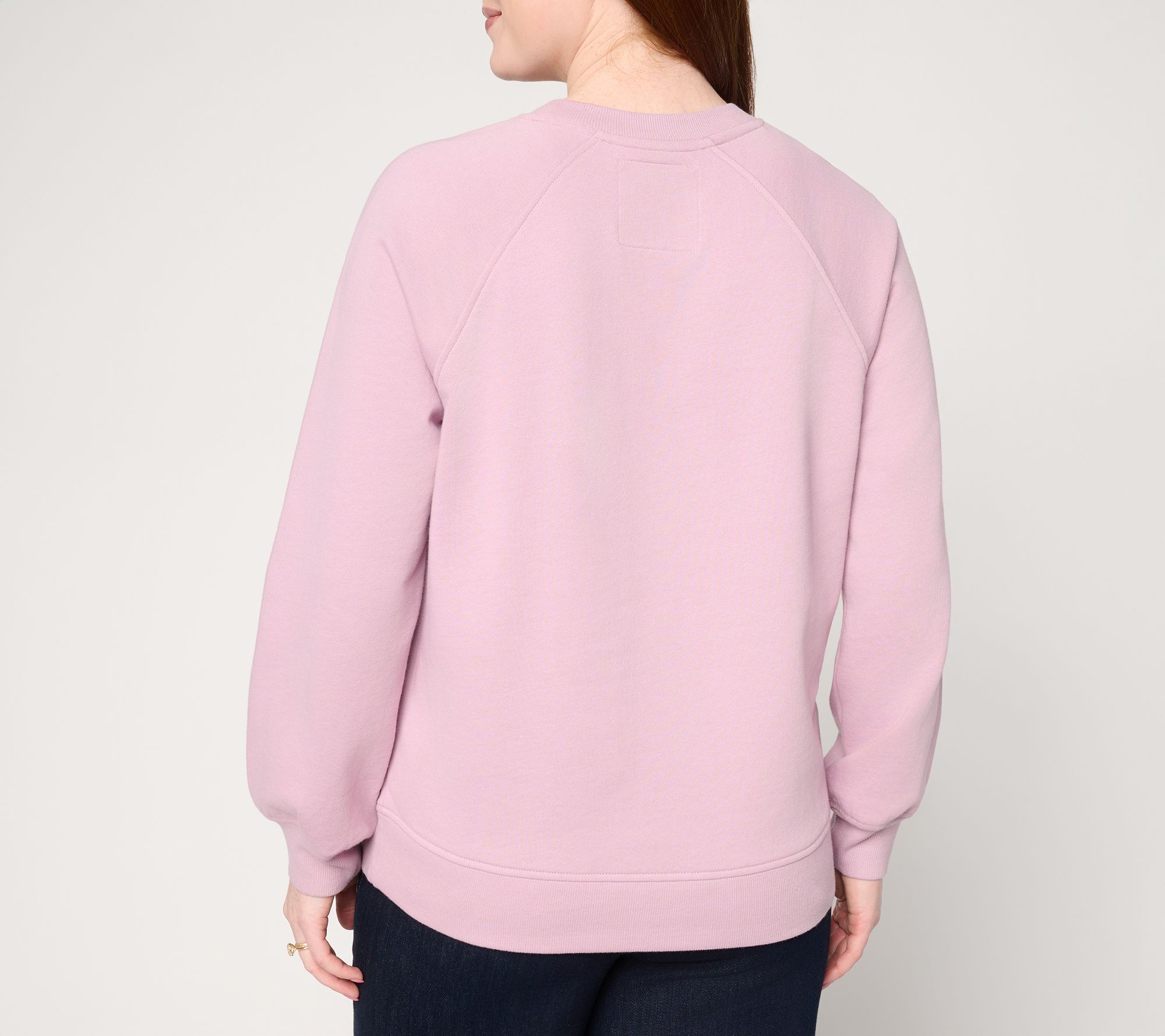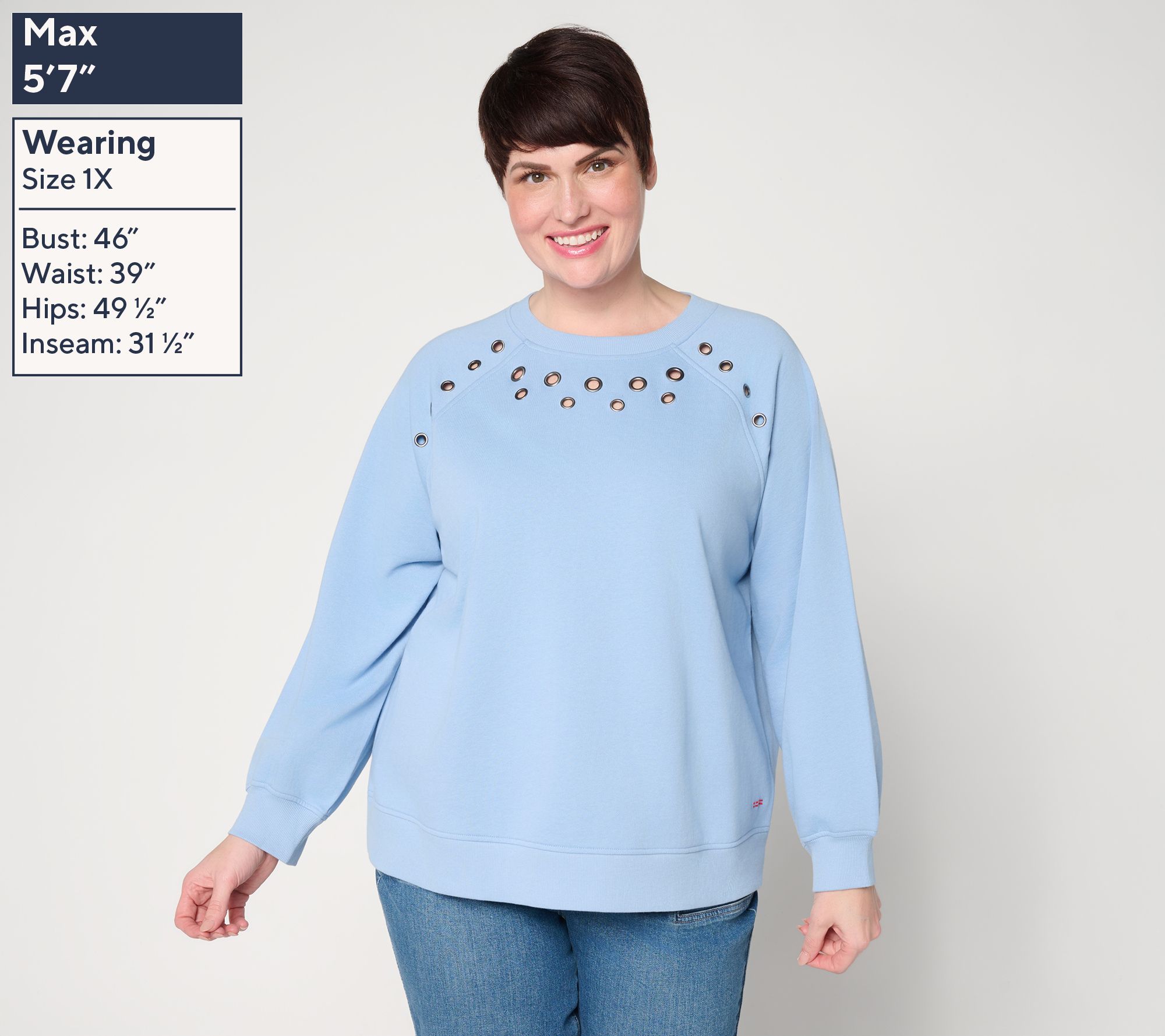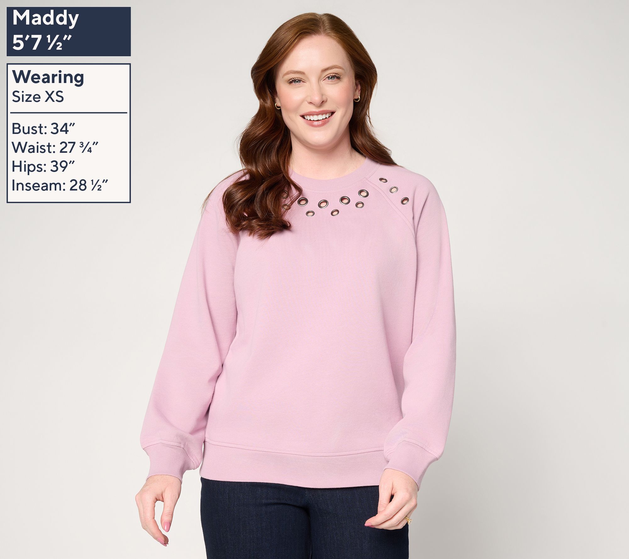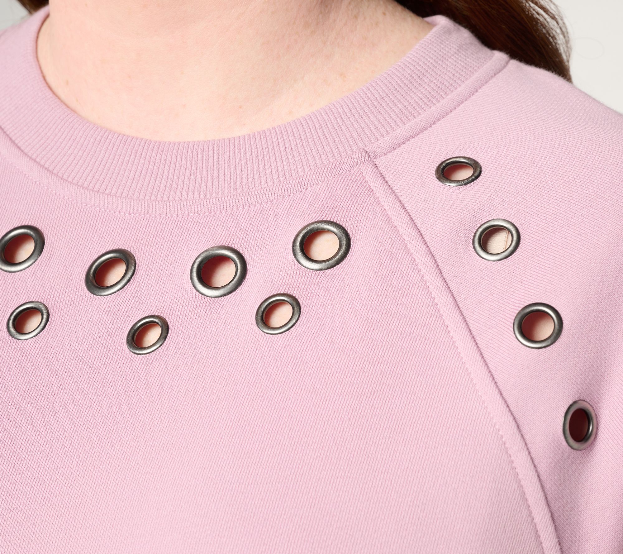 Features: long raglan sleeves, ribbed neckband, front metal grommets with fabric cutout, ribbed cuffs and bottom band