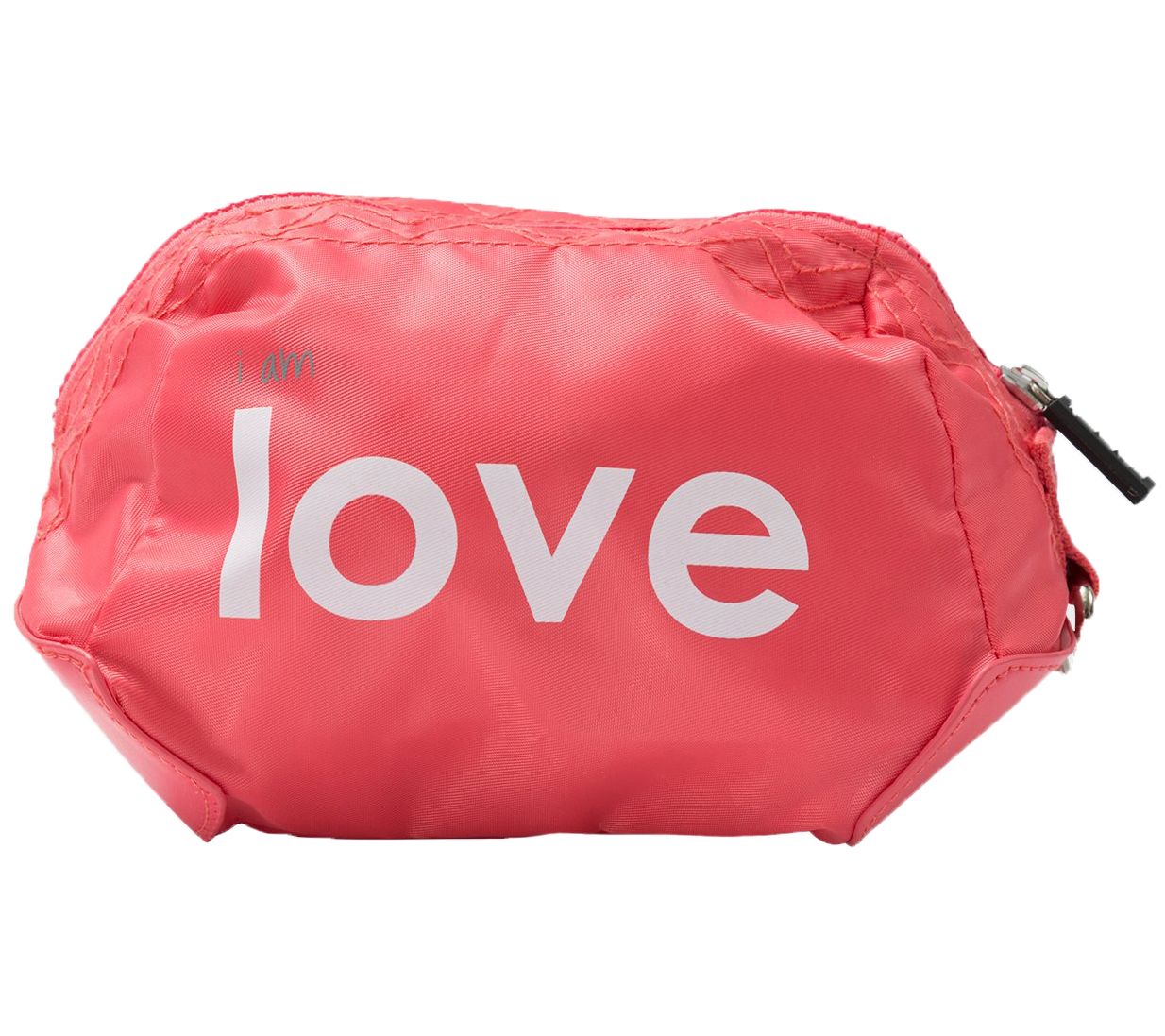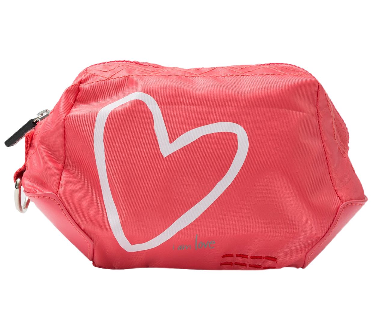 • Zipper closure with rubber pull tab; logo printed in white on one side and "I am LOVE" on the other; signature red lines stitched on bottom left side