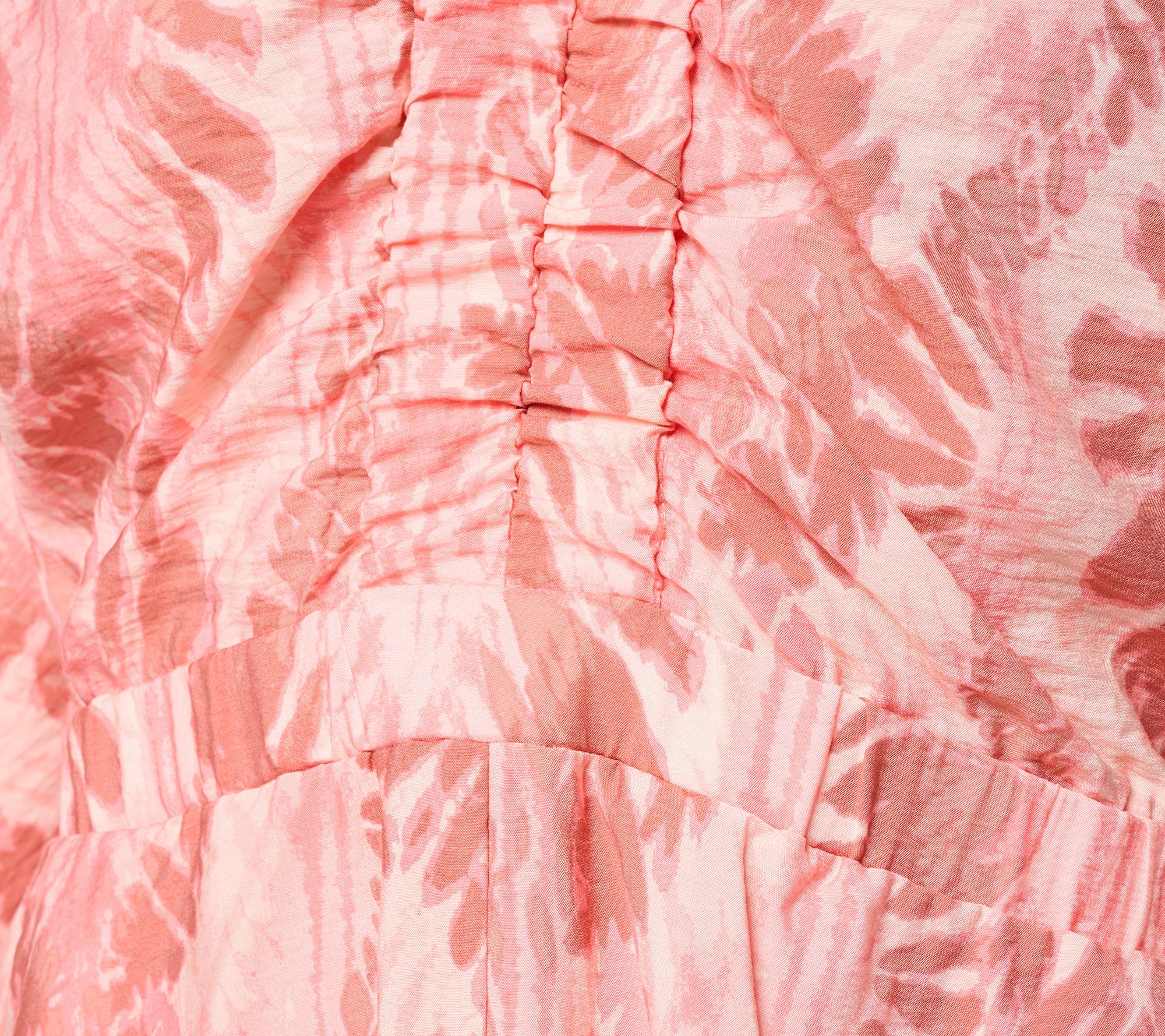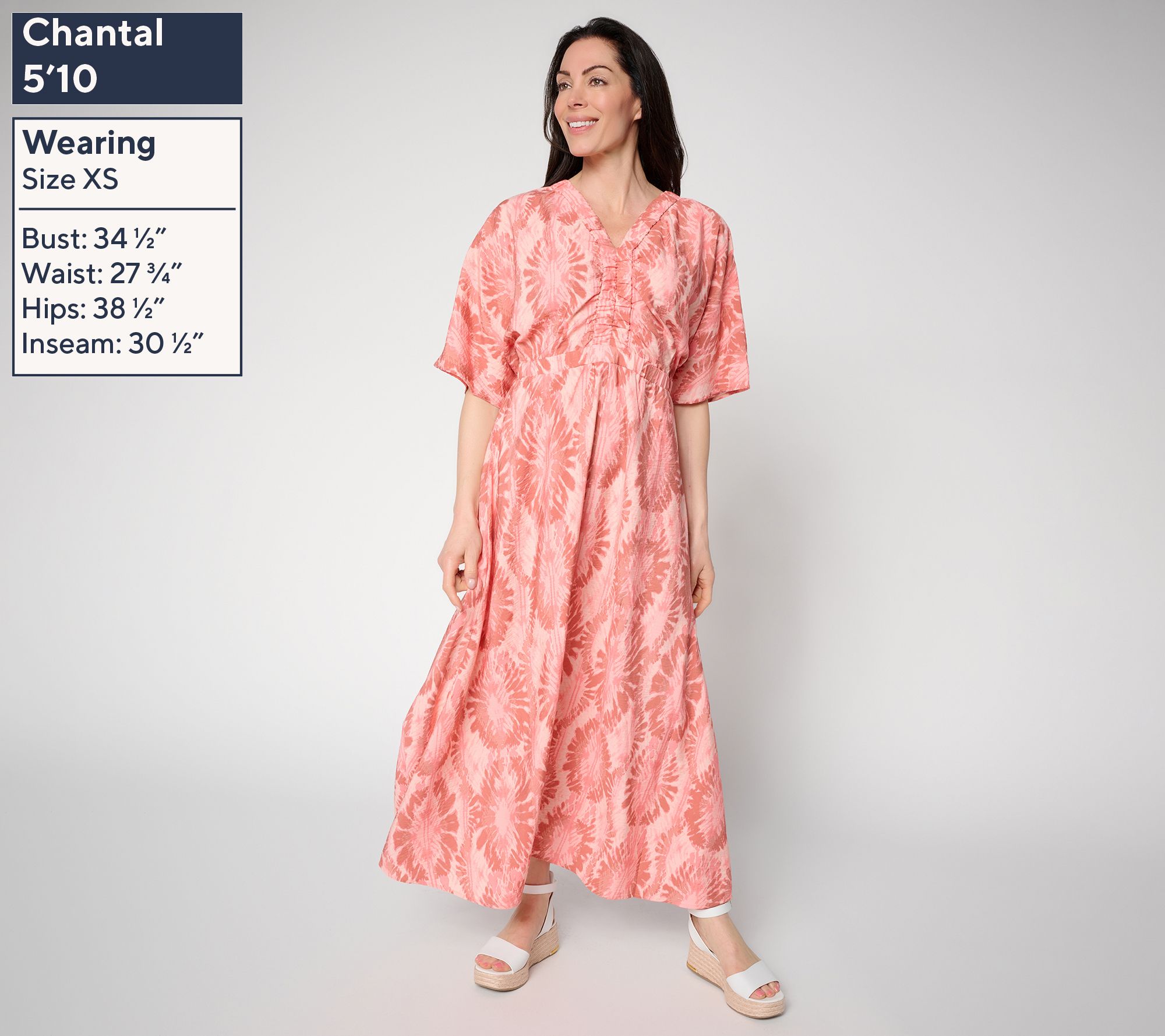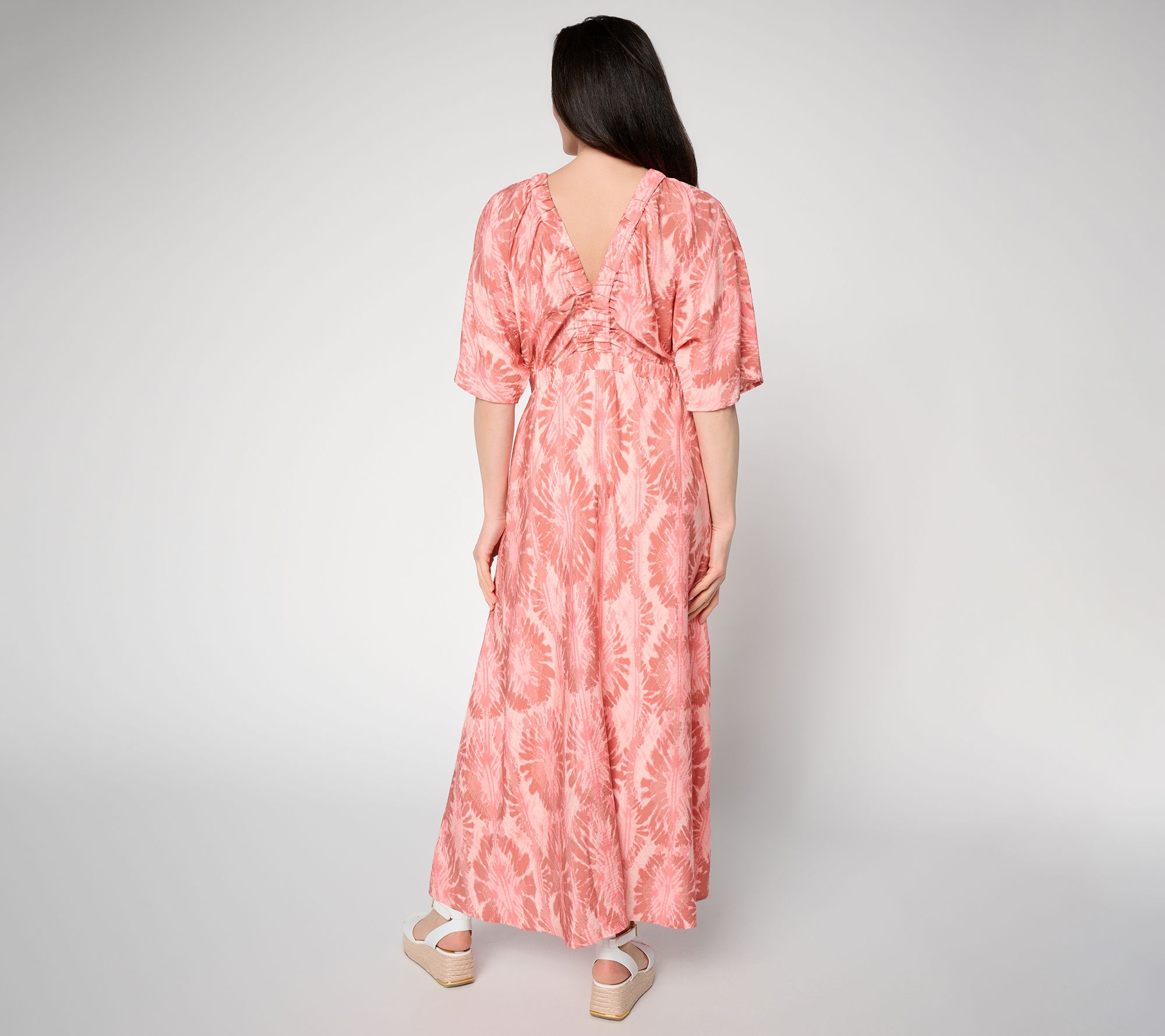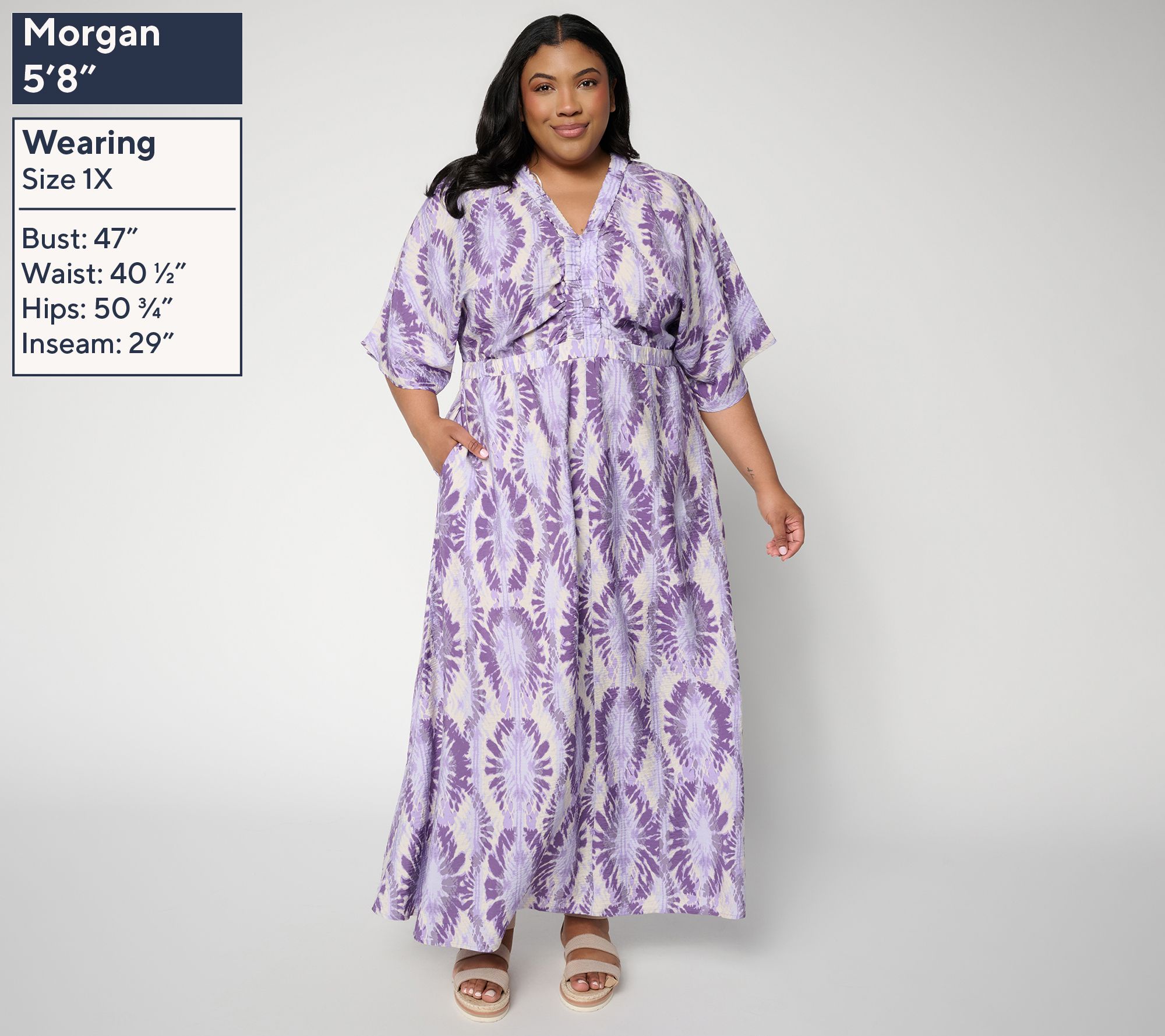 Features: maxi length, printed, elastic Y-neckline and waist seam, 3/4-length sleeves, hanger loop, on-seam pockets, front and back center skirt seam