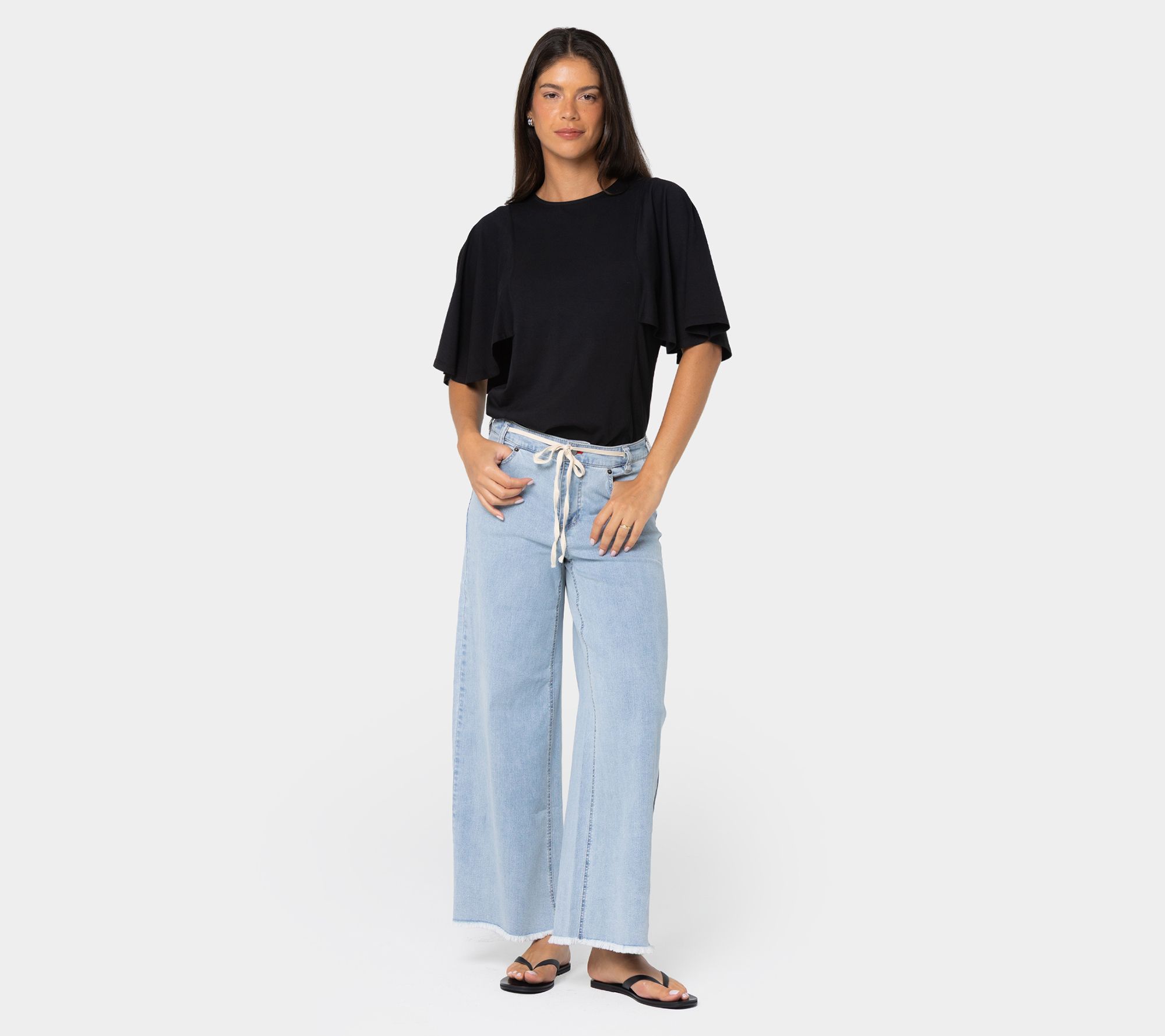 Bridging relaxed days and chic outings, these Peace Love World ankle jeans bring style and comfort together with their modern drawcord waist and raw edge fray. Soft stretch denim moves with you, while the wide leg silhouette and practical patch pockets add just the right touch for any casual adventure. From Peace Love World.