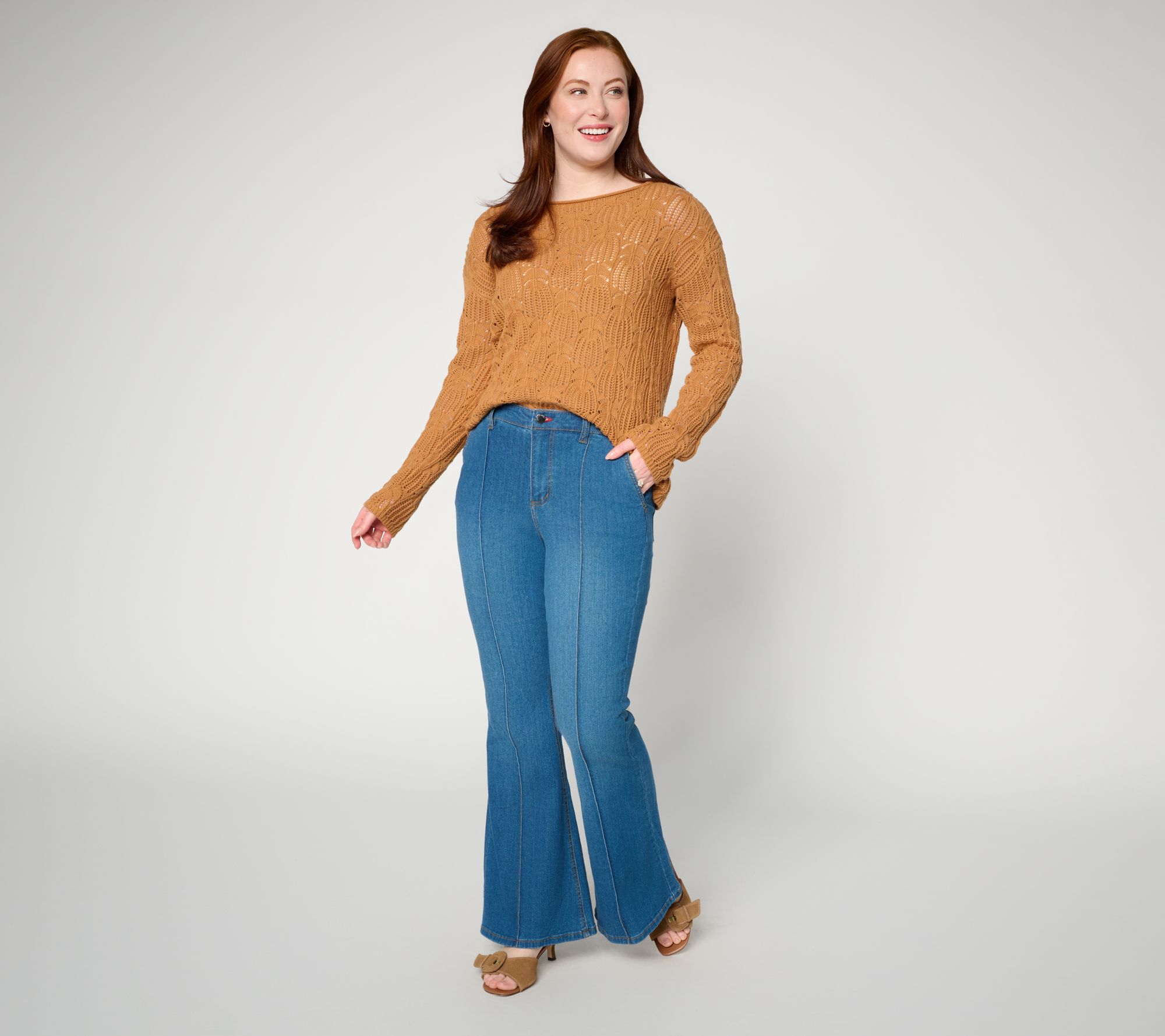 Catch up with friends you haven't seen in forever, weekend somewhere dreamy, or just do you around town -- these full-length flares are the jeans to make you feel like a million, no matter the date or destination. Pintuck details and a super-flattering contour waistband create a silhouette that wins with your favorite retro sneakers and a tee, heeled boots and a sweater, and everything in between. From Peace Love World.